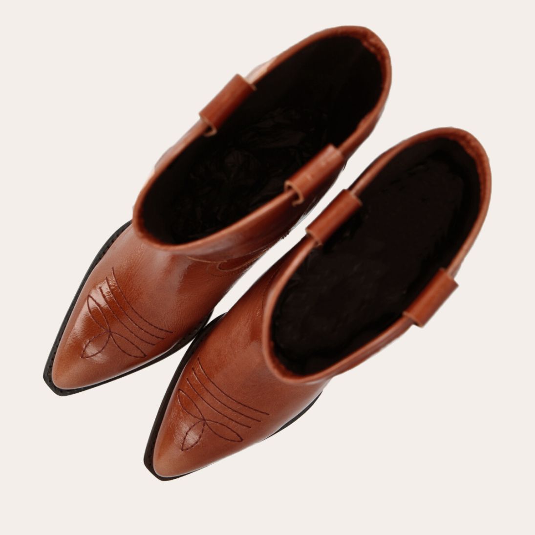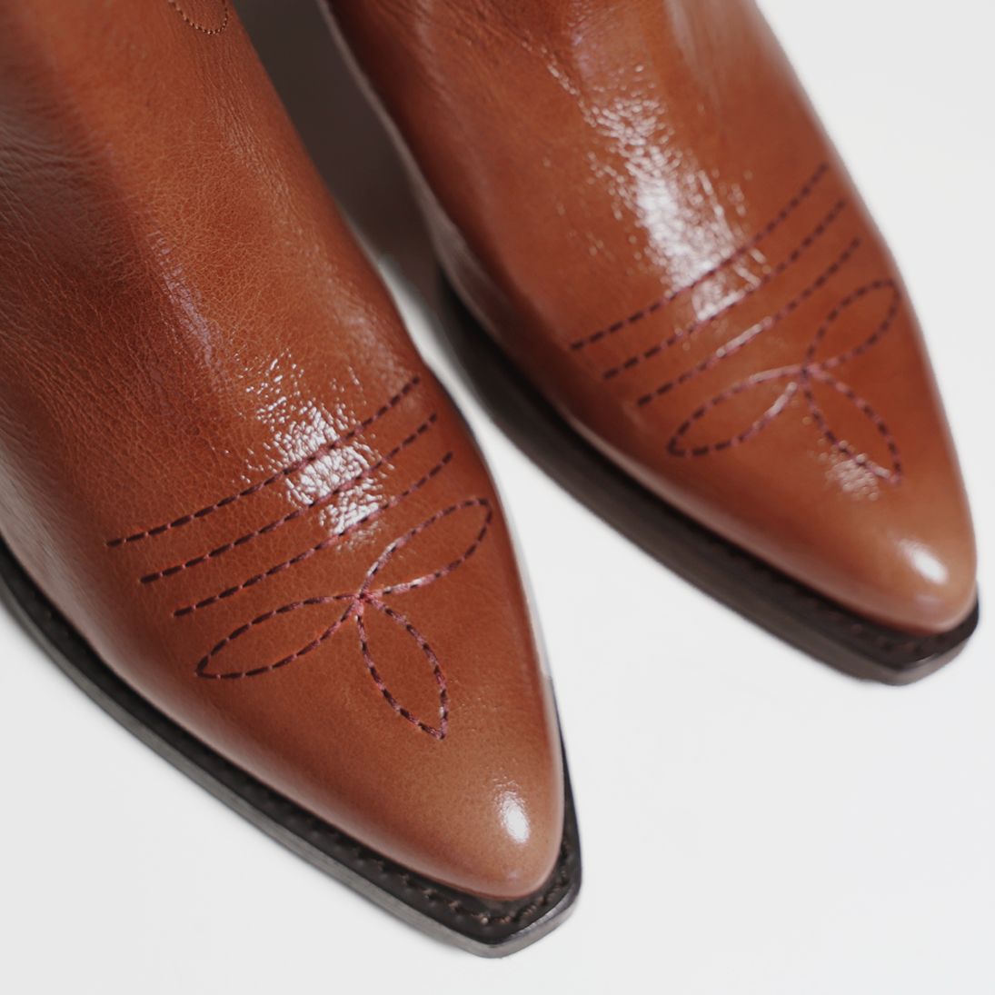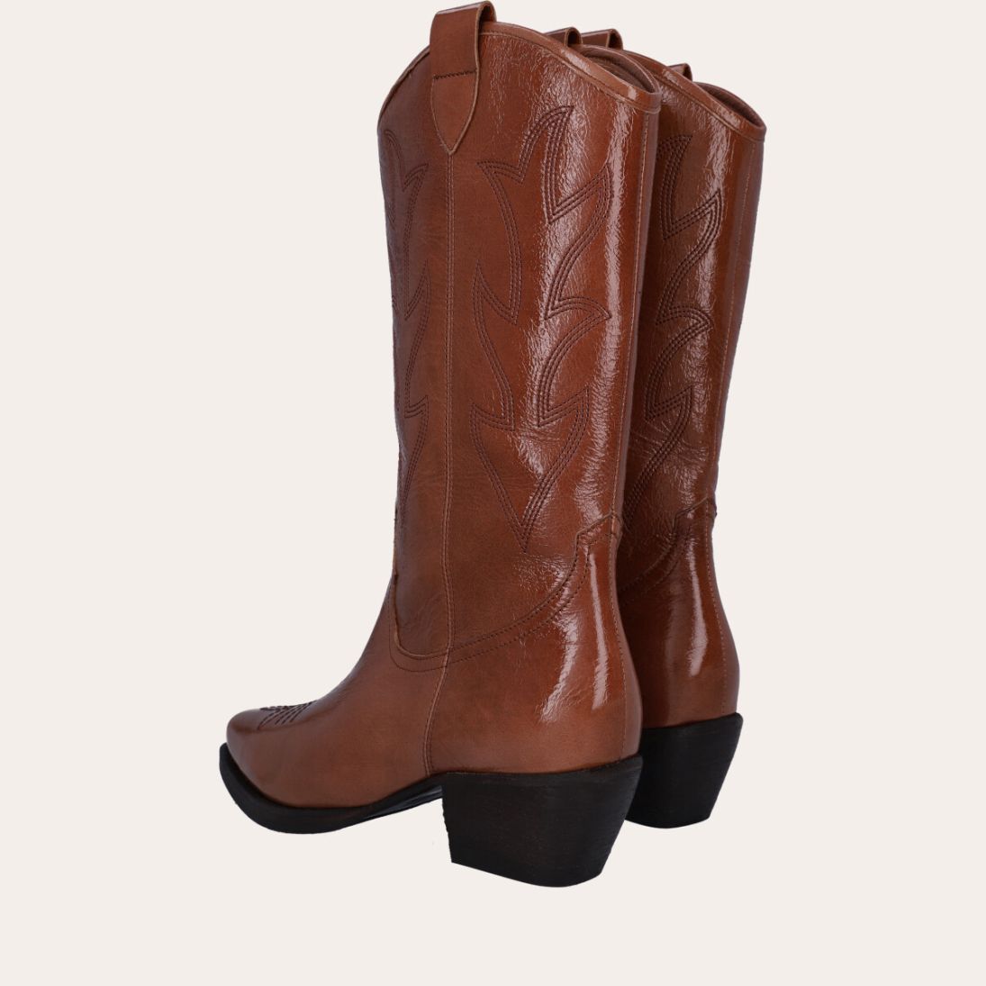 Støvlen er håndlavet i et flot shiny lakeret læder og er dekoreret med smukke flammeformede syninger, matchende stropper på skaftet, en spids snude, samt medium størrelse hæl.