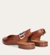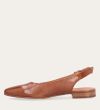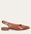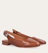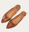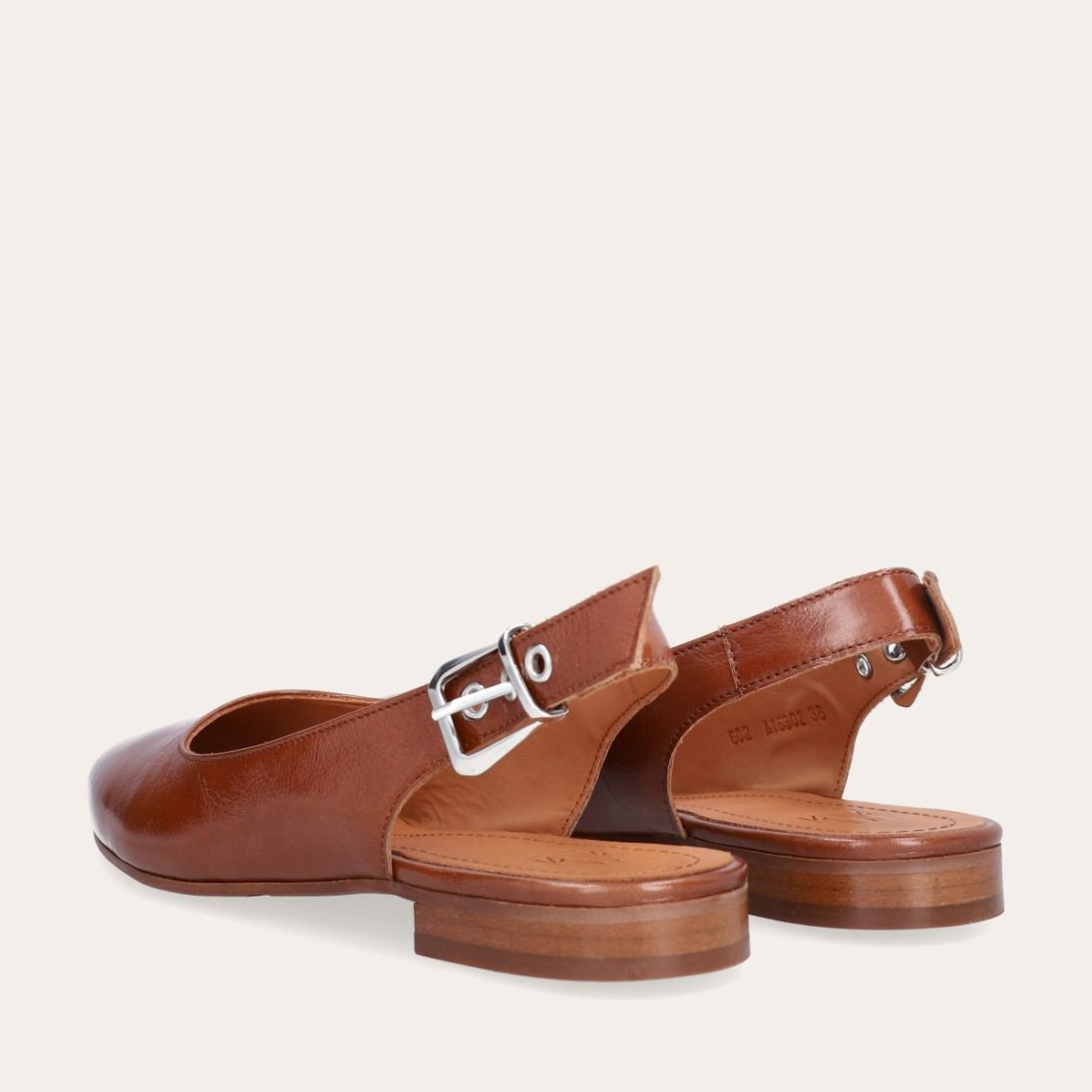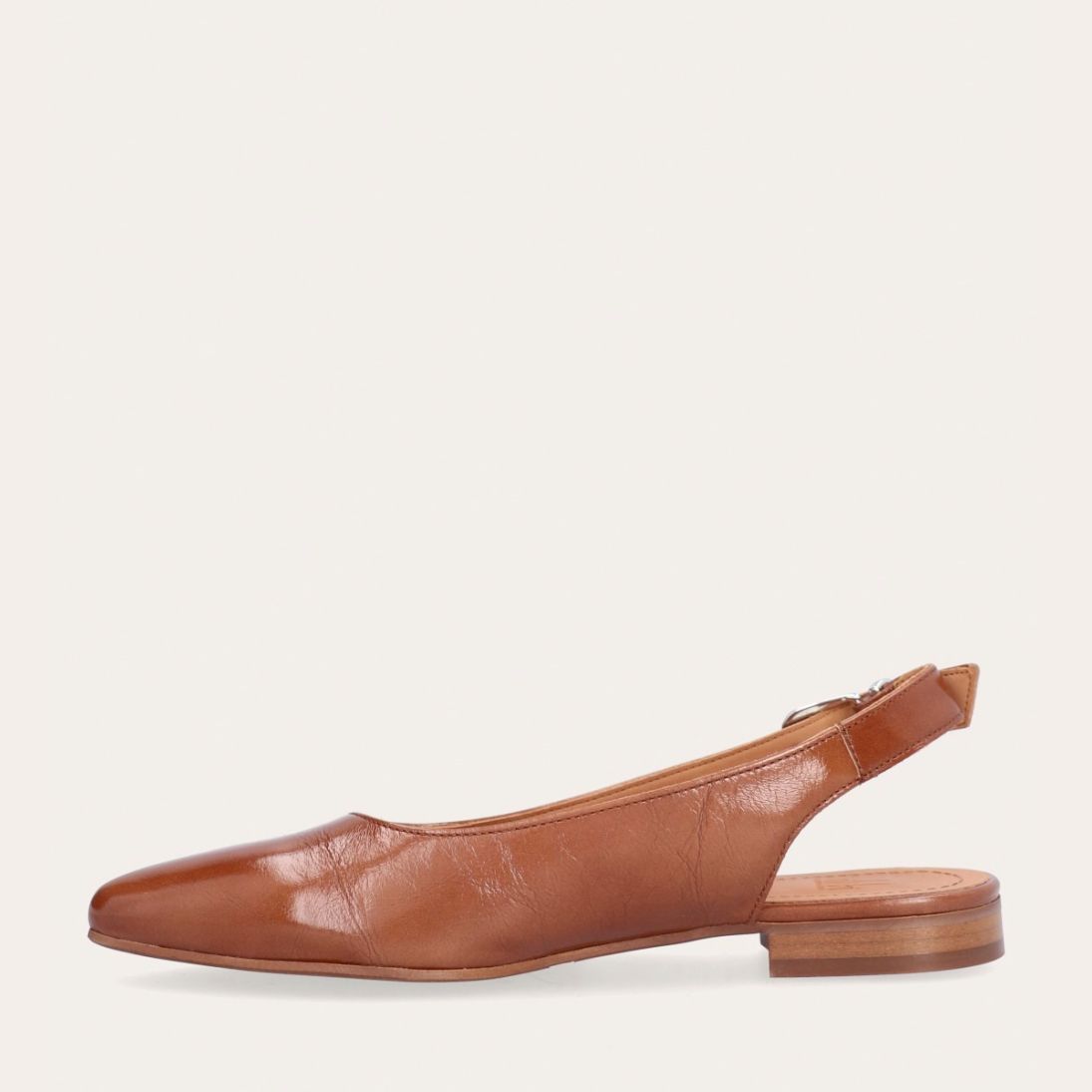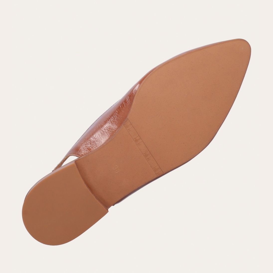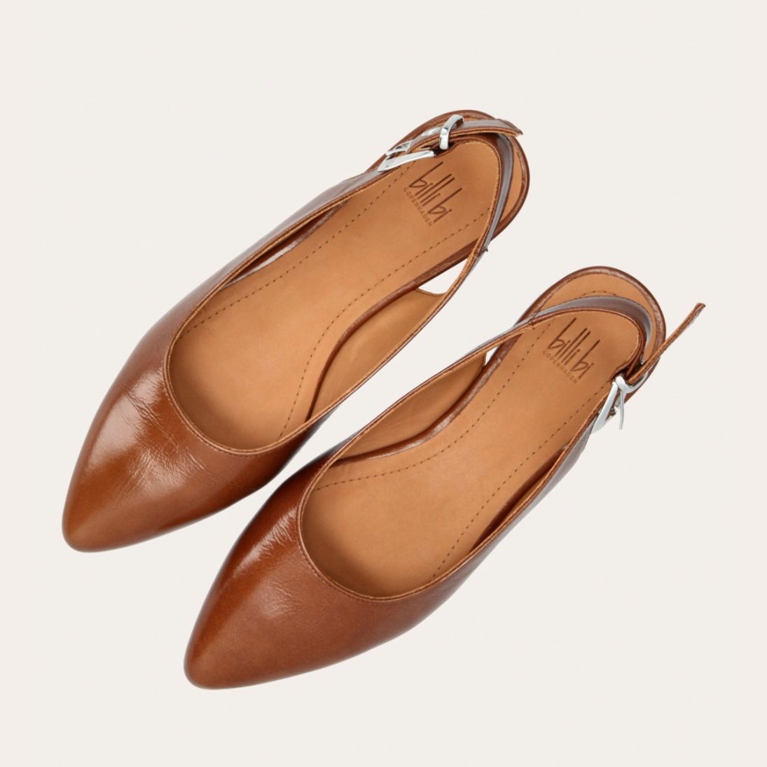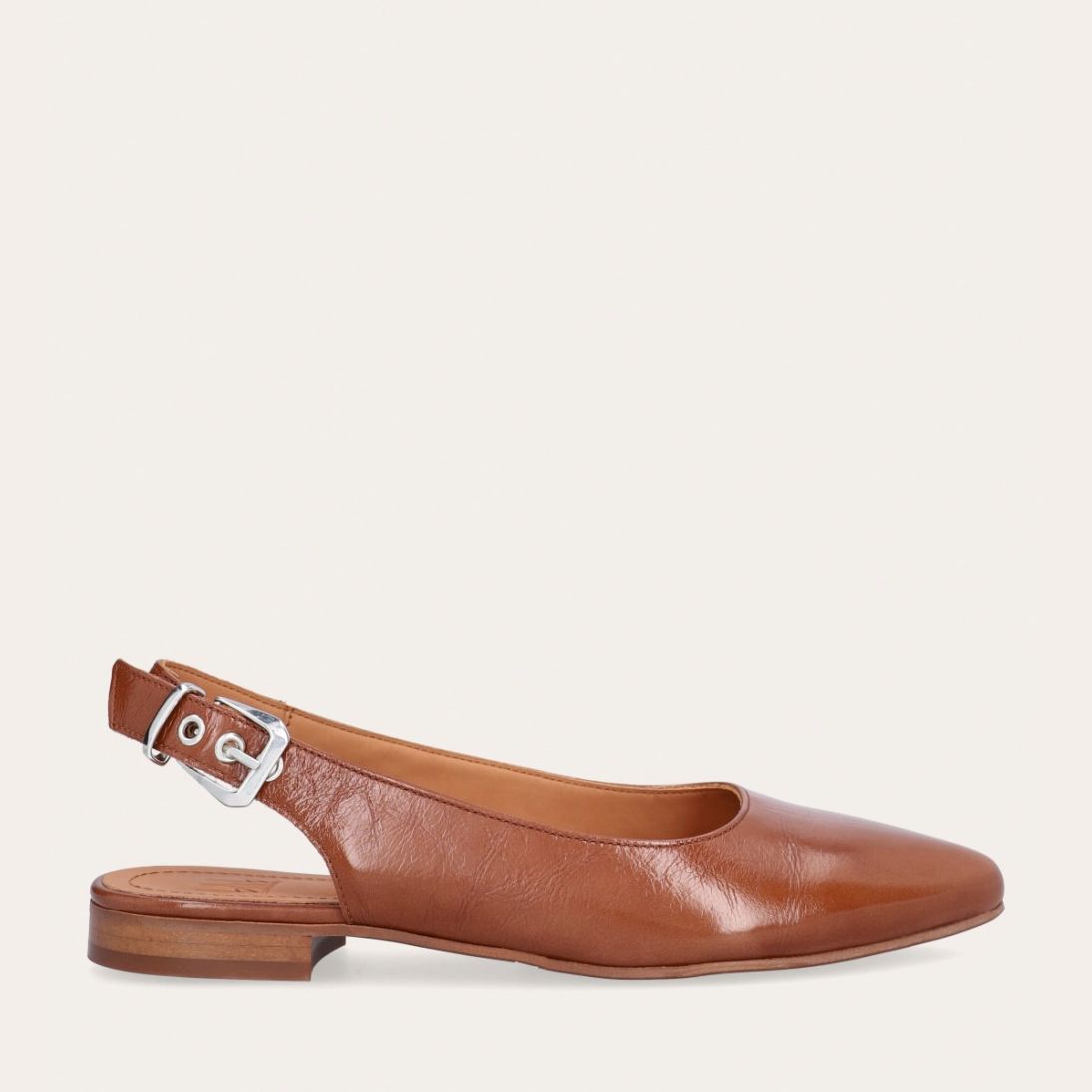 Håndlavet slingback ballerina med spids tå, udført i brunt lakeret skind. Slingback stroppen lukkes med et sølv-farvet spænde.