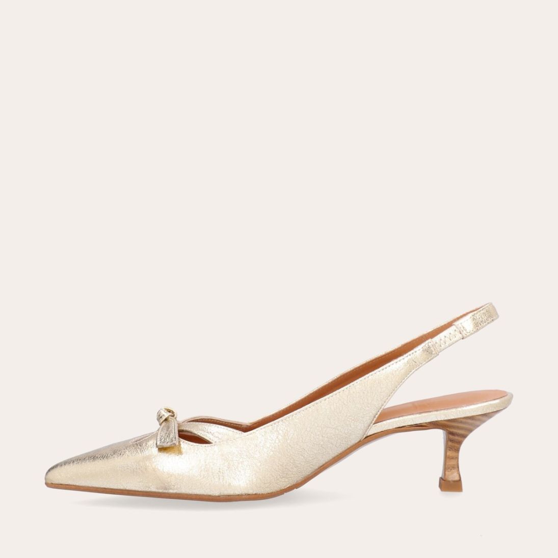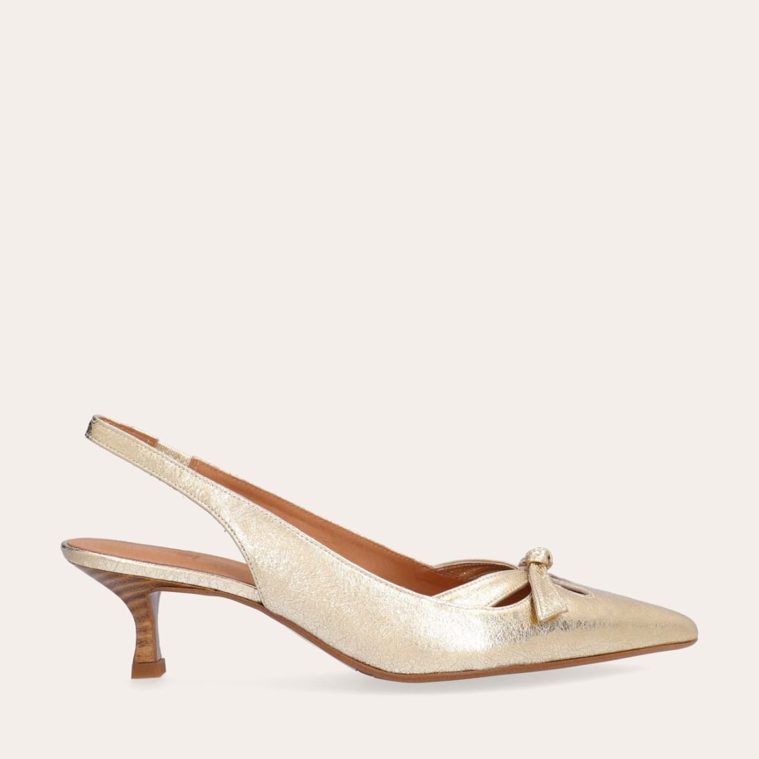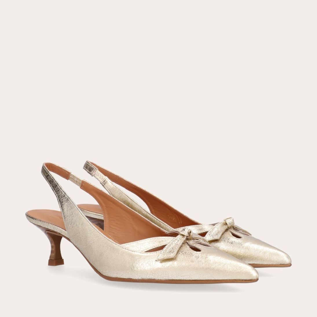 Håndlavet slingback pump, udført i guldfarvet glat skind med spids tå. Pumpen har et elegant formet forstykke med diskrete udskæringer for et feminint udtryk. Designet med en kitten heel for en raffineret finish.
