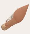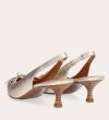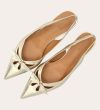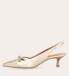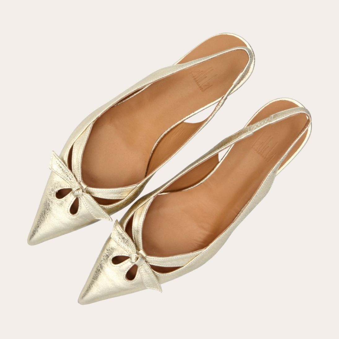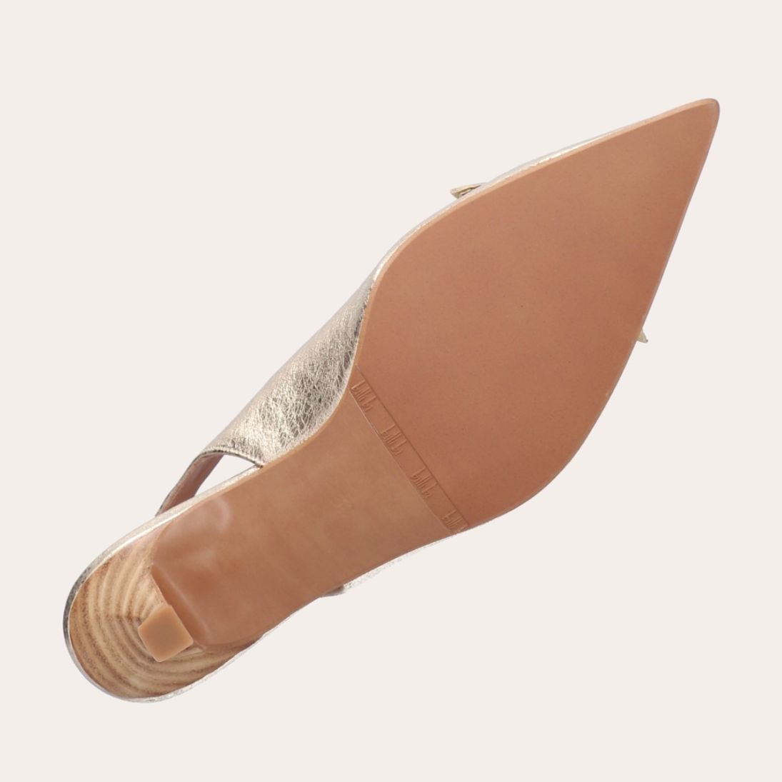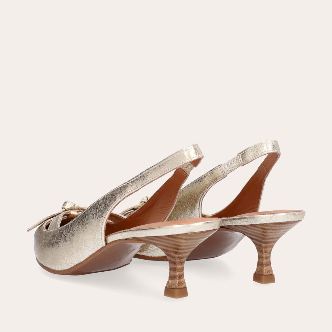 Håndlavet slingback pump, udført i guldfarvet glat skind med spids tå. Pumpen har et elegant formet forstykke med diskrete udskæringer for et feminint udtryk. Designet med en kitten heel for en raffineret finish.