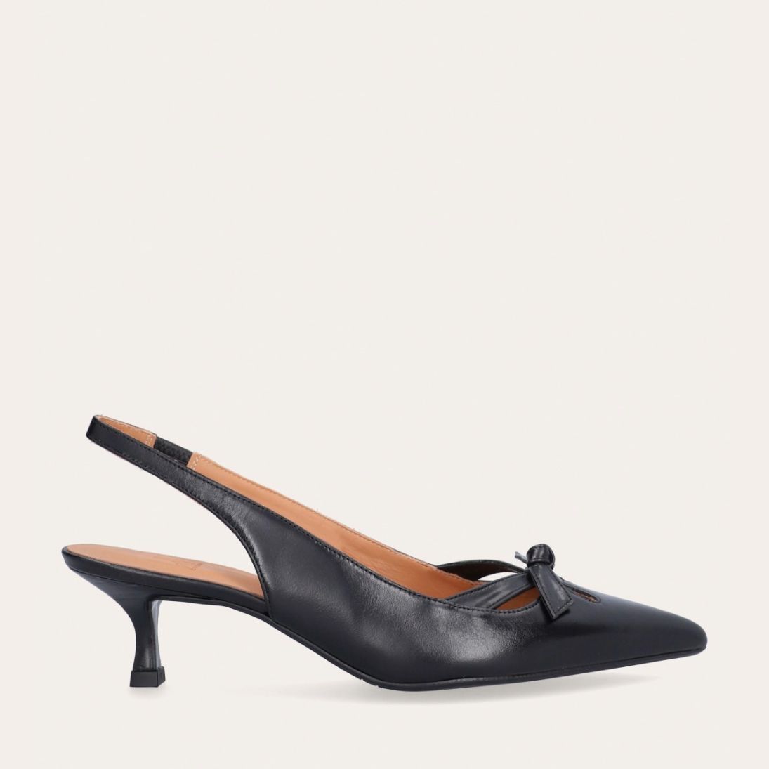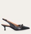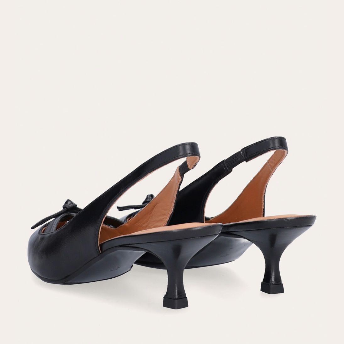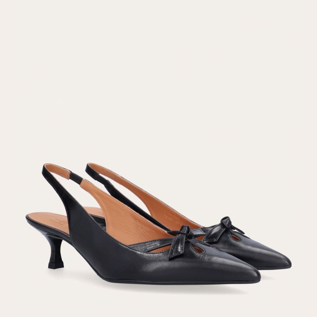 Håndlavet slingback pump, udført i sort glat skind med spids tå. Pumpen har et elegant formet forstykke med diskrete udskæringer for et feminint udtryk. Designet med en kitten heel for en raffineret finish.