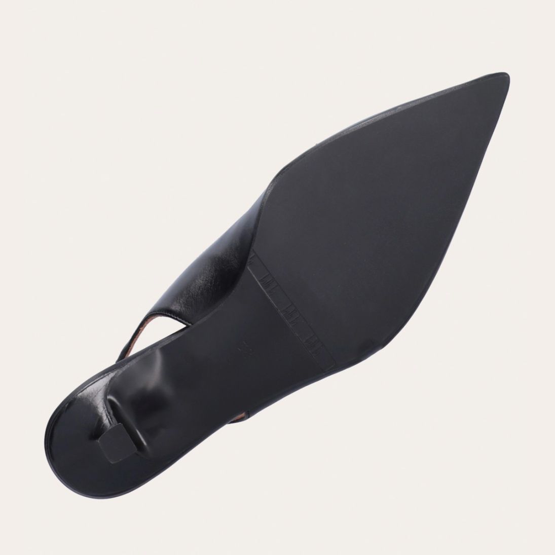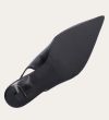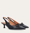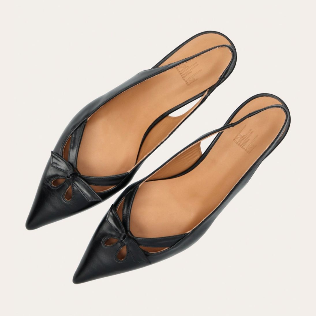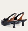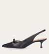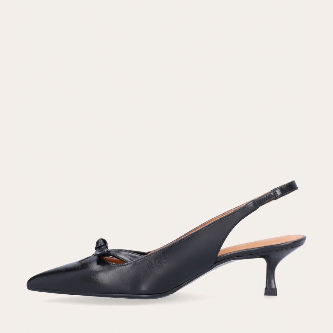 Håndlavet slingback pump, udført i sort glat skind med spids tå. Pumpen har et elegant formet forstykke med diskrete udskæringer for et feminint udtryk. Designet med en kitten heel for en raffineret finish.