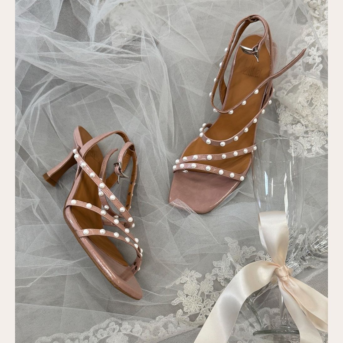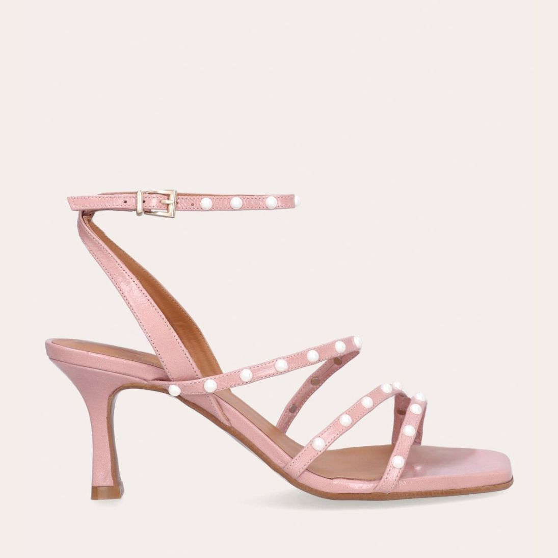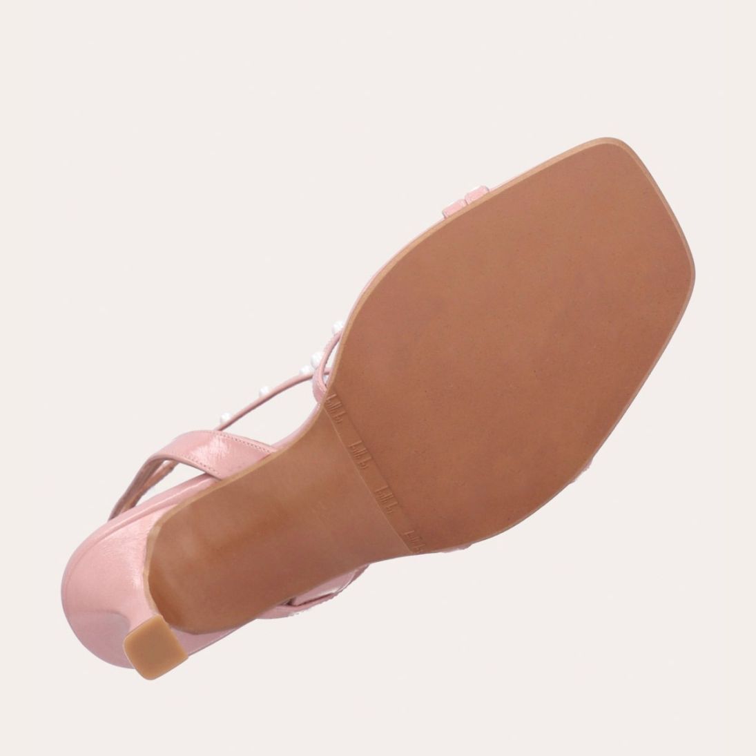 Håndlavet sandal, udført i lyserødt lakeret skind med en firkantet tå. Sandalen har tynde remme der krydser forfoden med smukke perle detaljer, og en justerbar ankelrem som lukkes med et gyldent spænde.