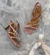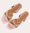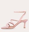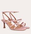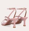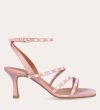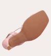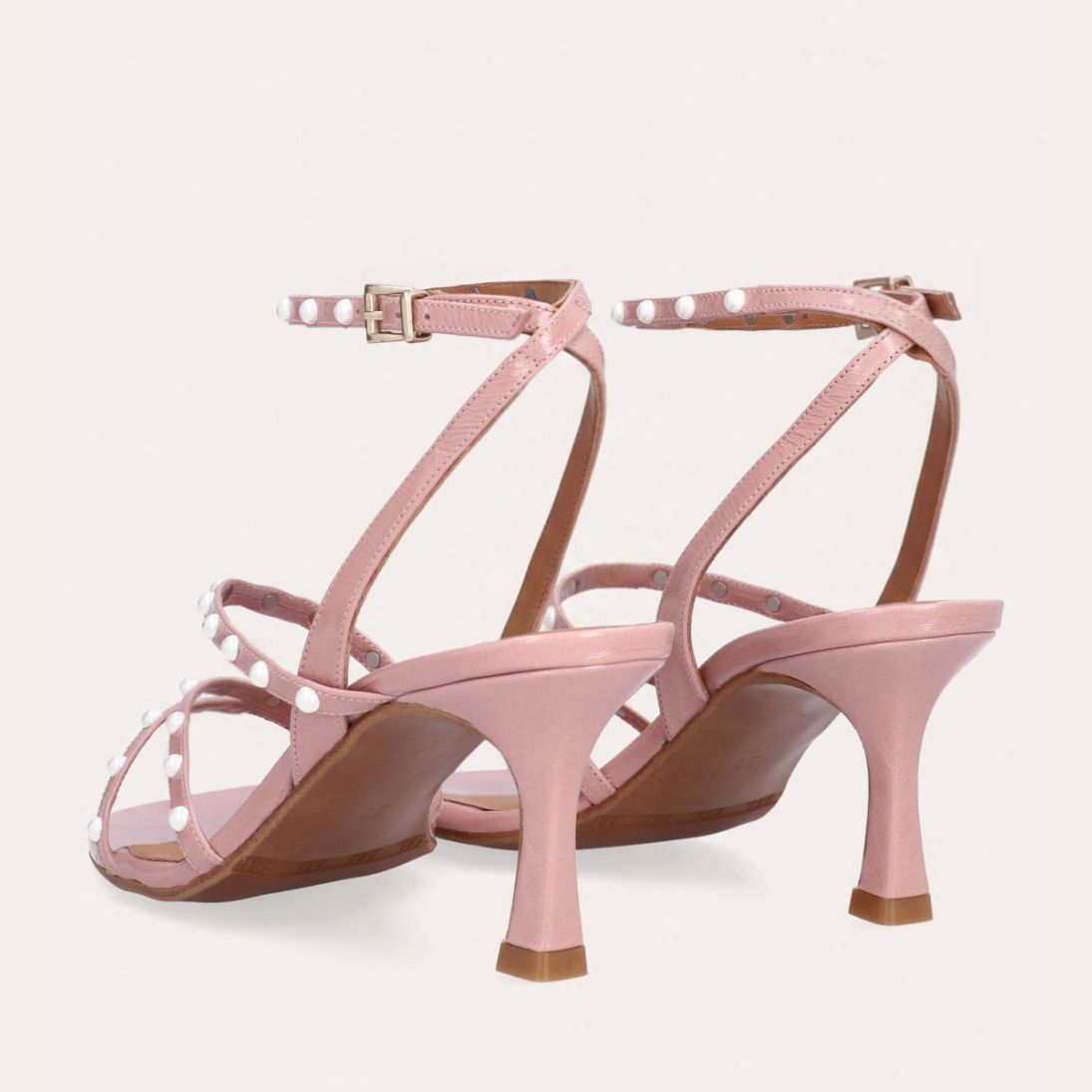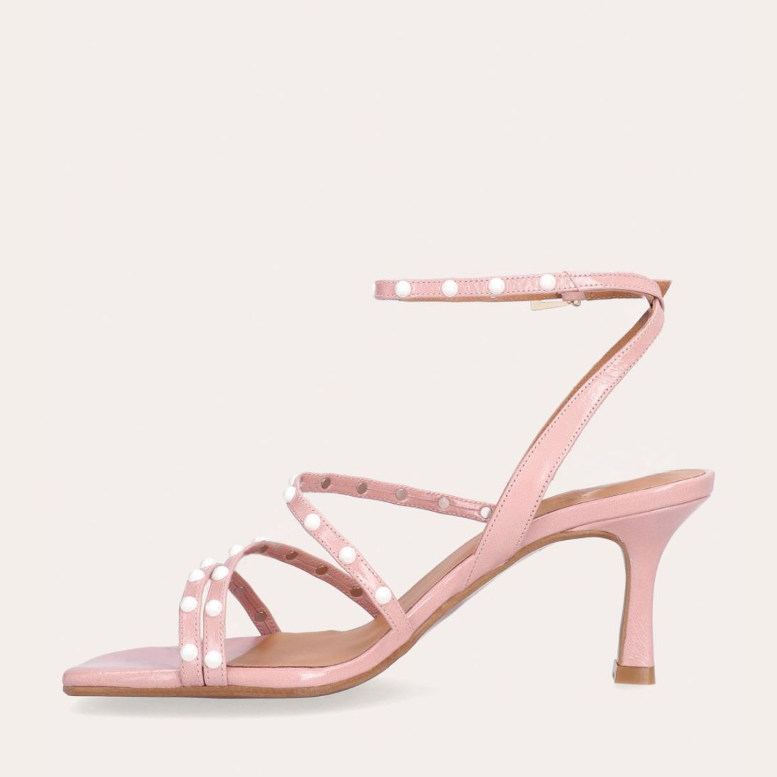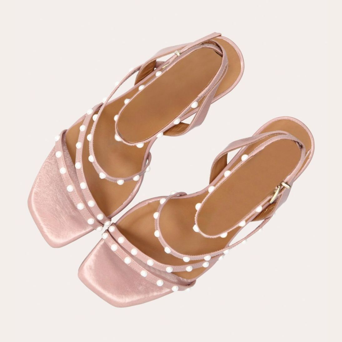 Håndlavet sandal, udført i lyserødt lakeret skind med en firkantet tå. Sandalen har tynde remme der krydser forfoden med smukke perle detaljer, og en justerbar ankelrem som lukkes med et gyldent spænde.