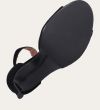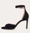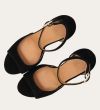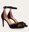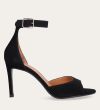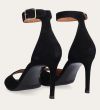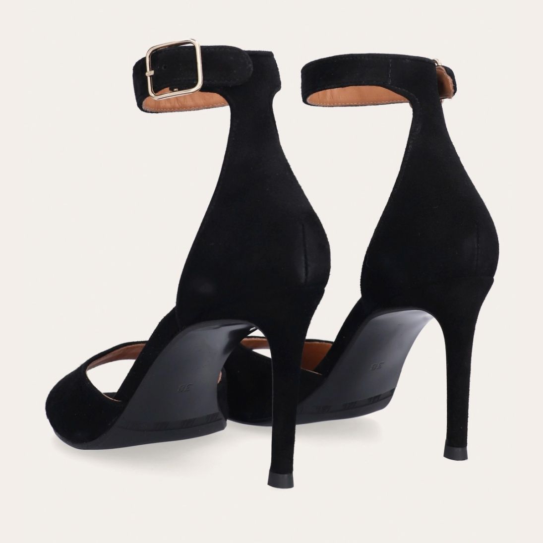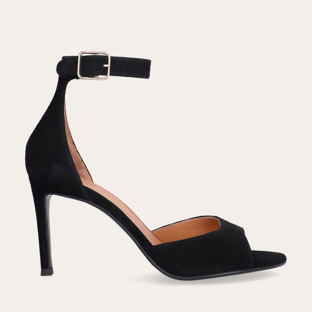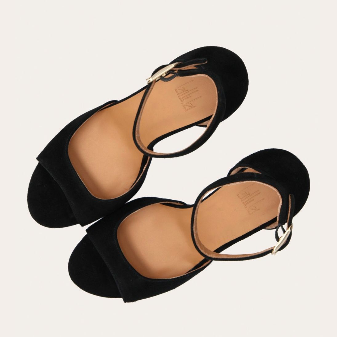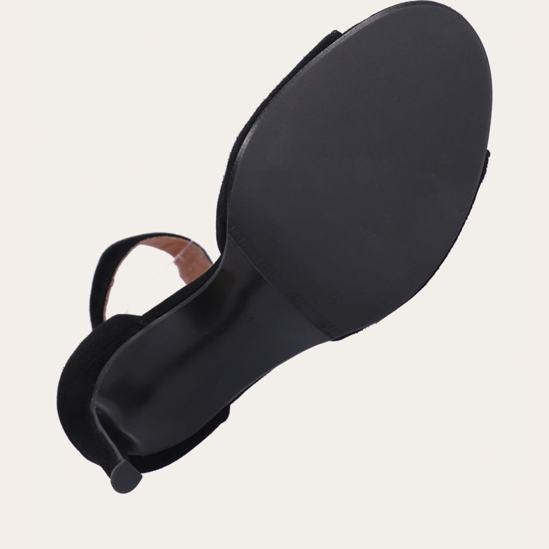 Håndlavet sandal med hæl udført i sort ruskind med rund tå. Sandalen har en justerbar ankelrem med lukning med et gyldent spænde.