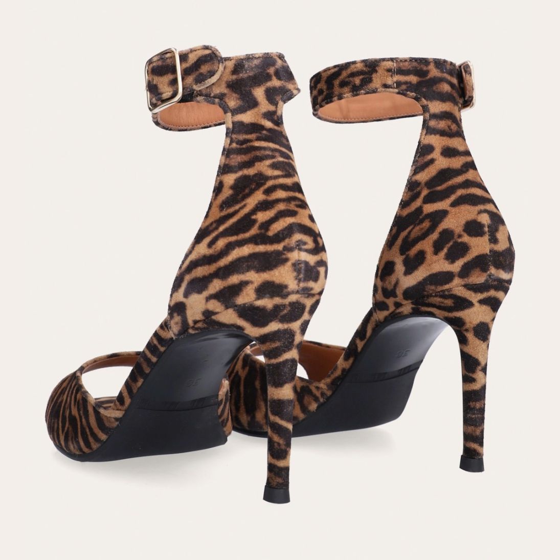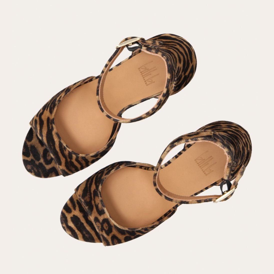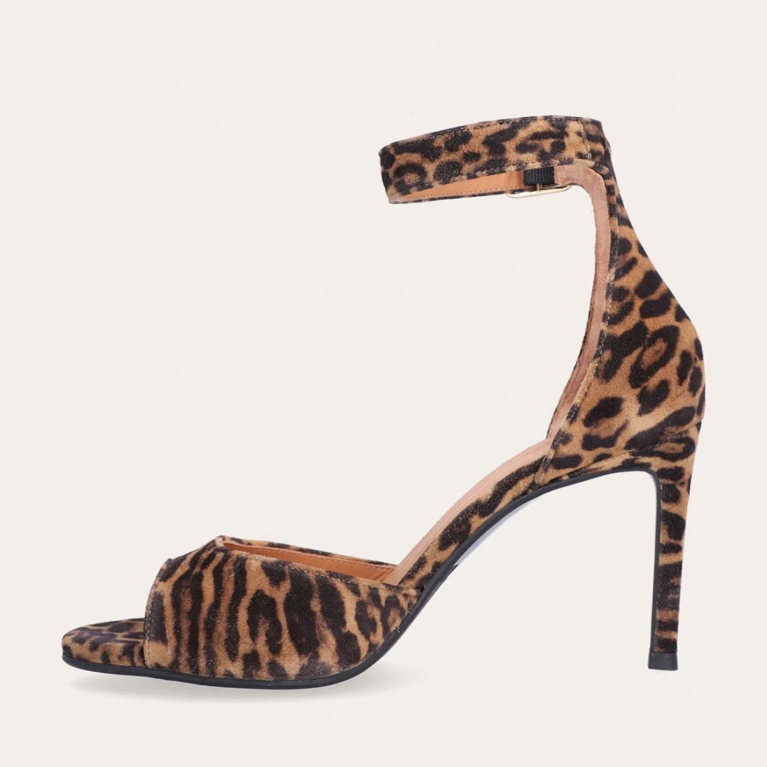 Håndlavet sandal med hæl udført i ruskind med leopard mønster og en rund tå. Sandalen har en justerbar ankelrem med lukning med et gyldent spænde.