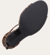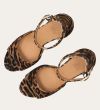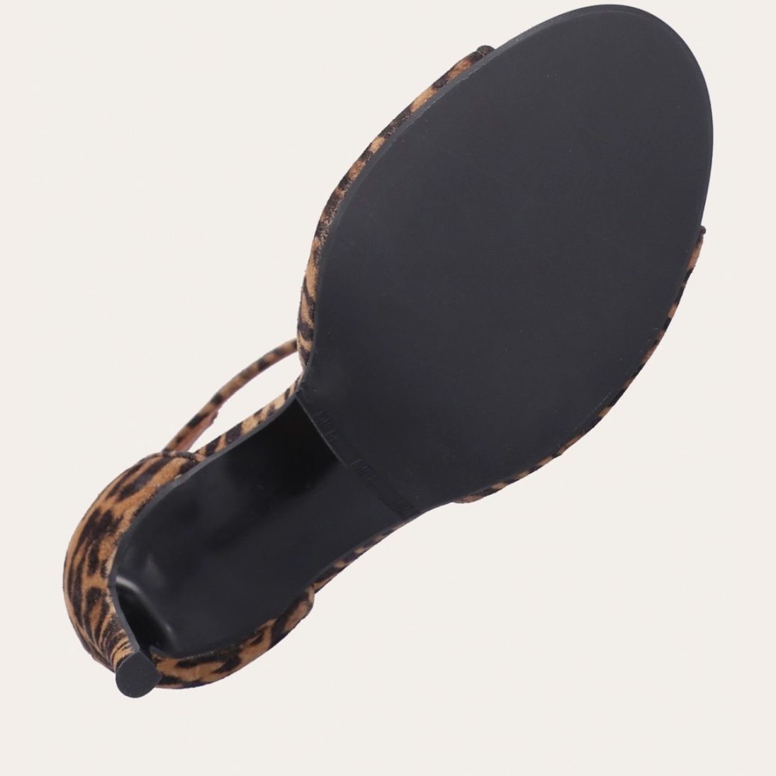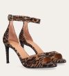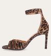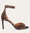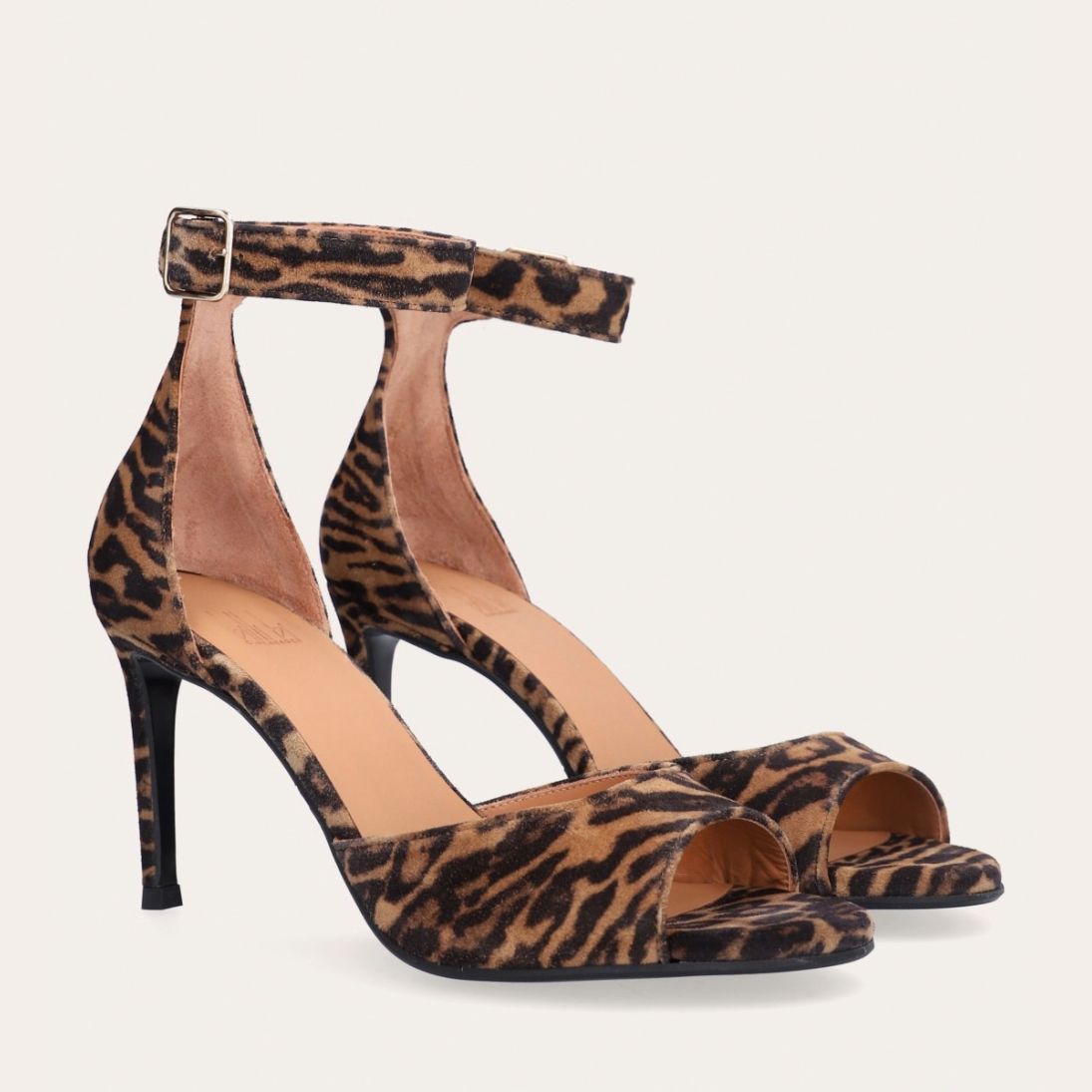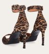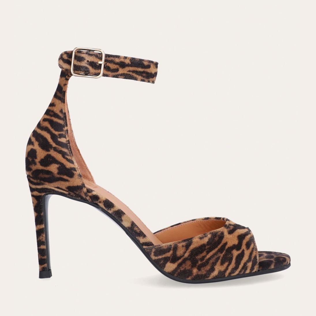 Håndlavet sandal med hæl udført i ruskind med leopard mønster og en rund tå. Sandalen har en justerbar ankelrem med lukning med et gyldent spænde.