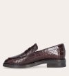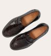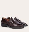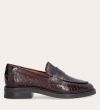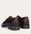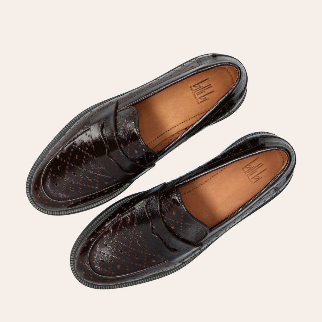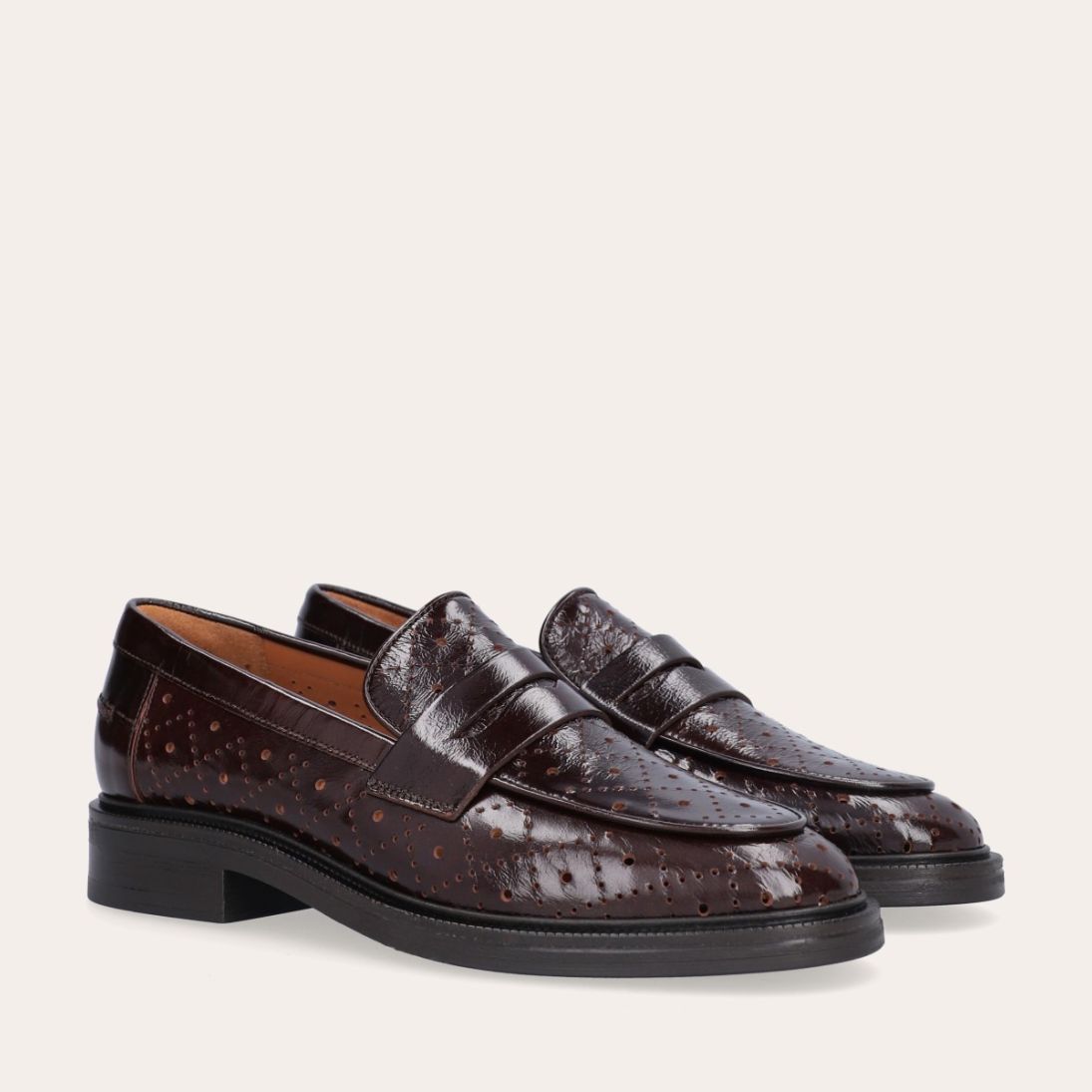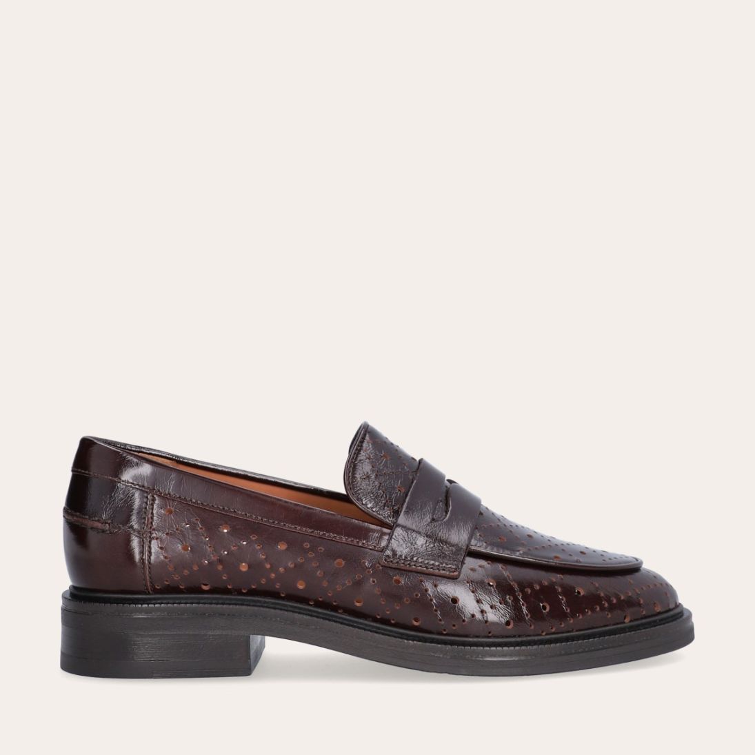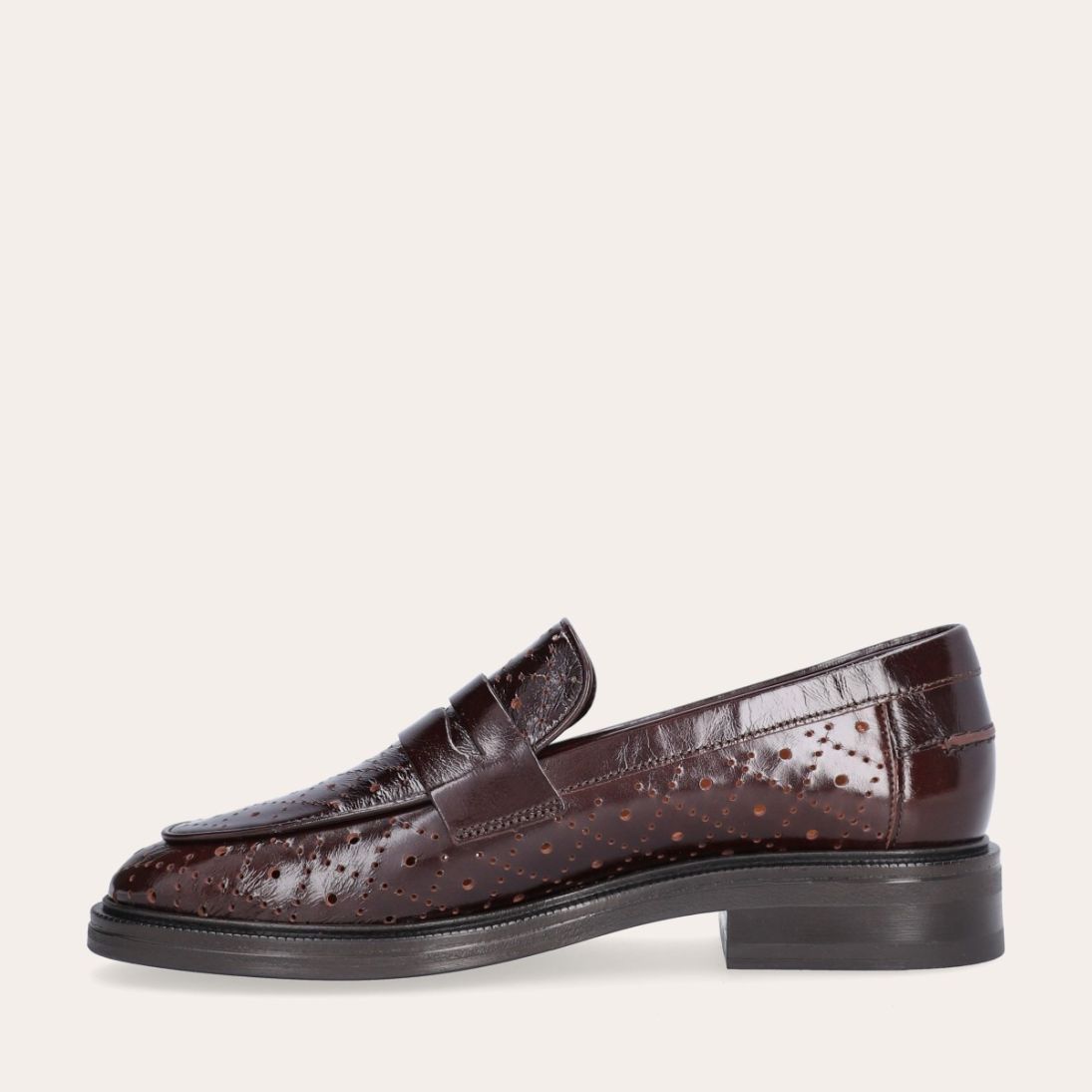 Håndlavet loafer udført i mørkebrunt lakeret skind med et perforeret mønster og en rund tå. Loaferen er dekoreret med et cut-out foran og stikninger på hælen.