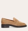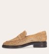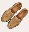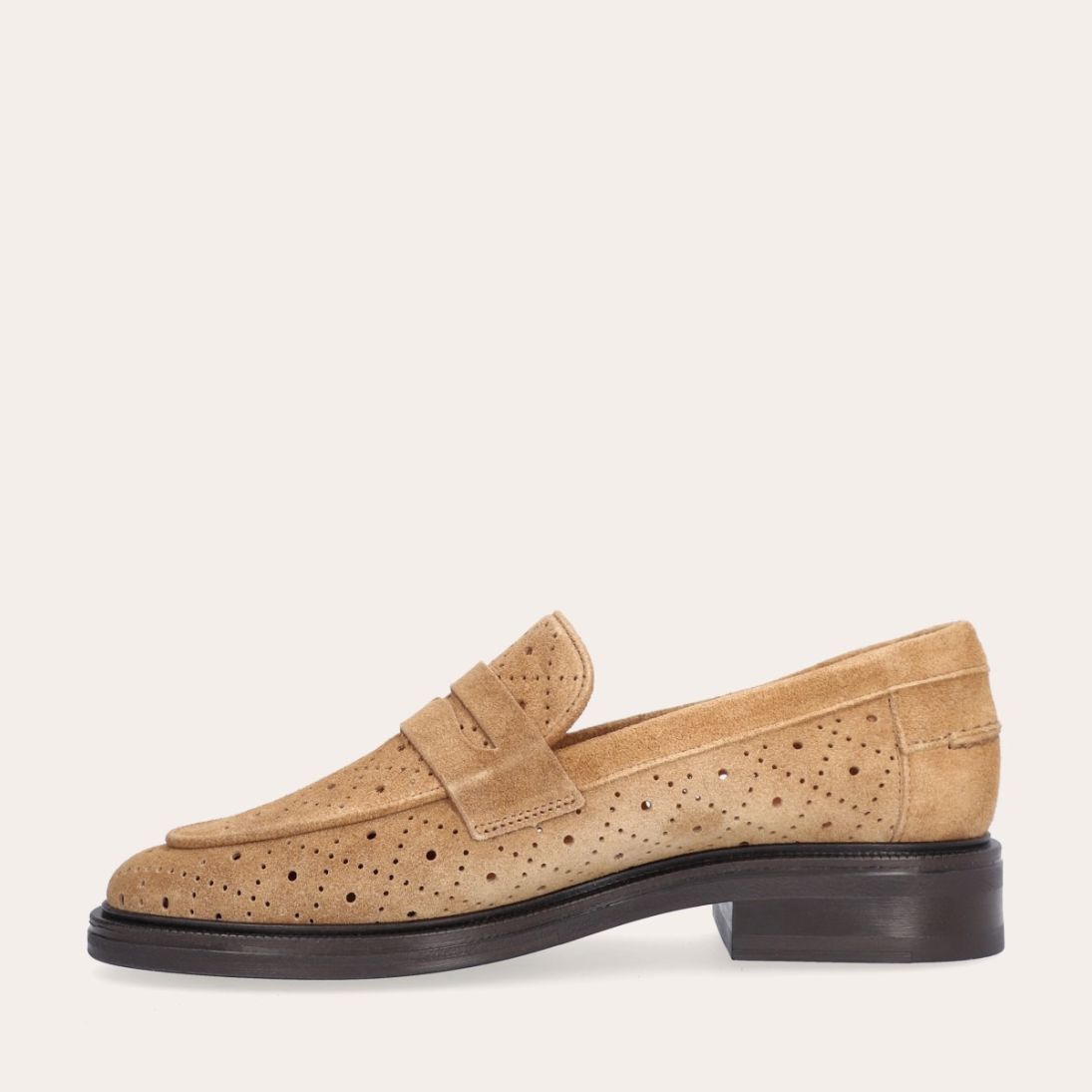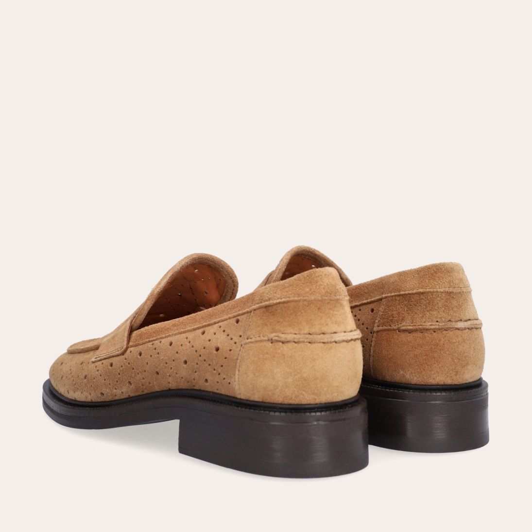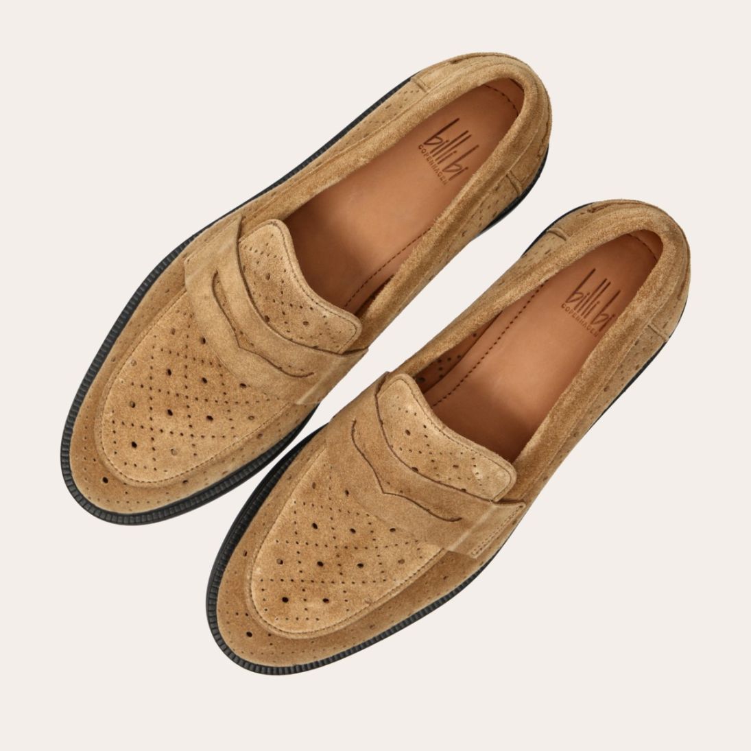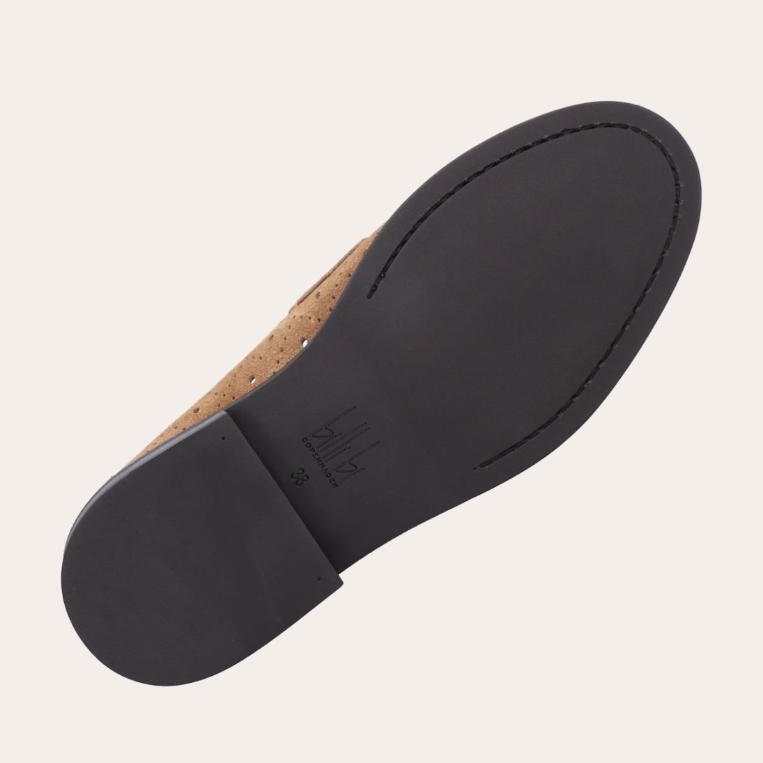 Håndlavet loafer udført i beige ruskind med et perforeret mønster og en rund tå. Loaferen er dekoreret med et cut-out foran og stikninger på hælen.