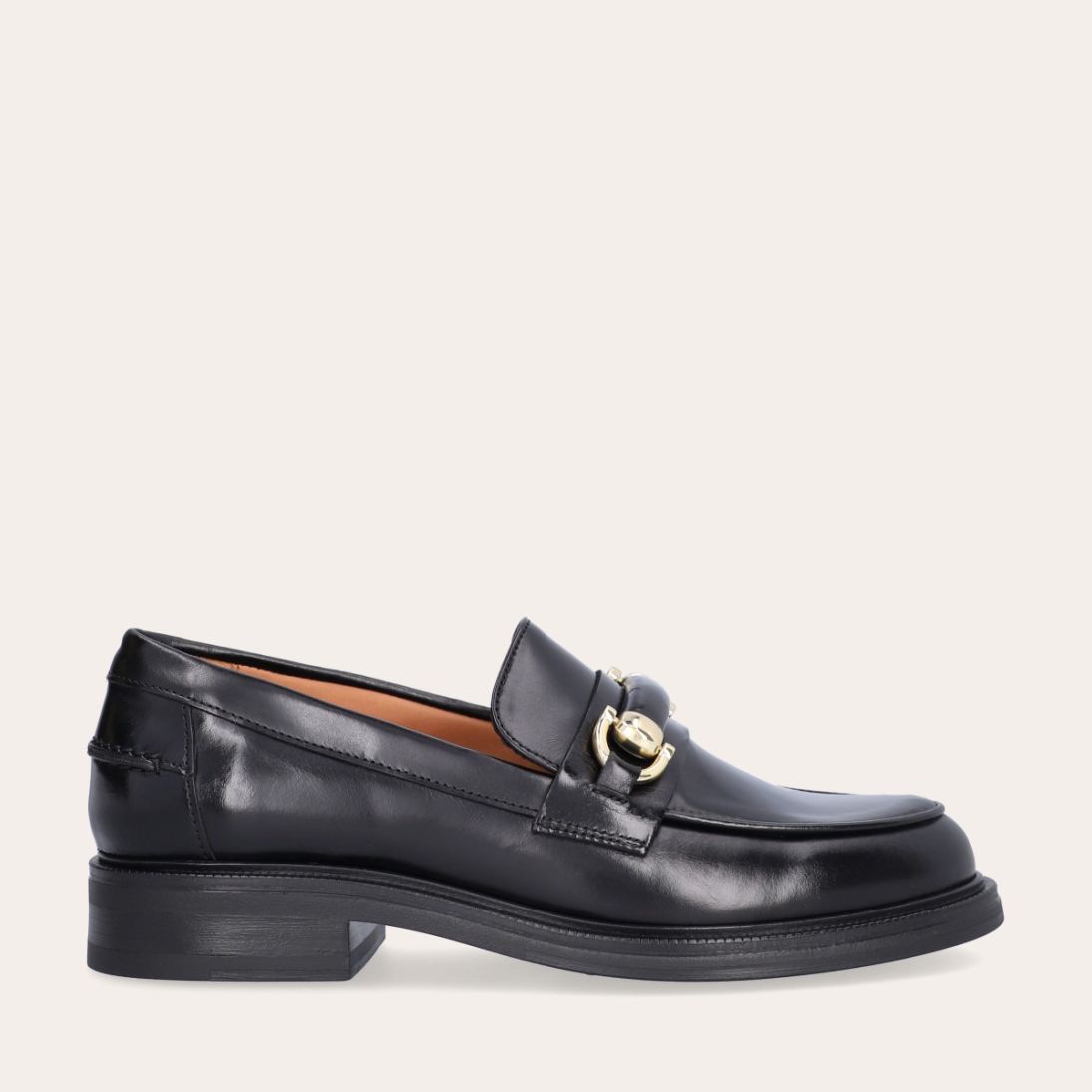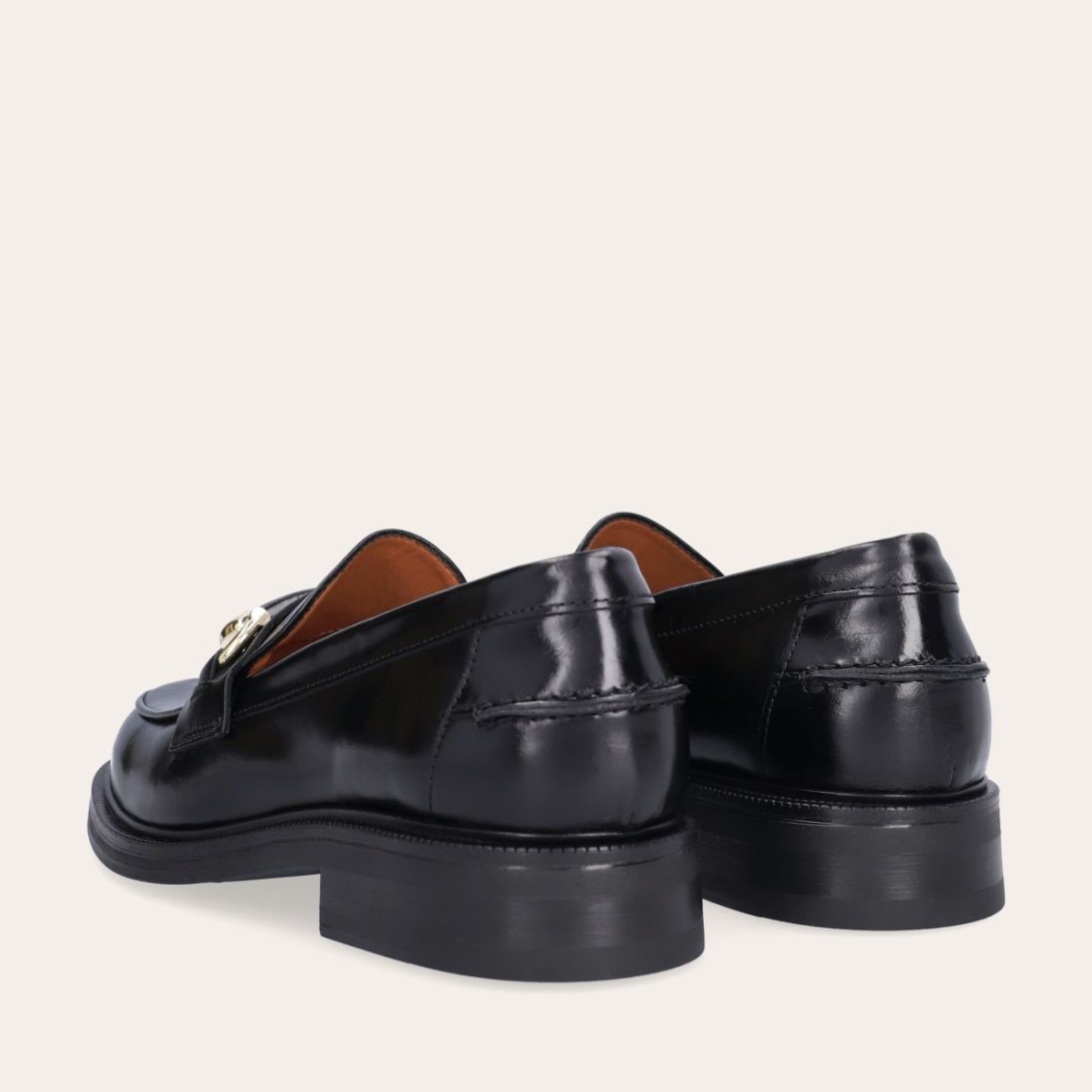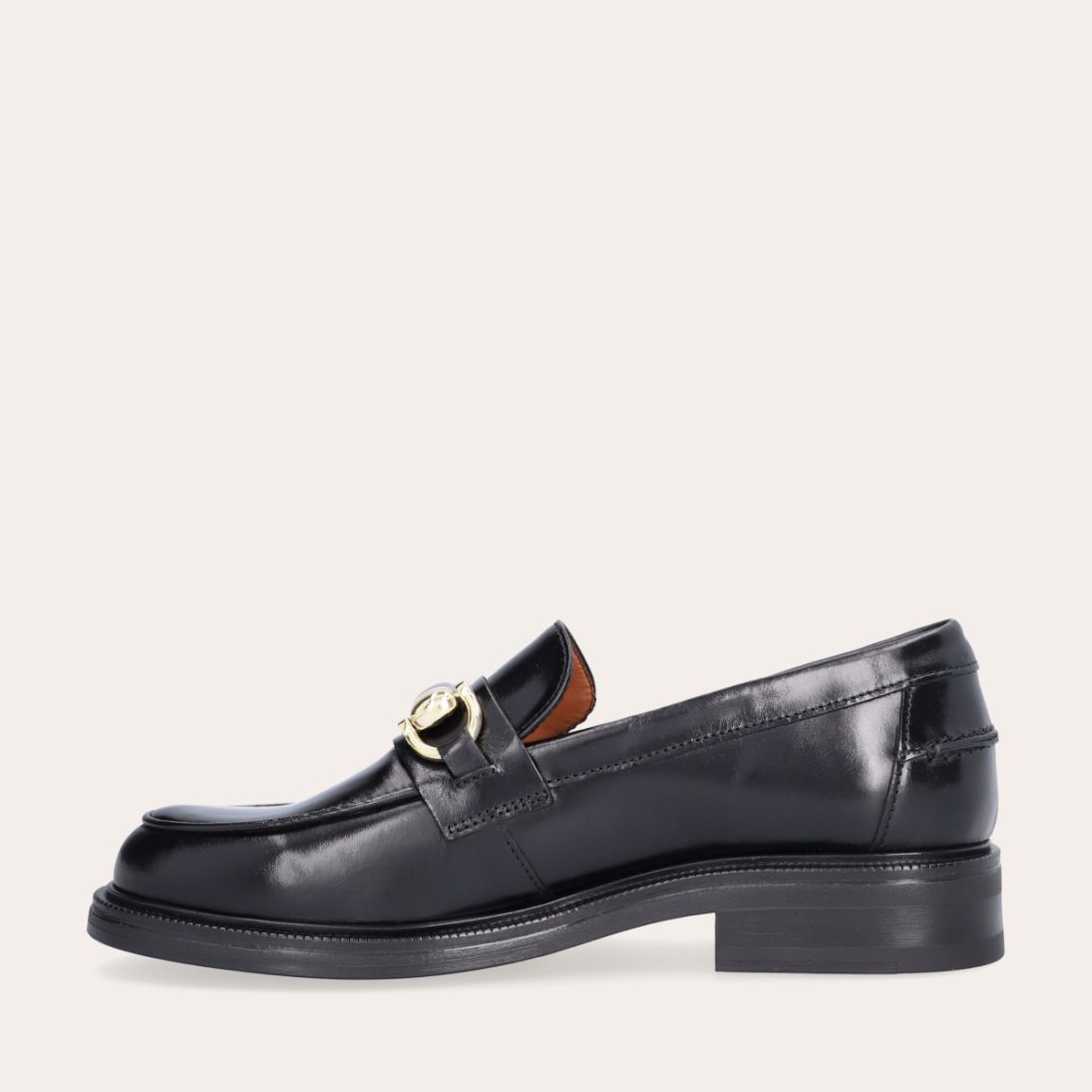 Håndlavet loafer, udført i sort glat skind med rund tå. Loaferen er dekoreret med en skindstrop med gyldne spænder på forfoden samt piping foran og bagpå.