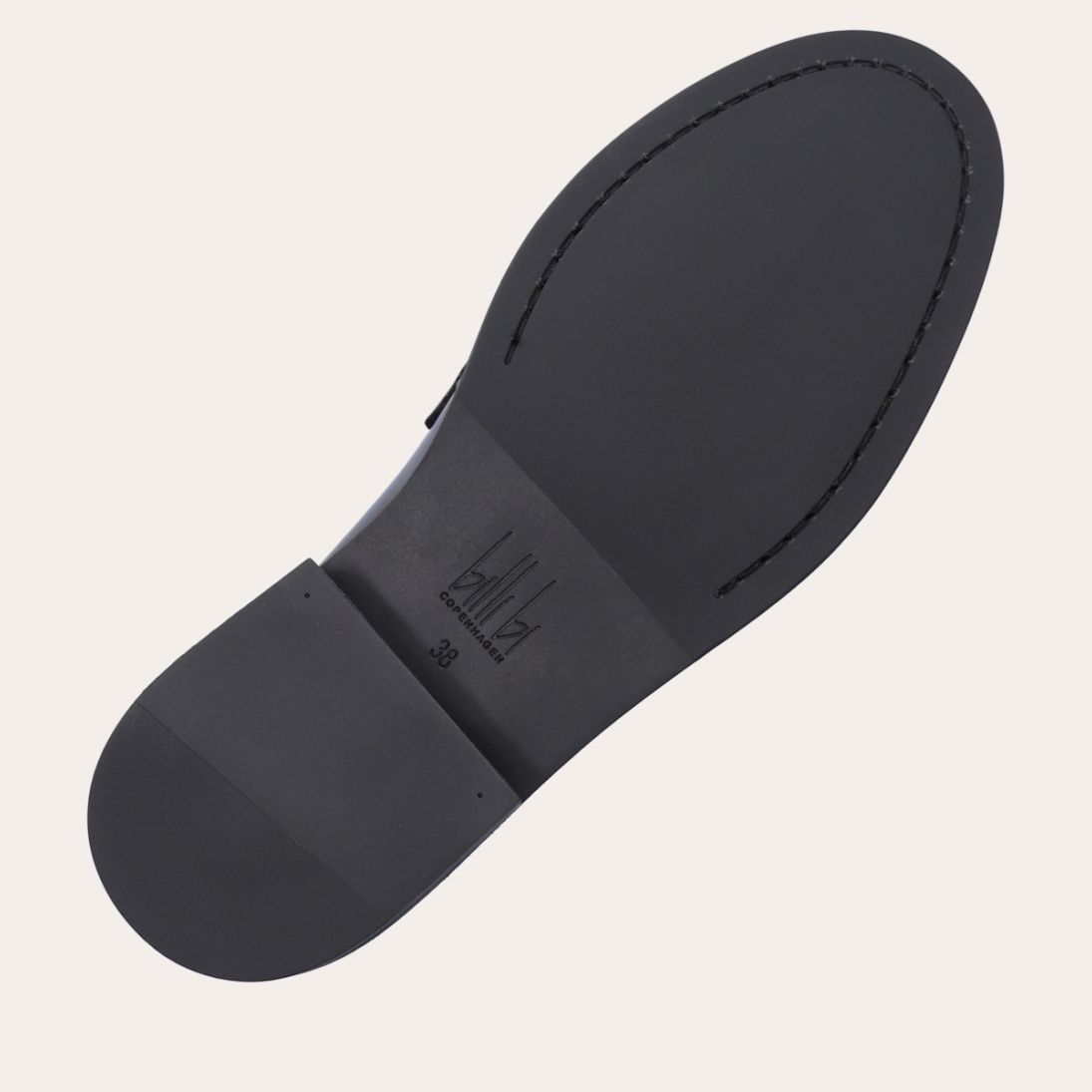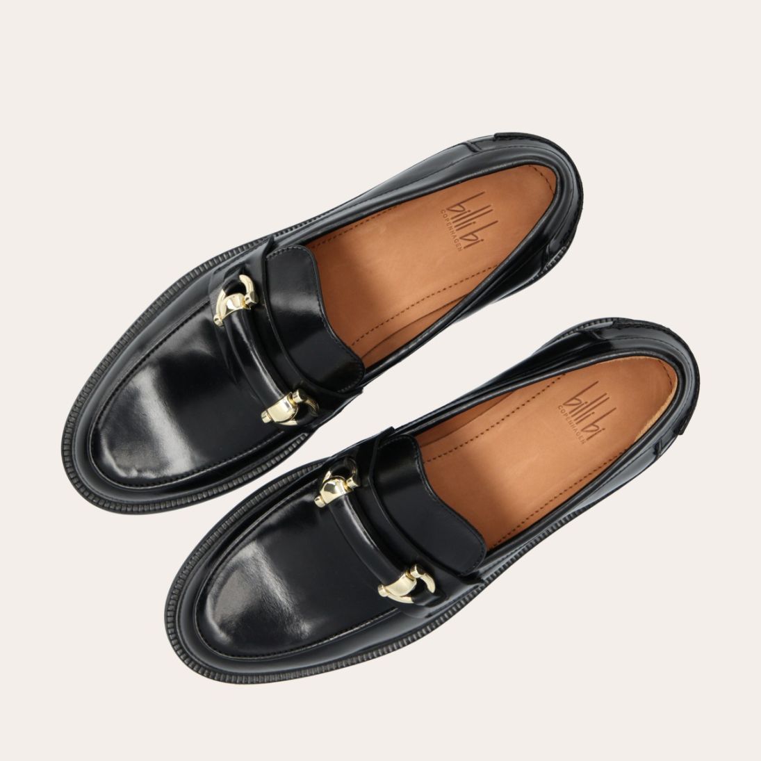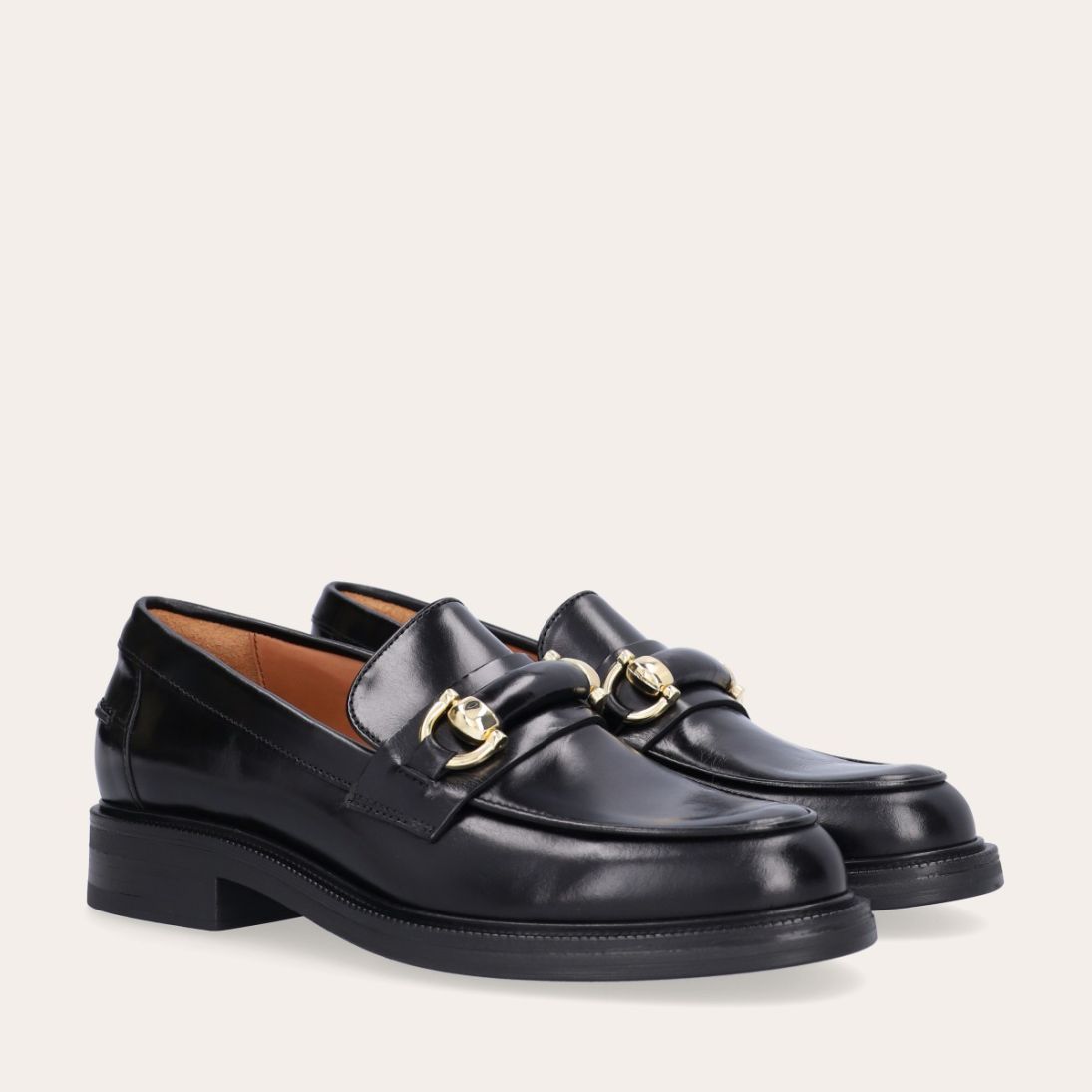 Håndlavet loafer, udført i sort glat skind med rund tå. Loaferen er dekoreret med en skindstrop med gyldne spænder på forfoden samt piping foran og bagpå.