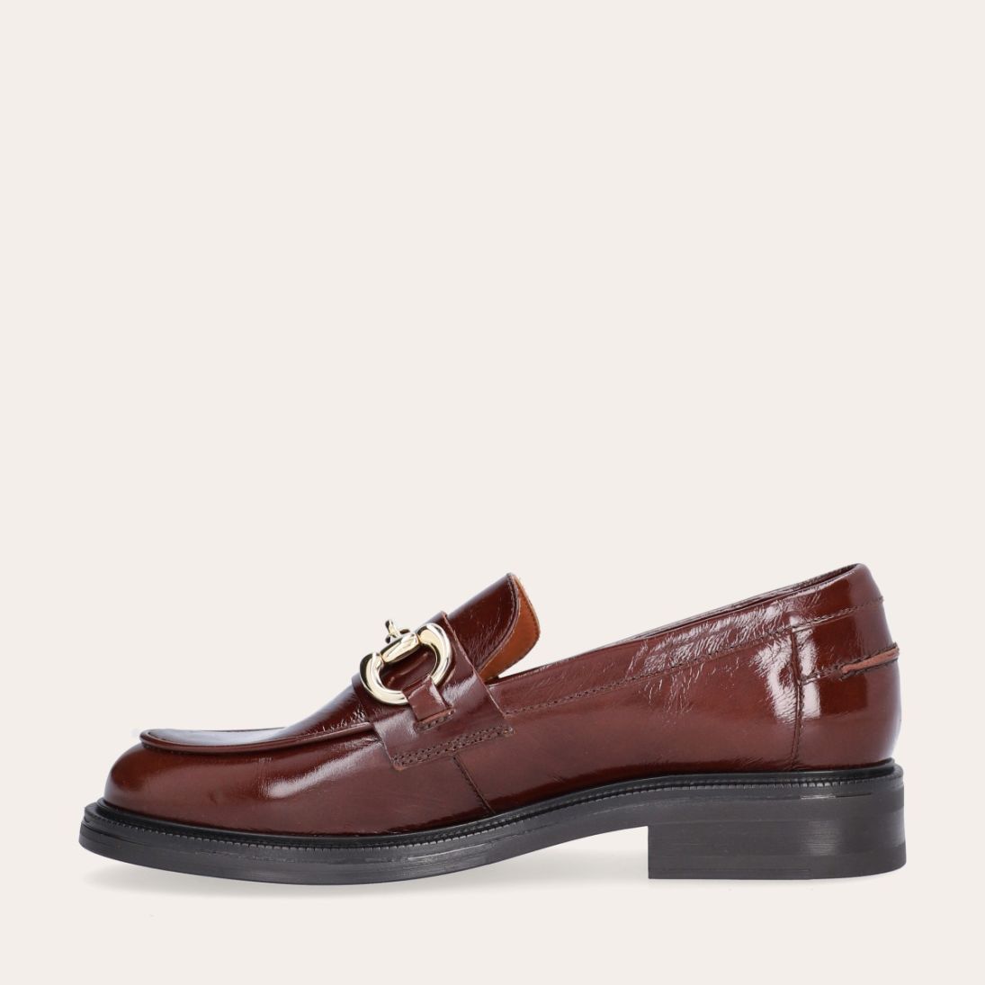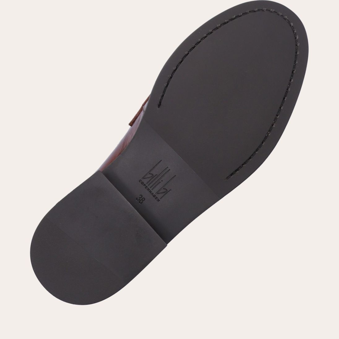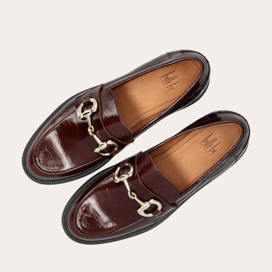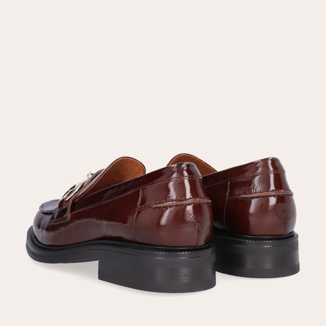 Håndlavet loafer, udført i rødbrunt lakeret skind med rund tå. Loaferen er dekoreret med en skindstrop og et gyldent spænde på forfoden samt piping foran og bagpå.