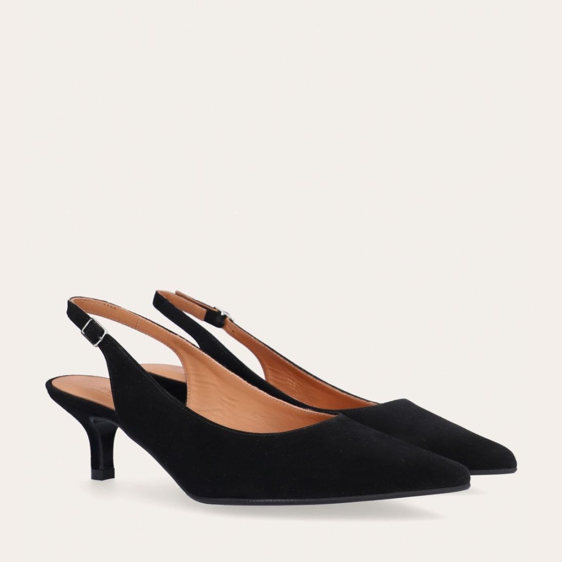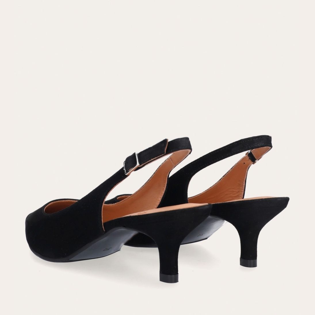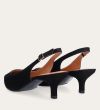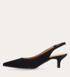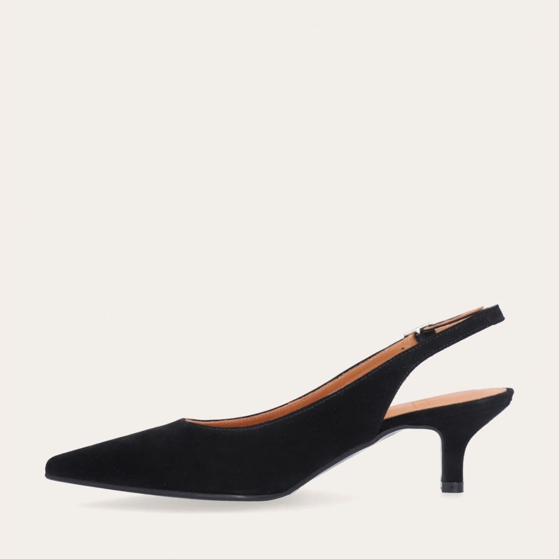 Håndlavet slingback pump med spids tå, udført i sort ruskind. Stroppen lukkes med et lille sølvfarvet spænde. Pumpen har en elegant mellemhøj skindbetrukket kitten heel.