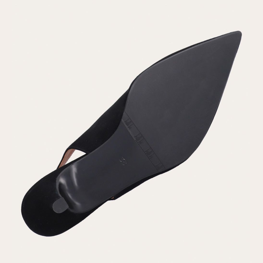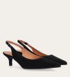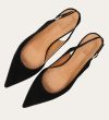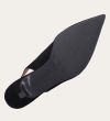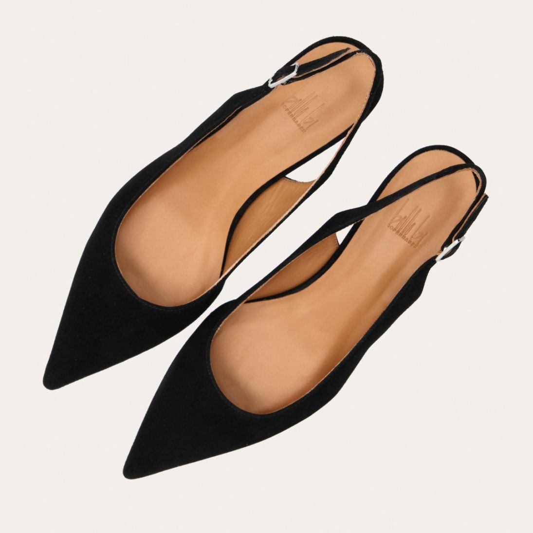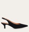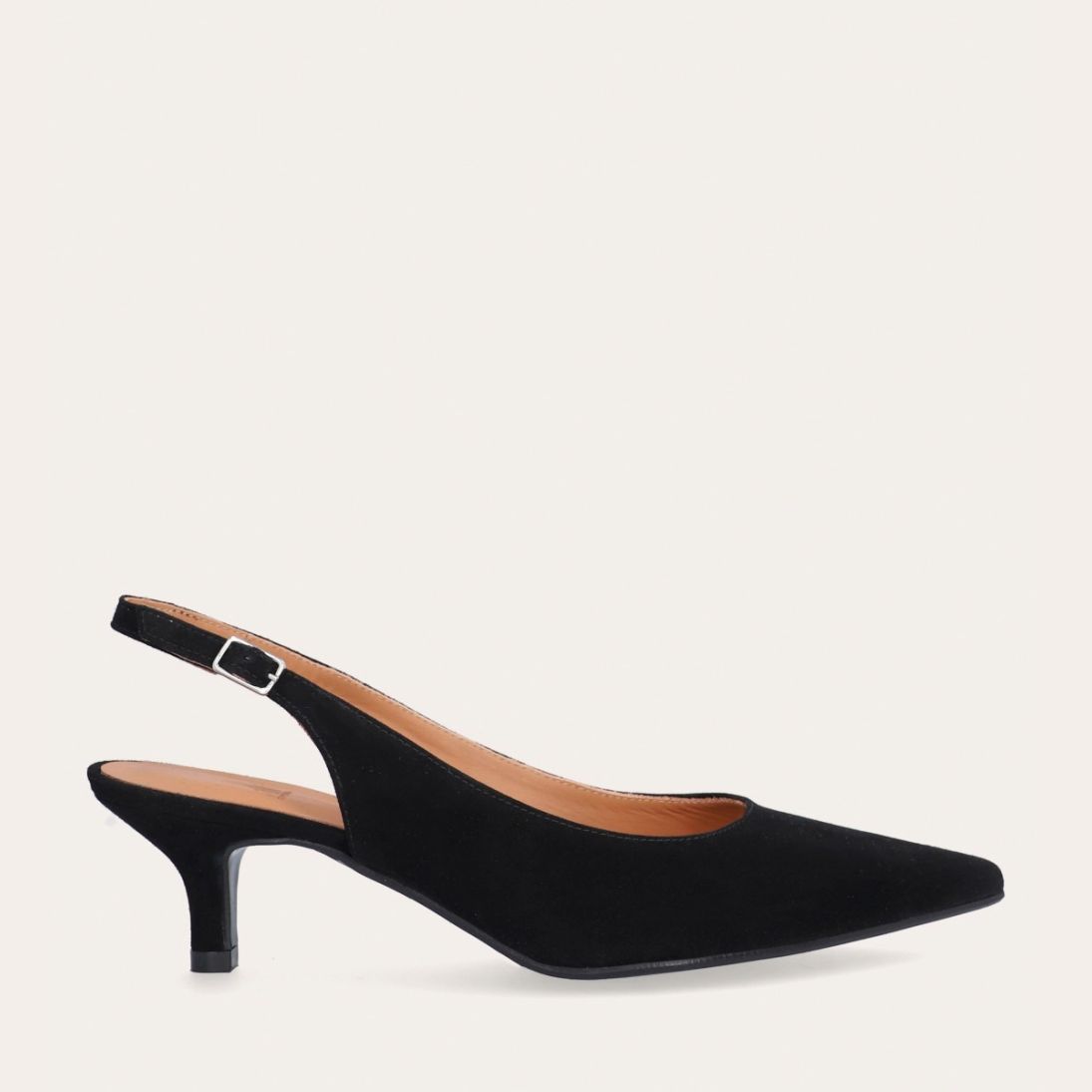 Håndlavet slingback pump med spids tå, udført i sort ruskind. Stroppen lukkes med et lille sølvfarvet spænde. Pumpen har en elegant mellemhøj skindbetrukket kitten heel.