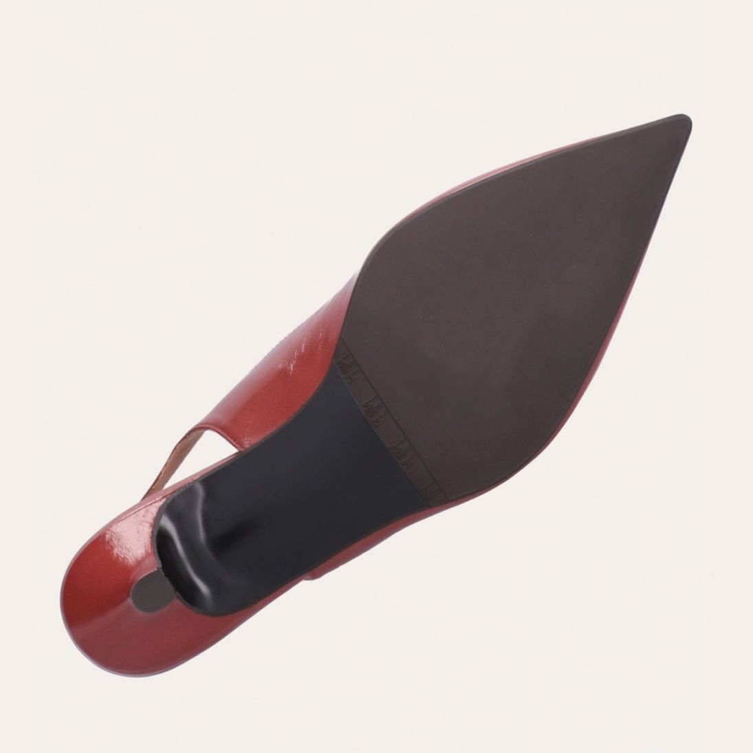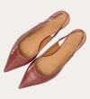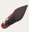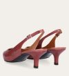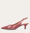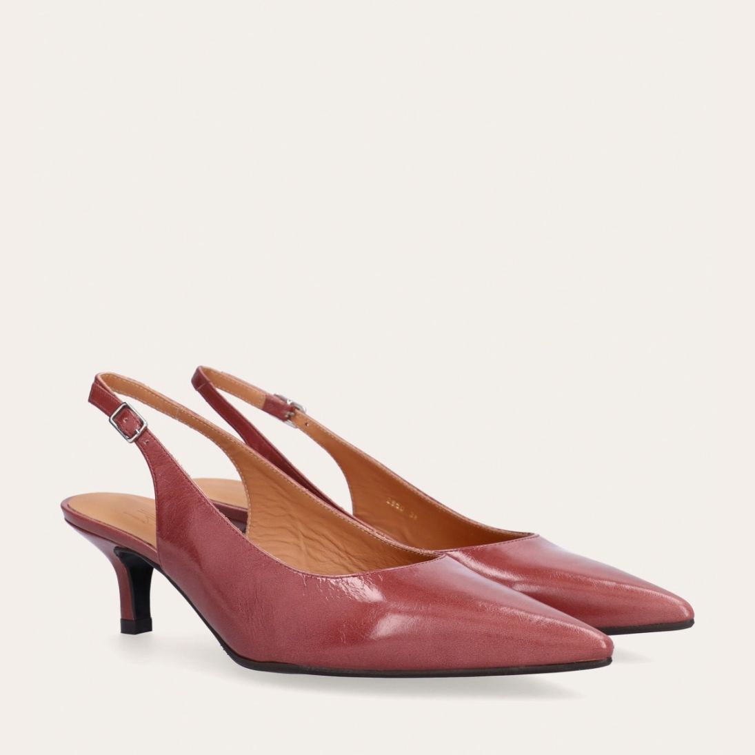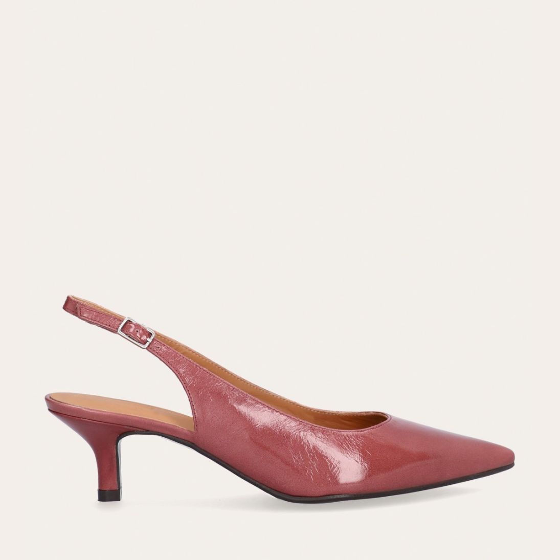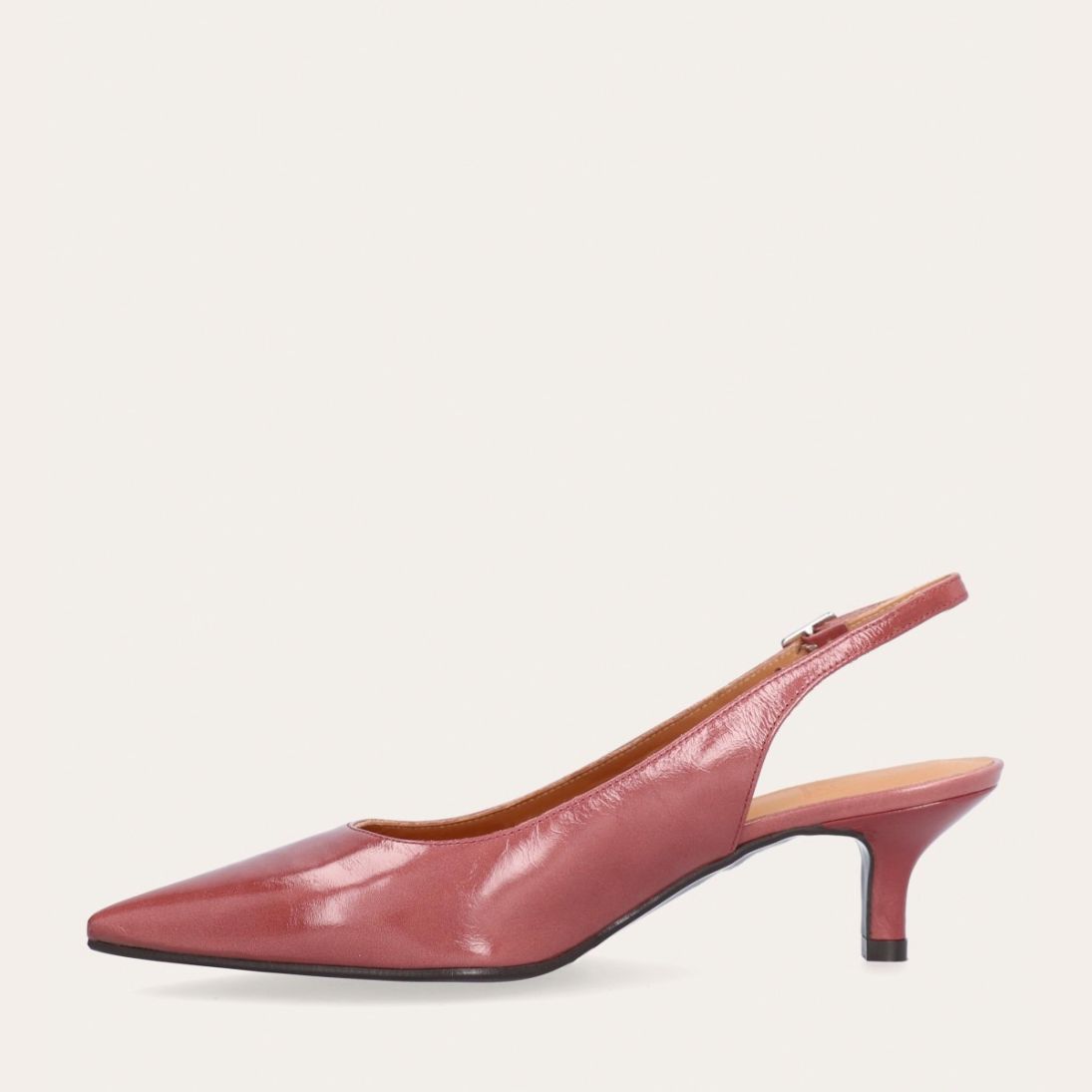 Håndlavet slingback pump med spids tå, udført i smuk gammelrosa-farvet lakeret skind. Stroppen lukkes med et lille sølvfarvet spænde. Pumpen har en elegant mellemhøj skindbetrukket kitten heel.