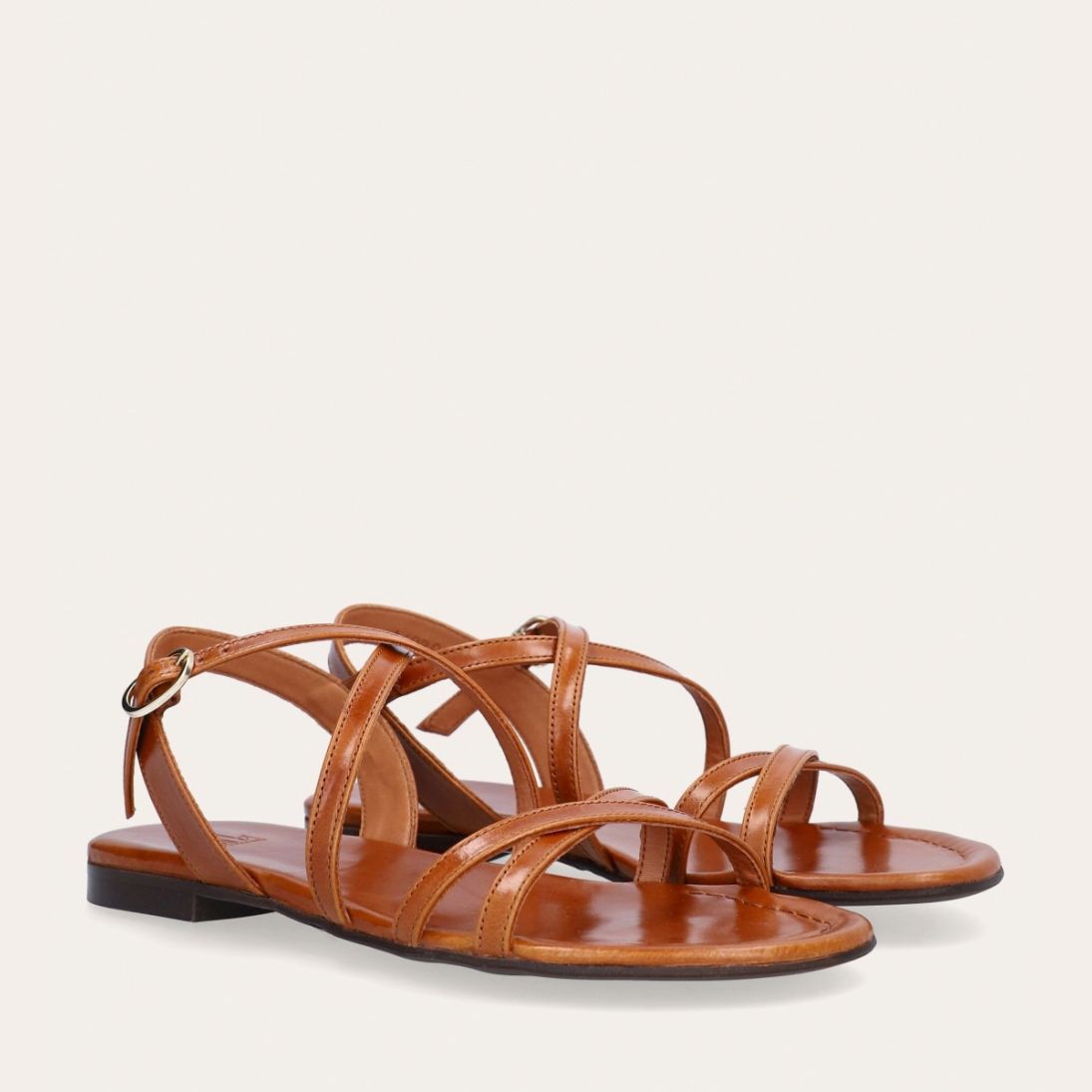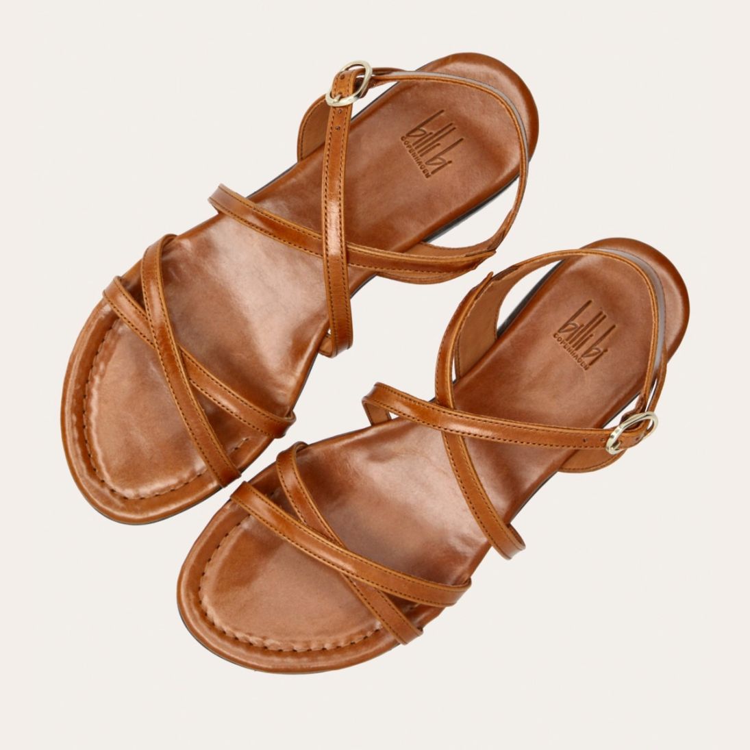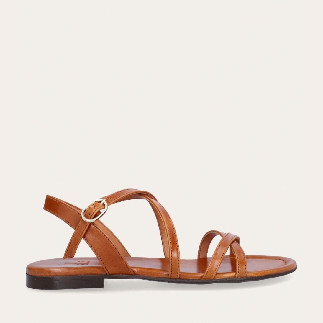 Håndlavet sandal udført i lysebrunt glat skind og rund tå. Sandalen er designet med krydsende remme henover foden og et gyldent spænde.