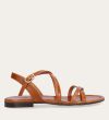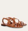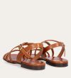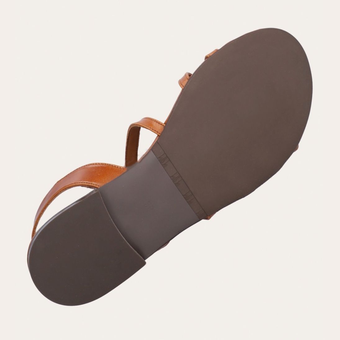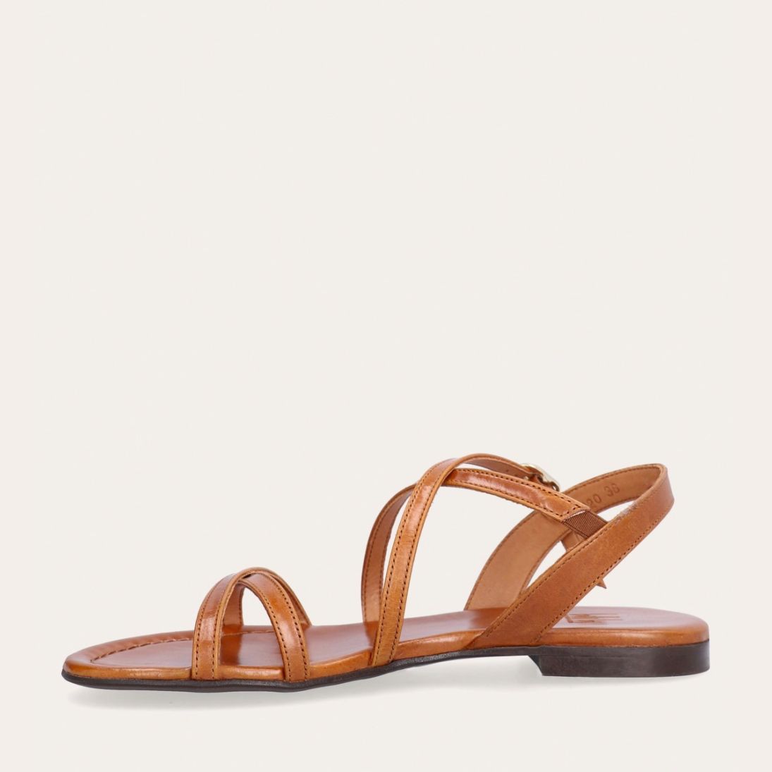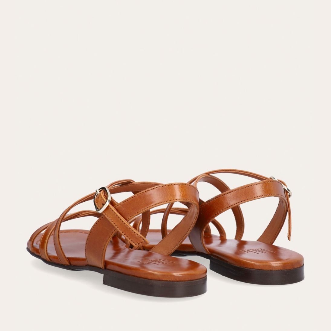 Håndlavet sandal udført i lysebrunt glat skind og rund tå. Sandalen er designet med krydsende remme henover foden og et gyldent spænde.
