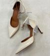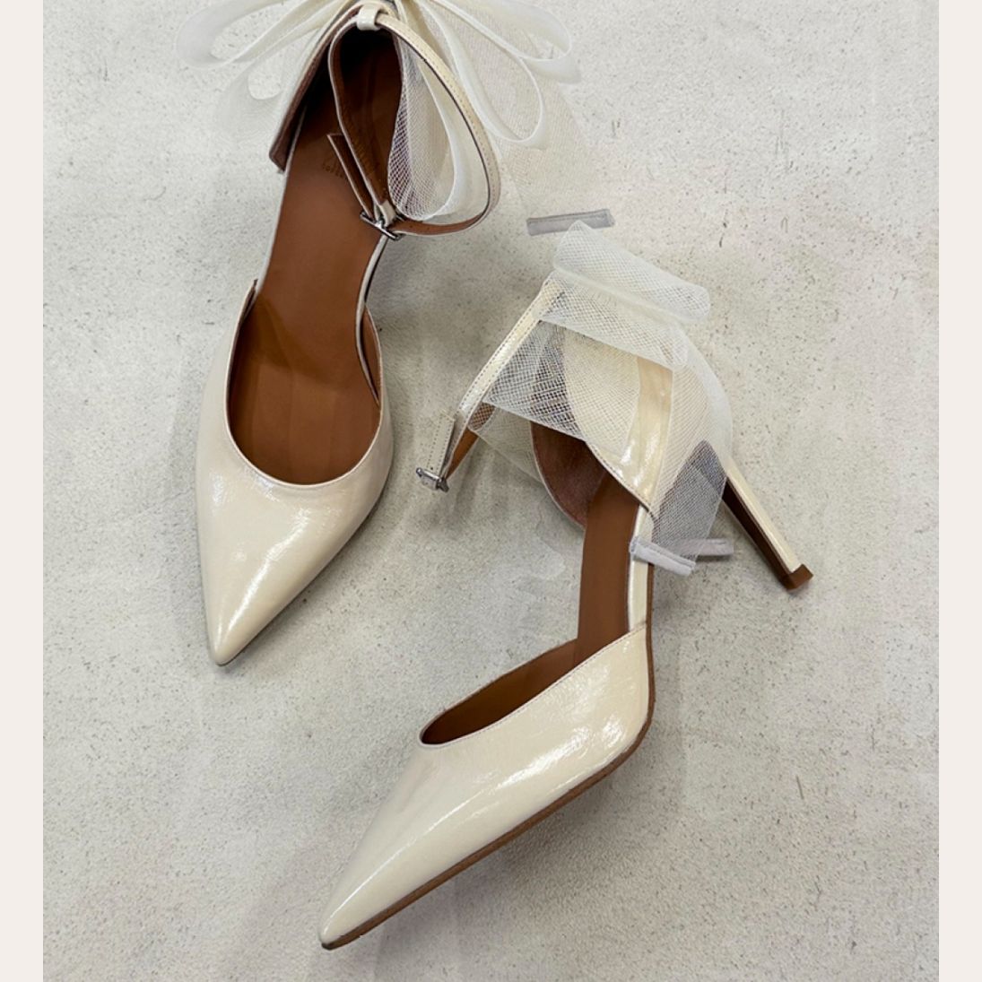 Håndlavet stilet, udført i offwhite lakeret skind med spids tå. Stiletten er dekoreret med en tyl sløjfe bagtil og en strop rundt om anklen. Stroppen er lukket med et lille sølv spænde. Stiletten har en høj og elegant hæl.