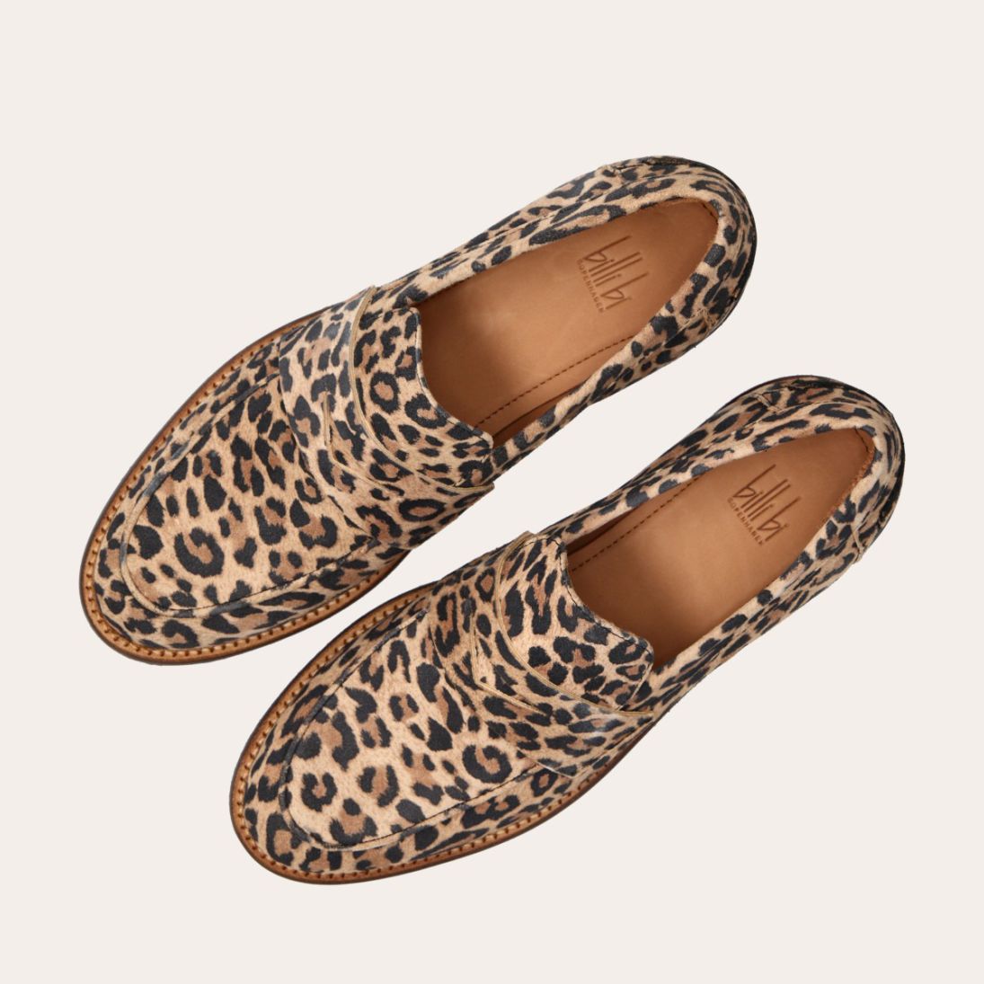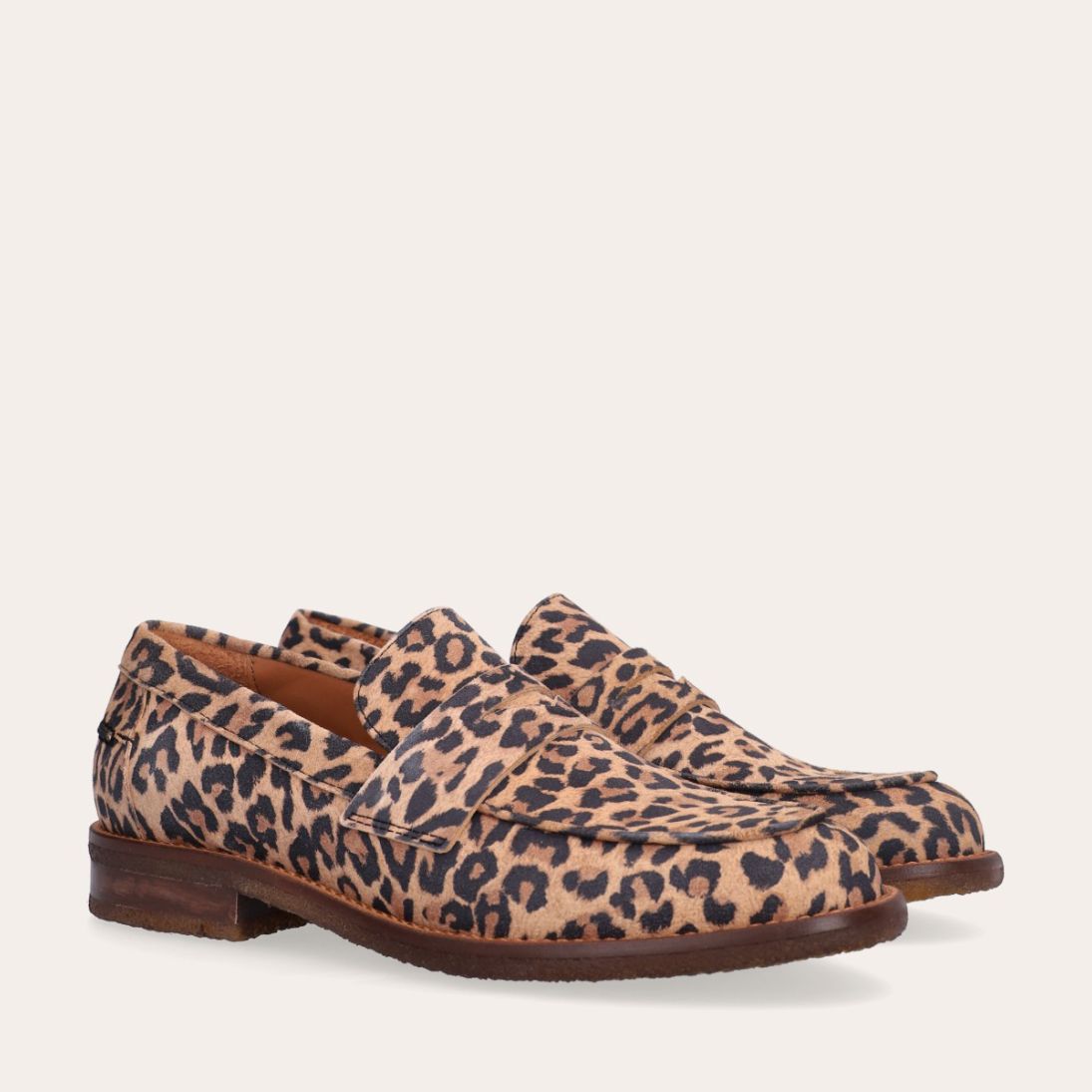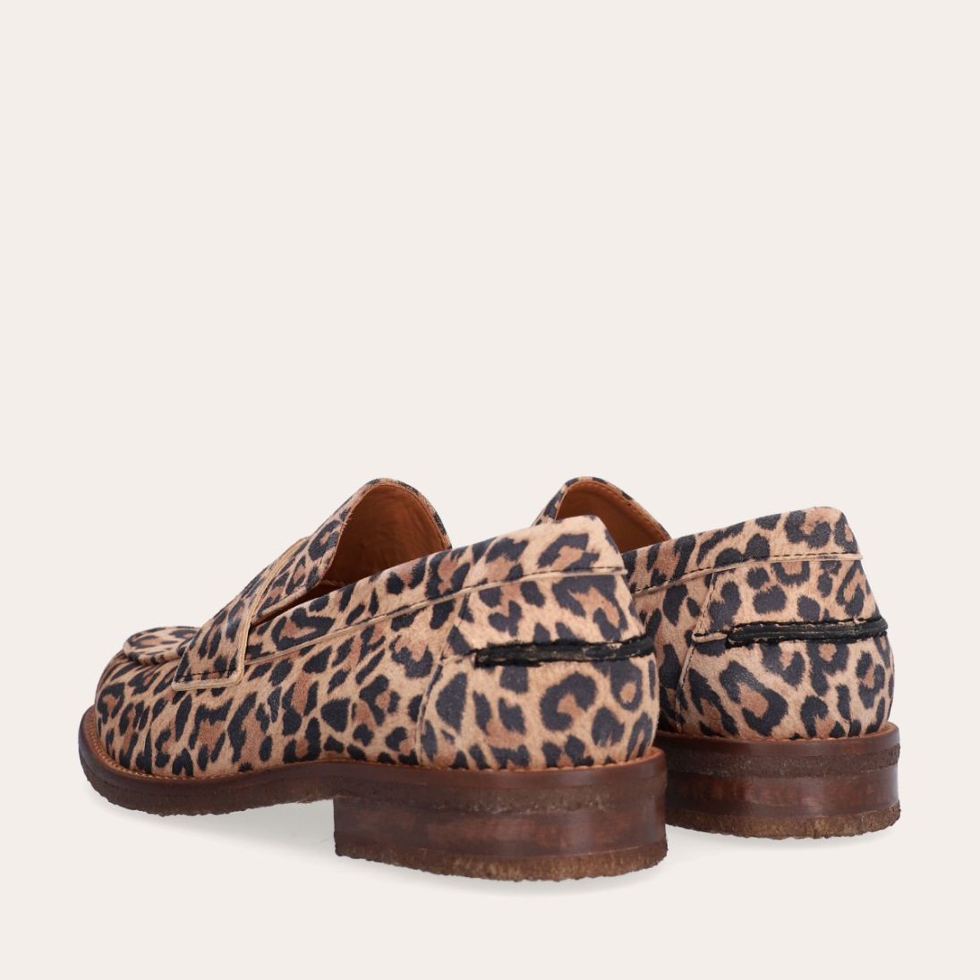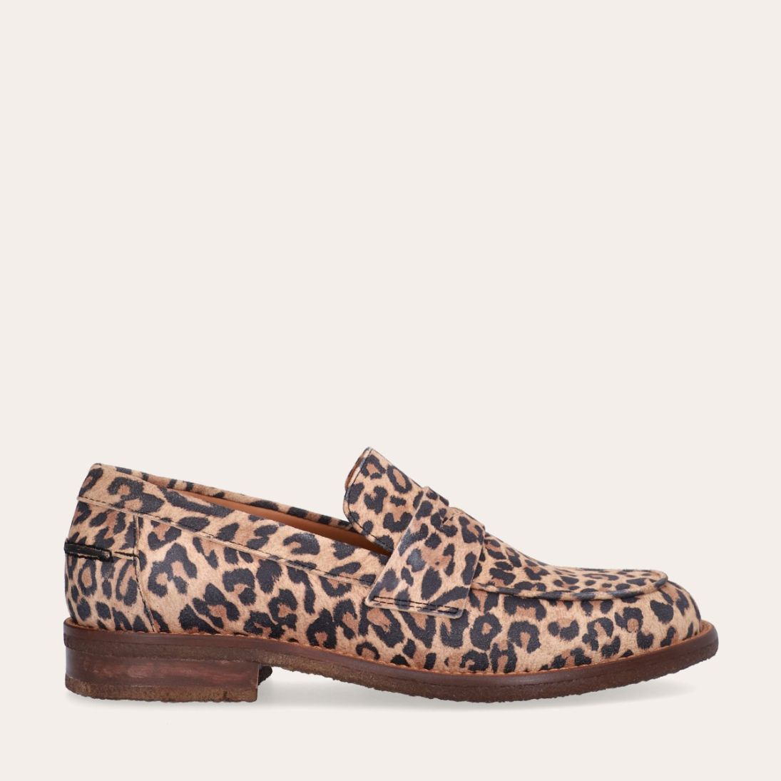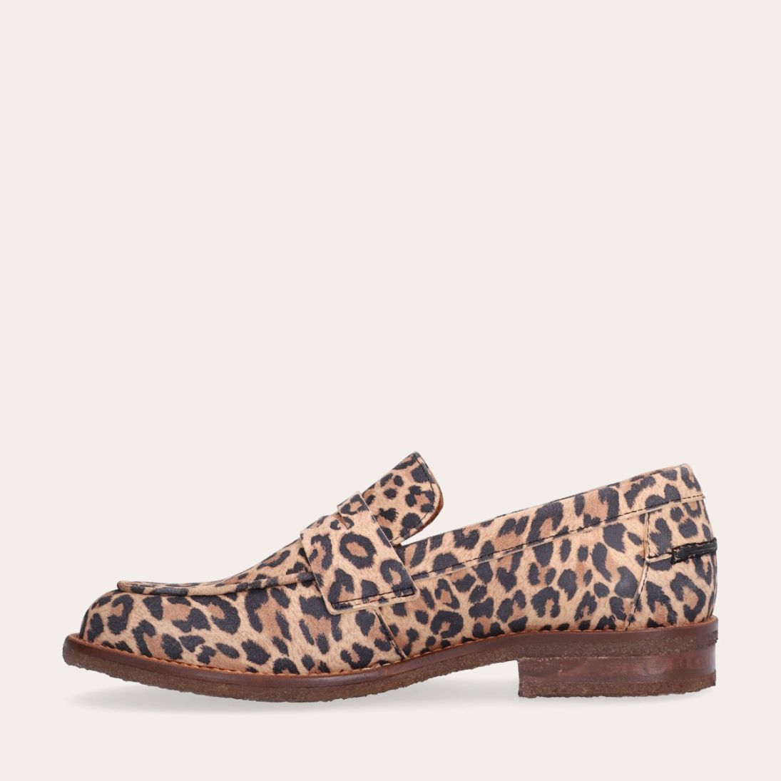 Håndlavet loafer, udført i ruskind med leopard mønster og en rund tå. Loaferen er dekoreret med en strop henover fronten, som har et dekorativt cut-out i midten. Loaferen har en blød polstret indersål for optimal komfort.