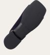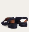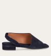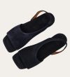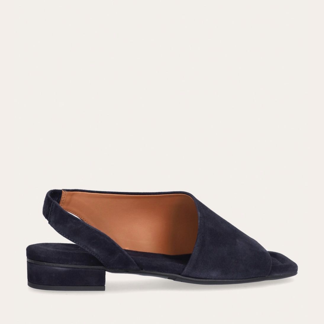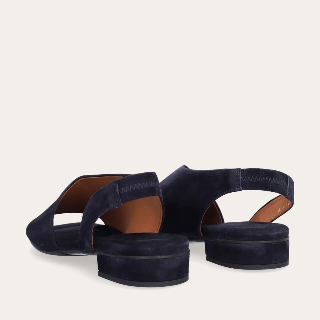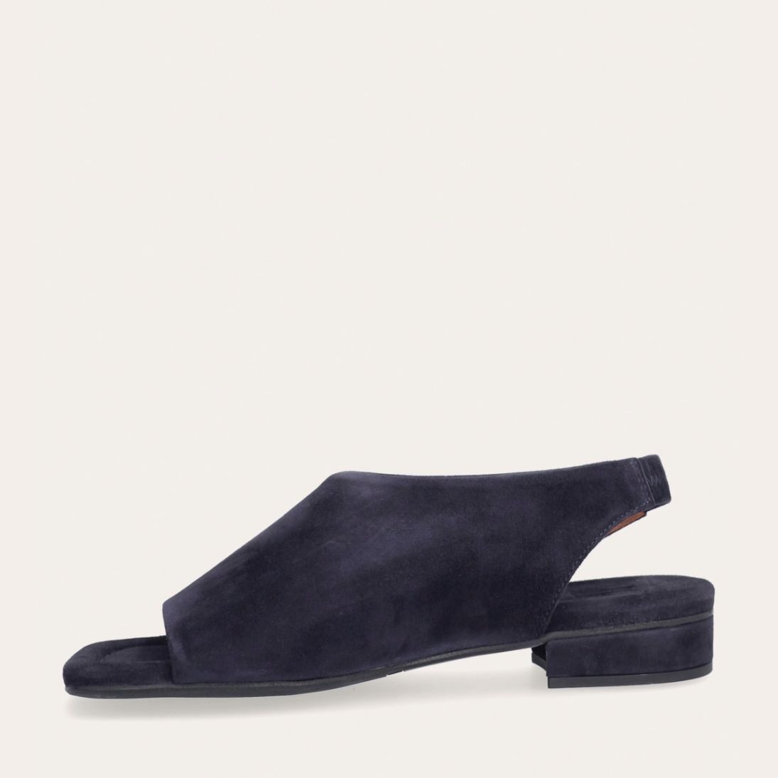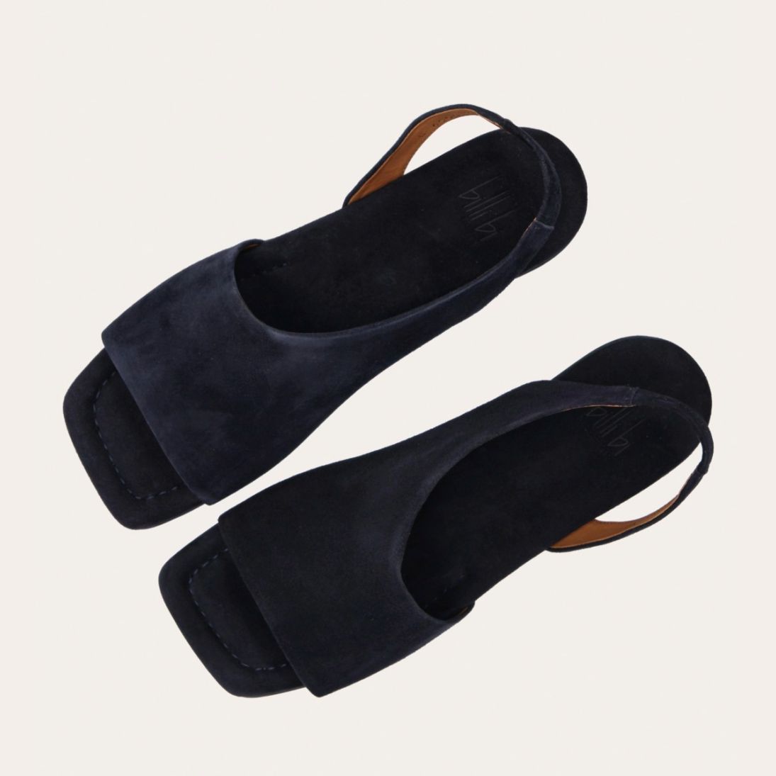 Håndlavet sandal, udført i mørkeblåt ruskind med en firkantet tå. Sandalen har asymmetriske sider og en rem, der går rundt om hælen. Remmen er designet med en elastisk indeni for at sikre en fleksibel og behagelig pasform.