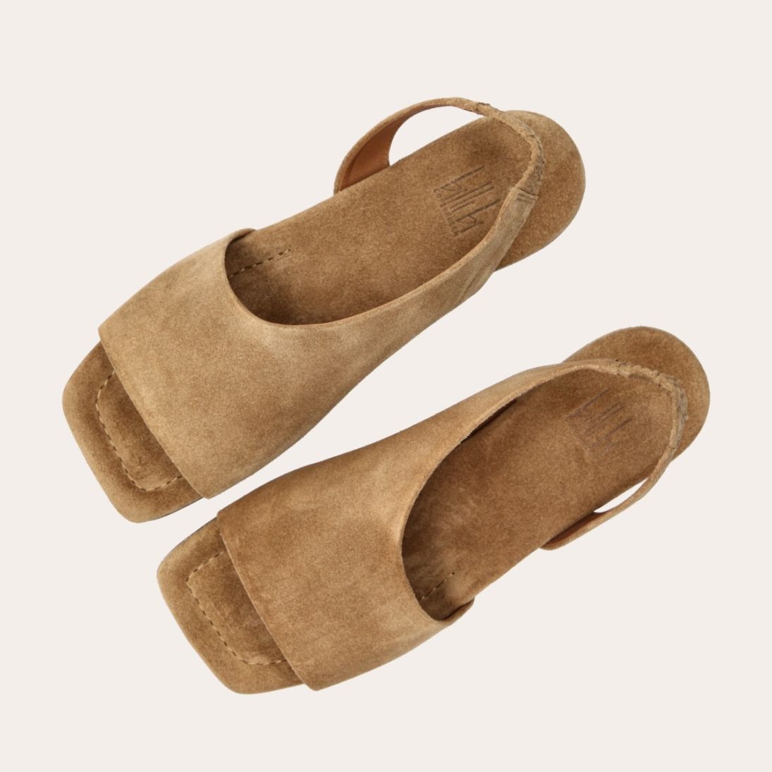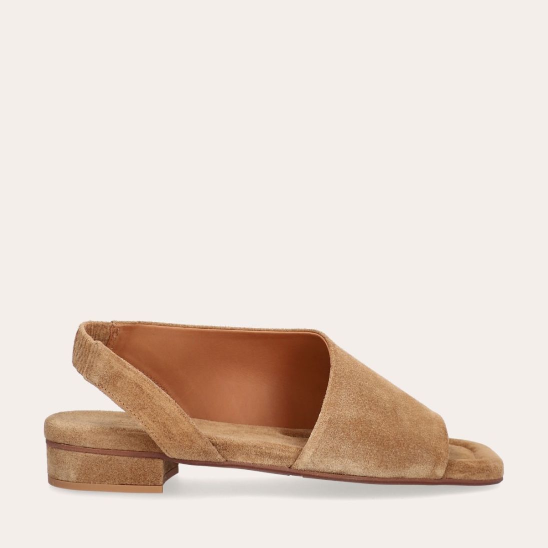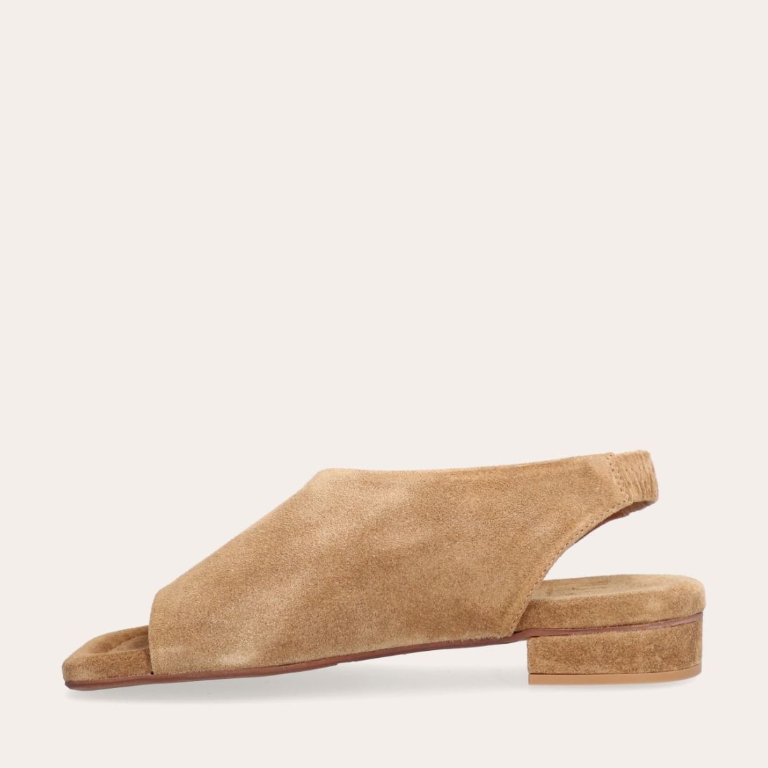 Håndlavet sandal, udført i beige ruskind med en firkantet tå. Sandalen har asymmetriske sider og en rem, der går rundt om hælen. Remmen er designet med en elastisk indeni for at sikre en fleksibel og behagelig pasform.