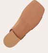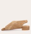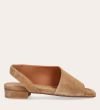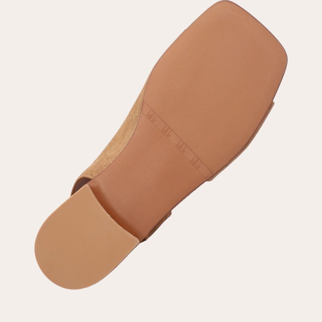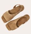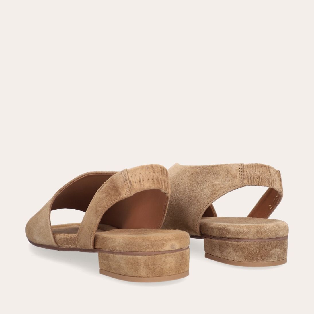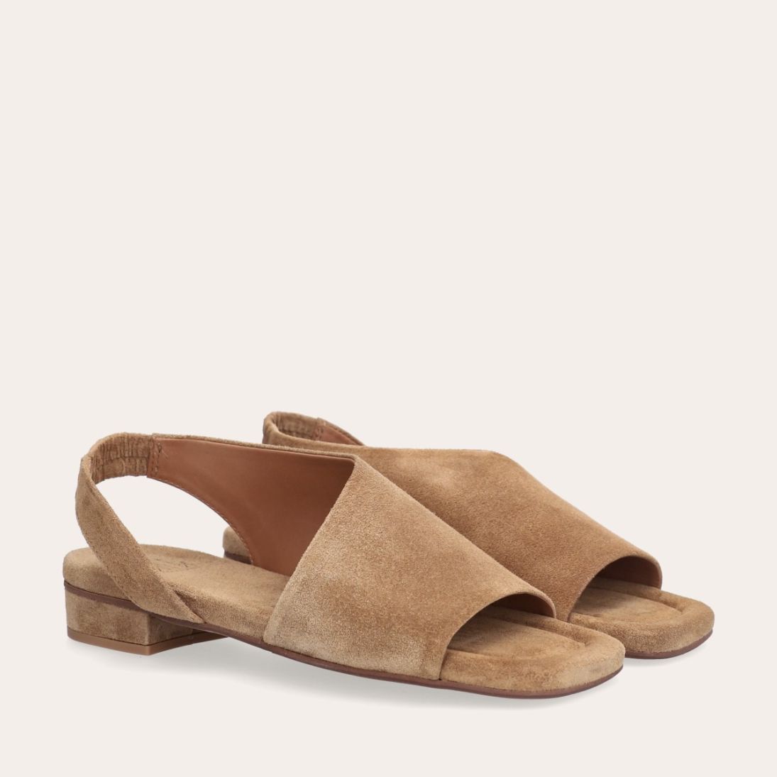 Håndlavet sandal, udført i beige ruskind med en firkantet tå. Sandalen har asymmetriske sider og en rem, der går rundt om hælen. Remmen er designet med en elastisk indeni for at sikre en fleksibel og behagelig pasform.