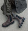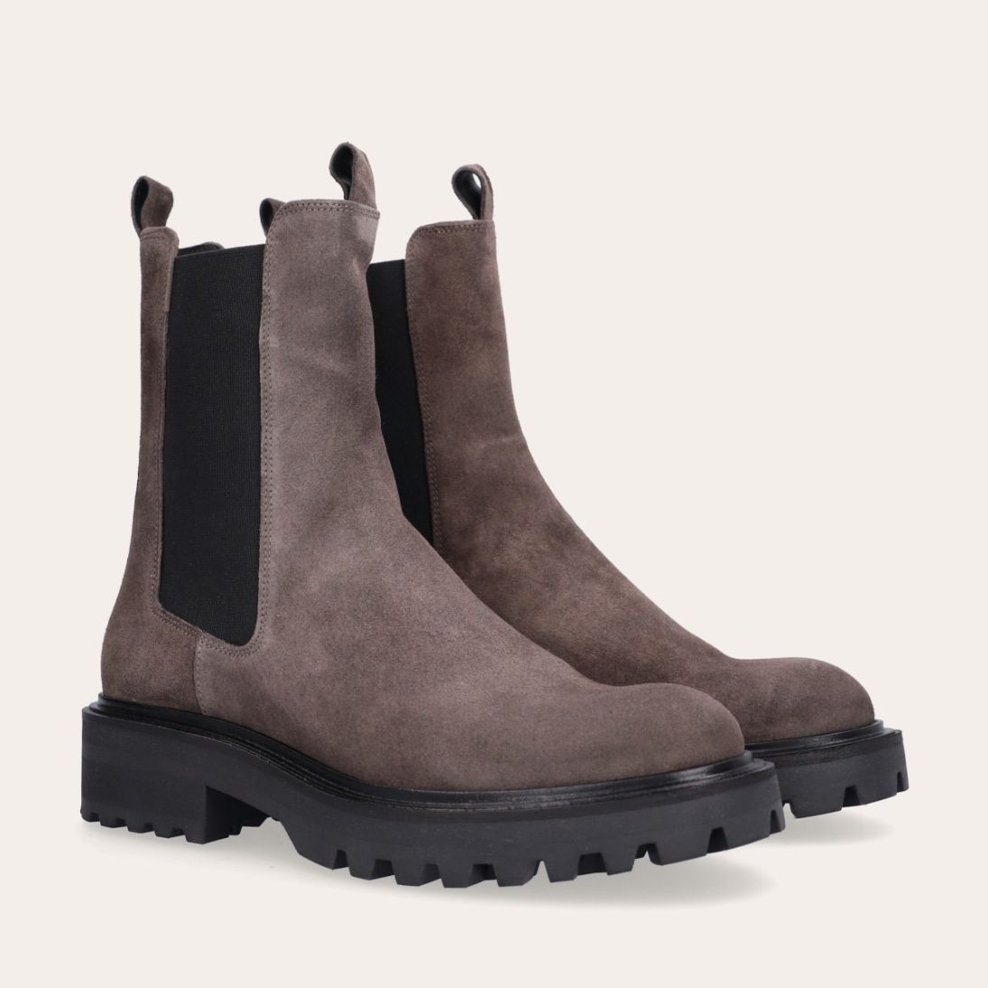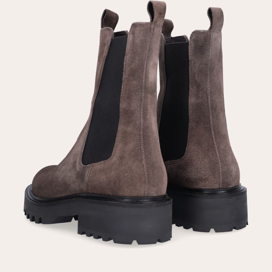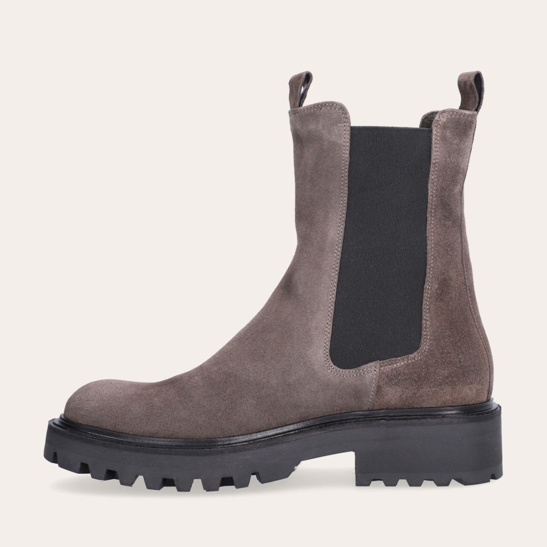 Håndlavet støvle, udført i gråt ruskind med rund tå. Støvlen er dekoreret med sorte elastiske sidepaneler på begge sider og små stropper i toppen af siderne. Støvlen har en chunky tracksål.