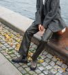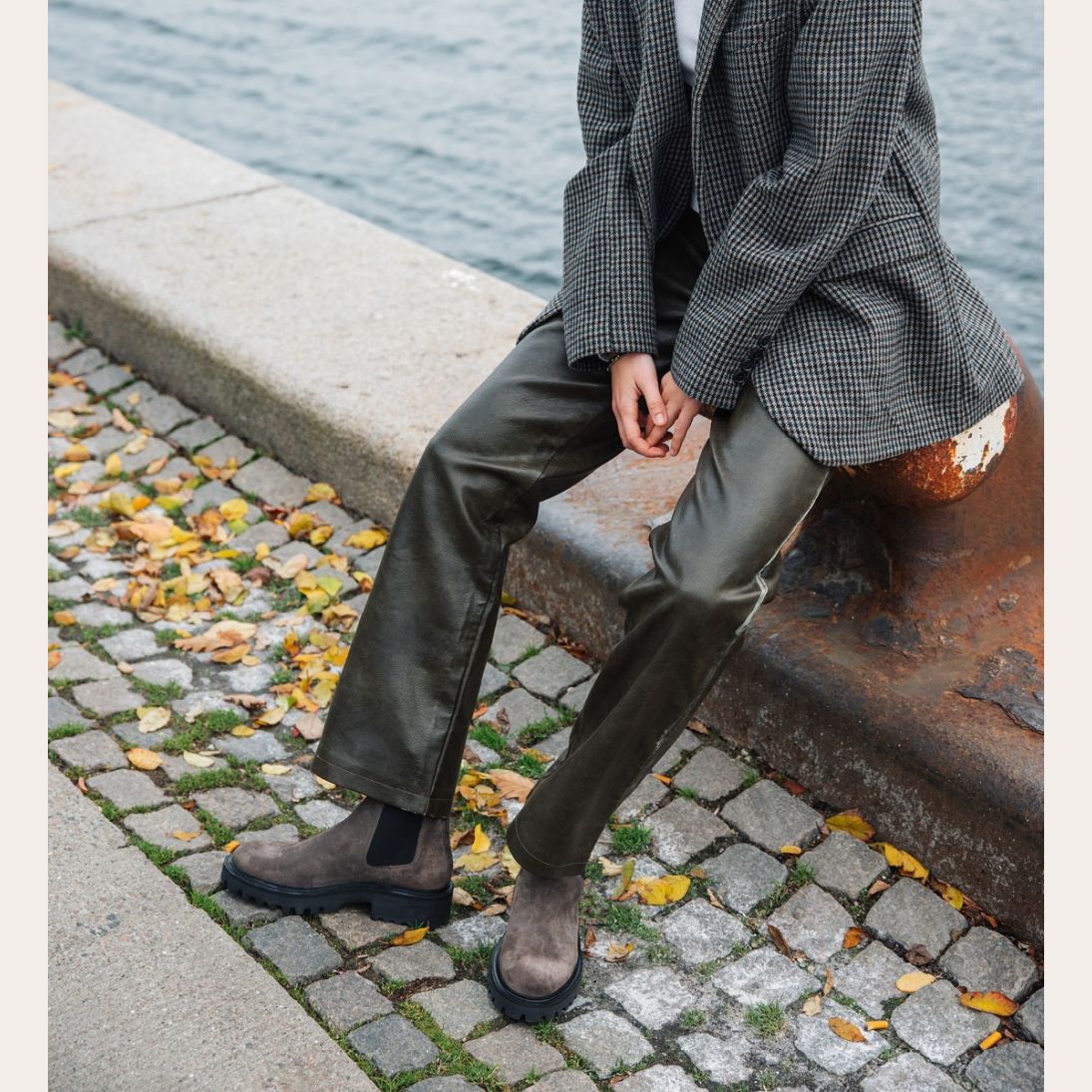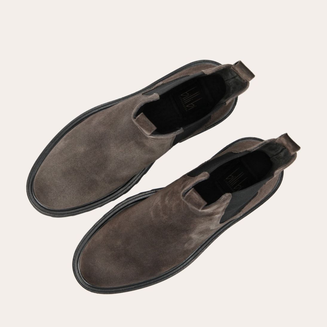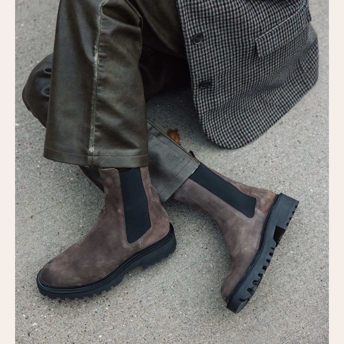 Håndlavet støvle, udført i gråt ruskind med rund tå. Støvlen er dekoreret med sorte elastiske sidepaneler på begge sider og små stropper i toppen af siderne. Støvlen har en chunky tracksål.