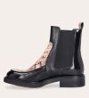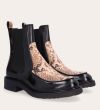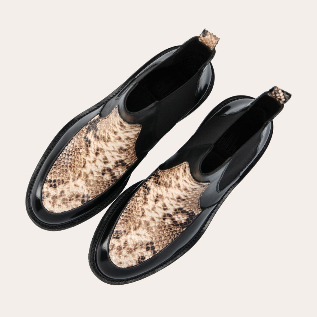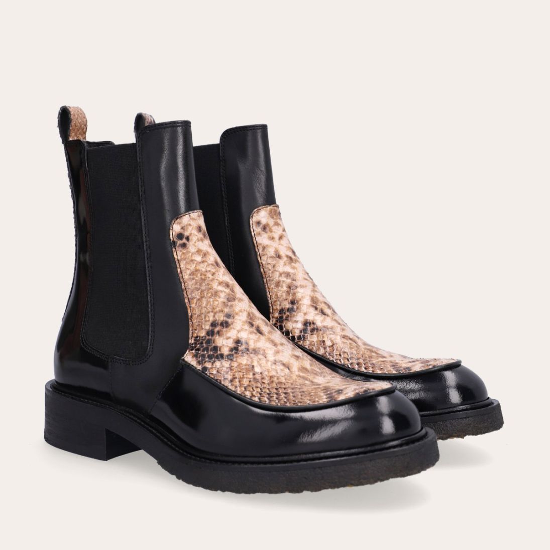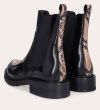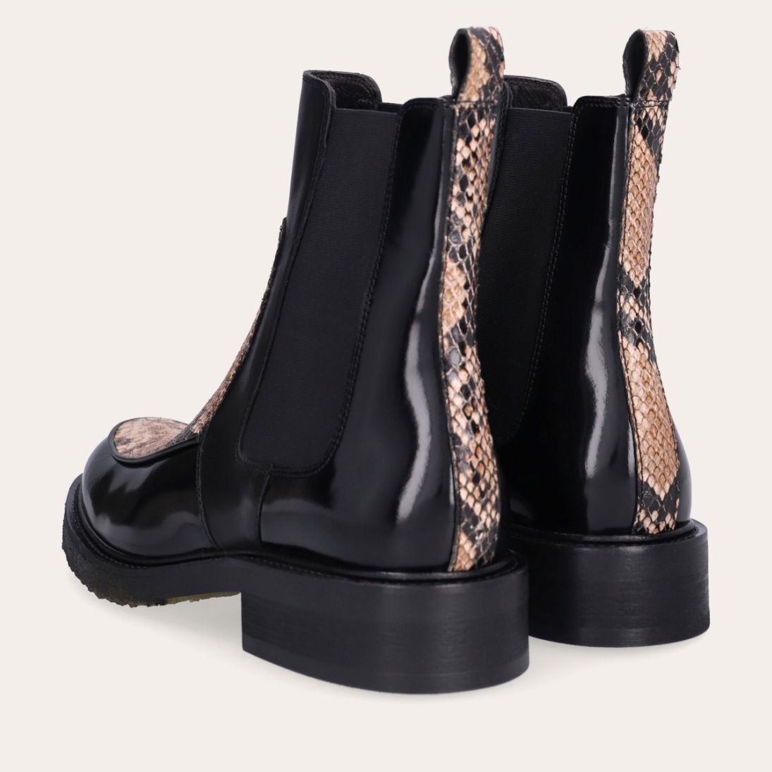 Håndlavet støvle med rund tå, udført i både sort polido skind og præget skind med slangemønster. Foran er støvlen udført i præget skind med slangemønster, ligesom stroppen bagpå også er udført i præget skind med slangemønster. Støvlen har elastiske sidepaneler.