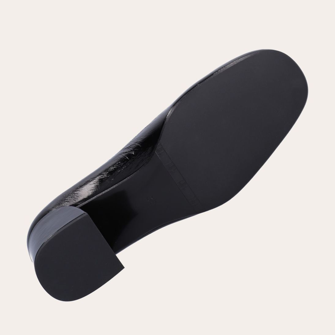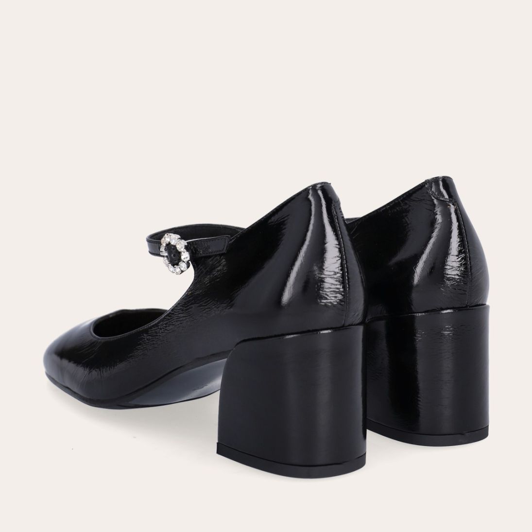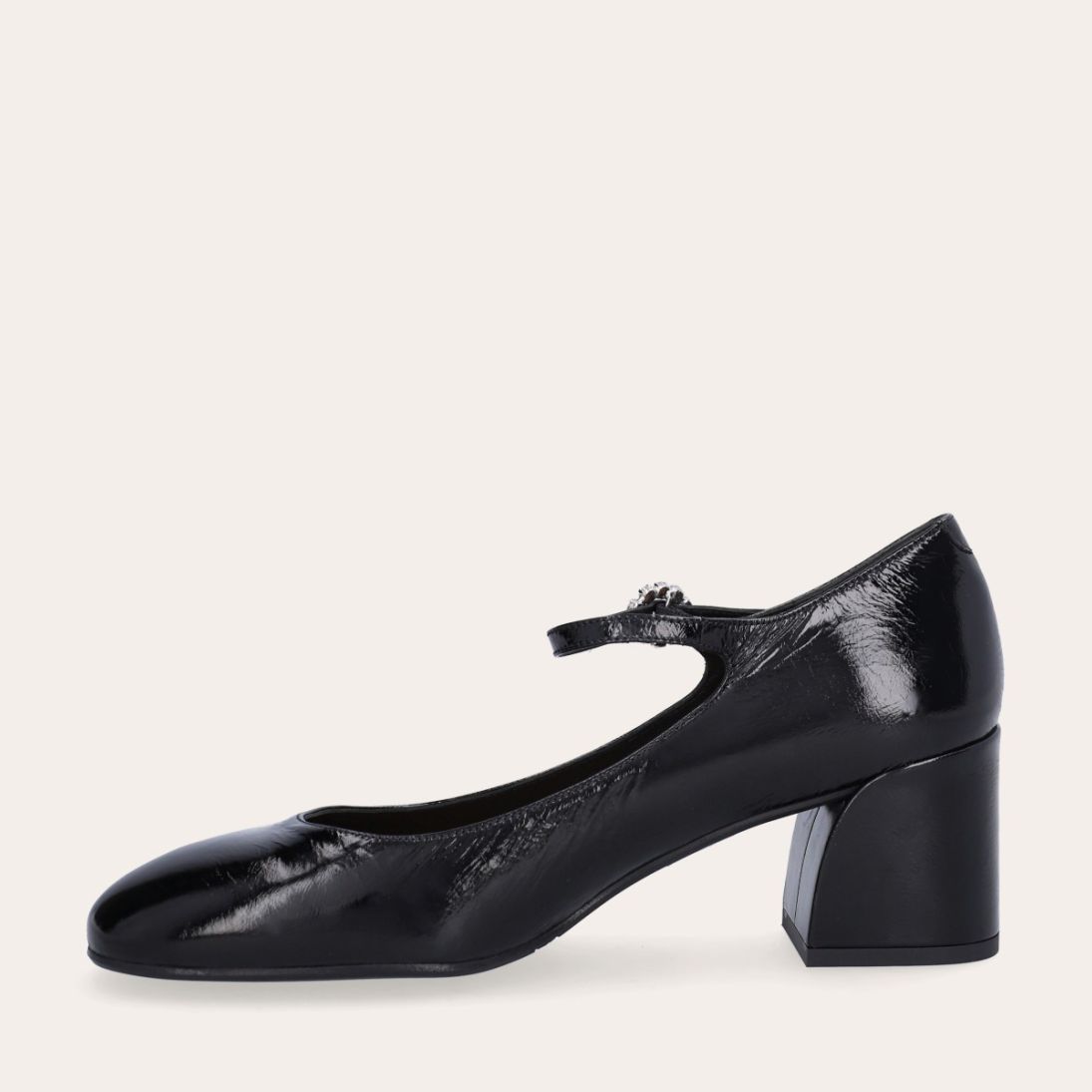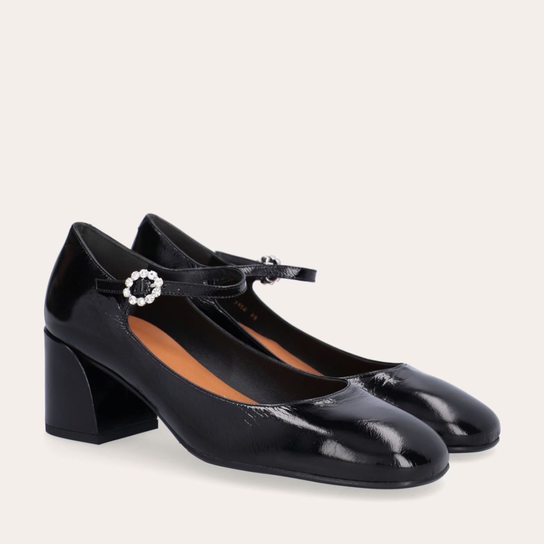 Håndlavet Mary Jane pump, udført i sort lakeret skind med rund tå. Pumpen er dekoreret med den klassiske rem, som lukkes med et smukt simili-spænde. Pumpen har en medium-høj blokhæl.