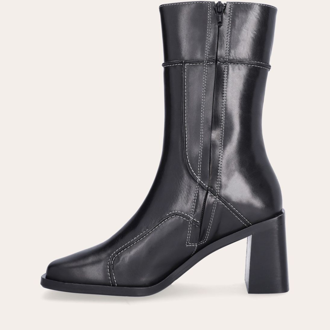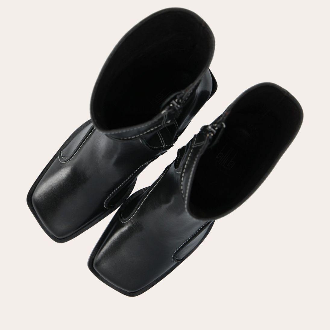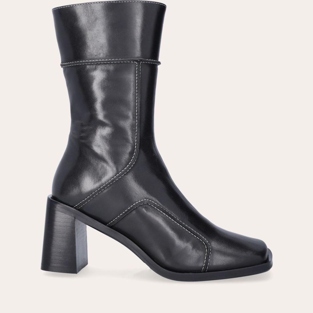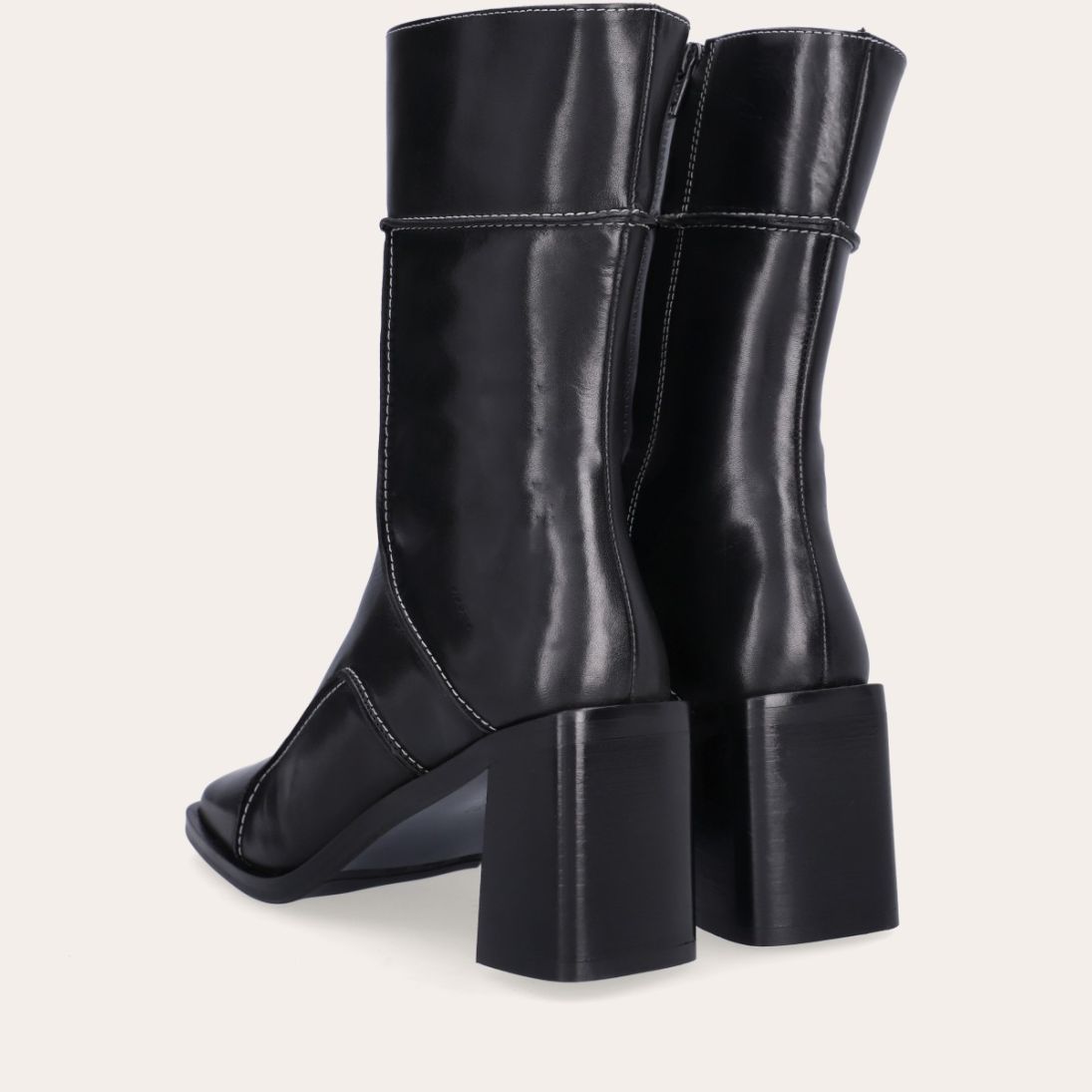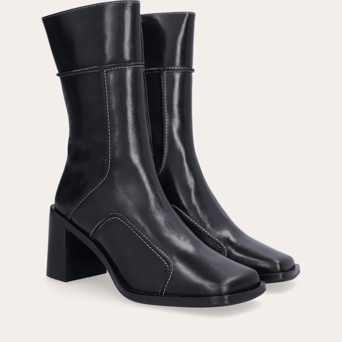 Håndlavet støvle på hæl, udført i sort glat skind med firkantet tå. Støvlen er konstrueret af stykker af skind med offwhite stikninger, der følger sømlinjerne. Støvlen har desuden en lynlås på indersiden og en høj blokhæl.
