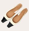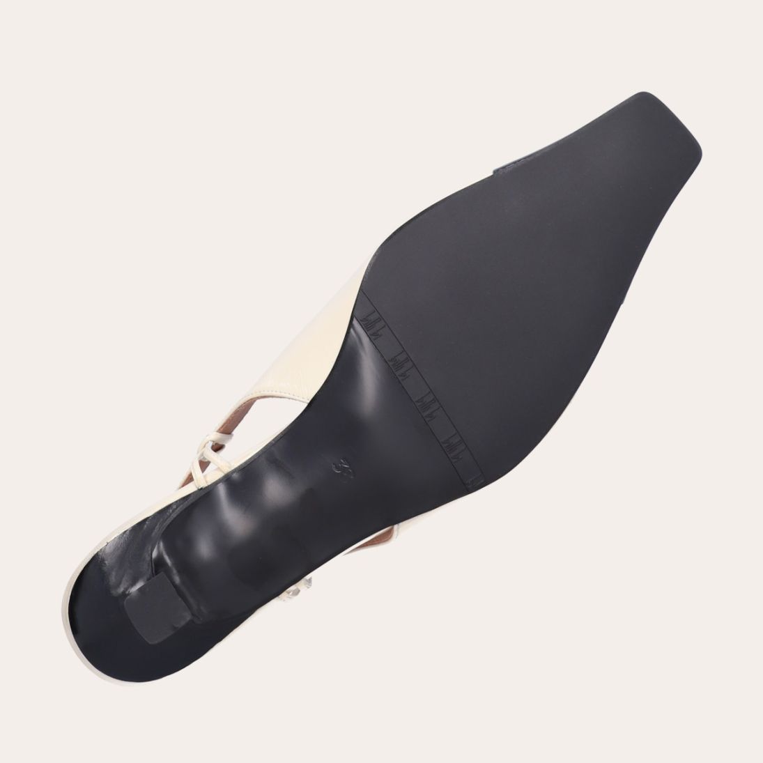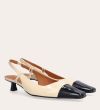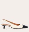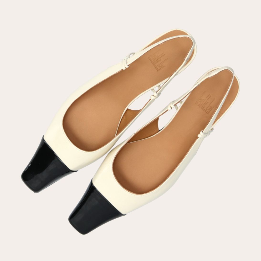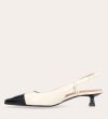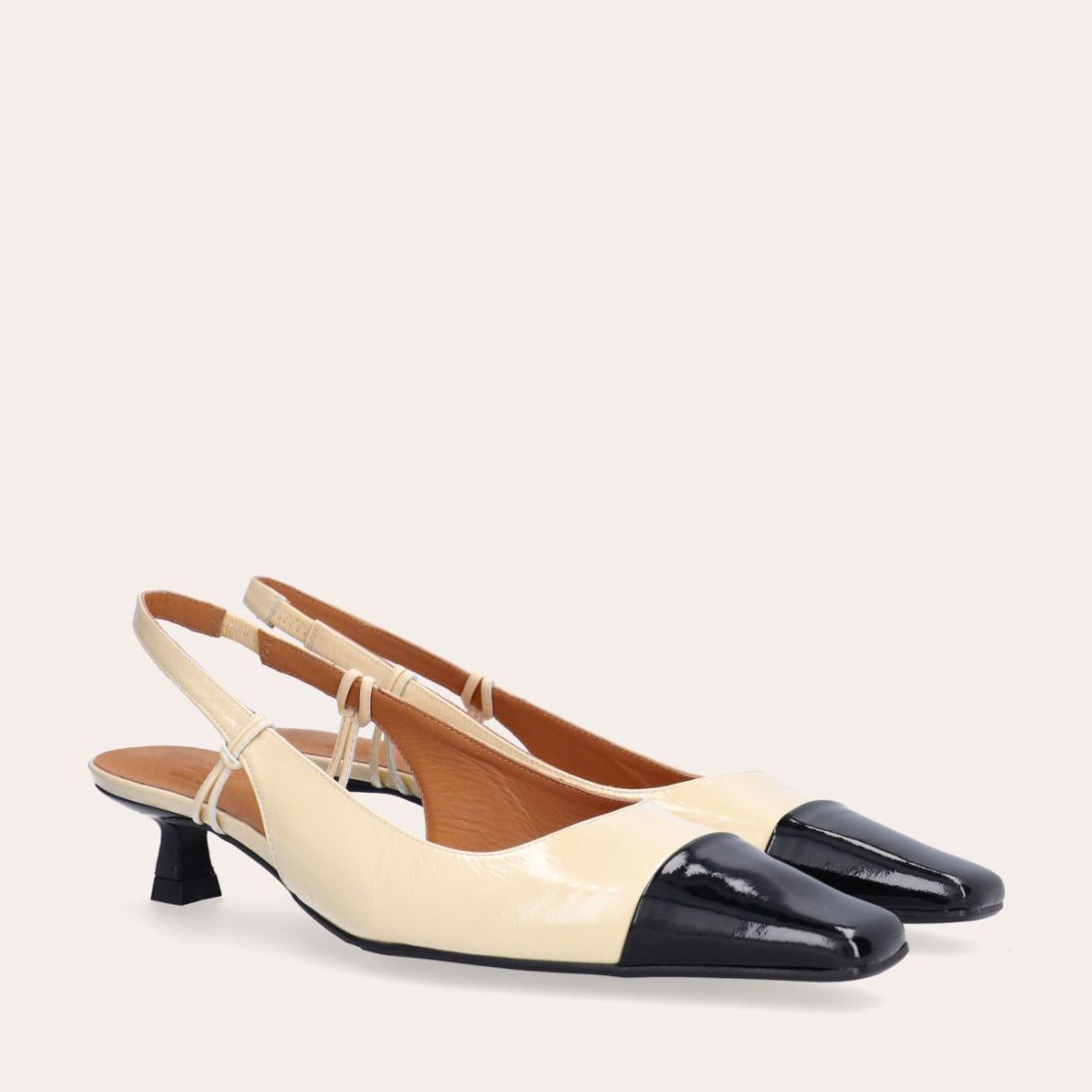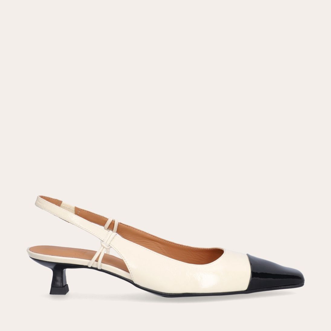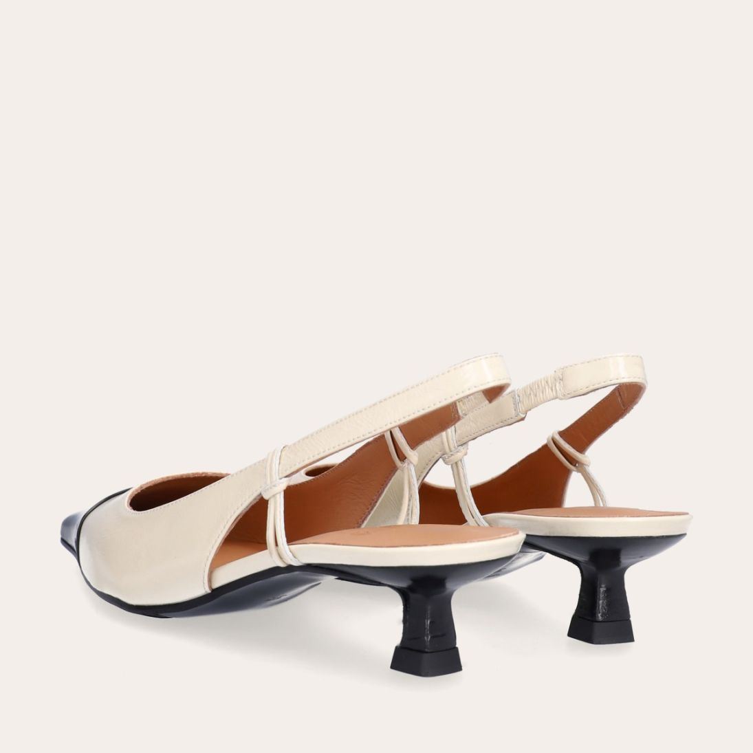 Håndlavet slingback pump, udført i offwhite lakeret skind med spids kantet tå. Pumpen er dekoreret med den klassiske slingback strop rundt om hælen. Pumpen har en sort lak detalje på tåen og en medium kitten heel.