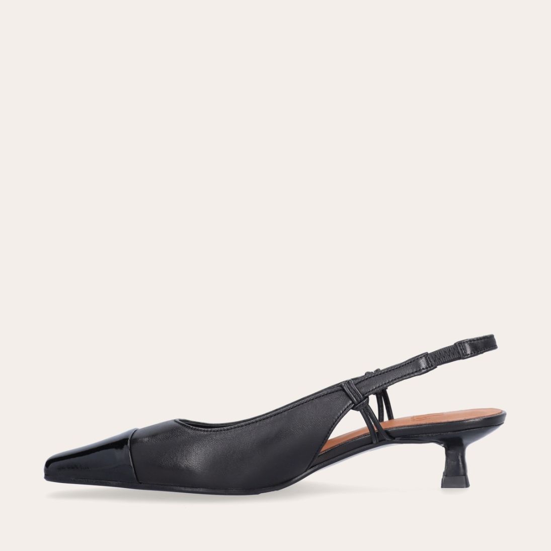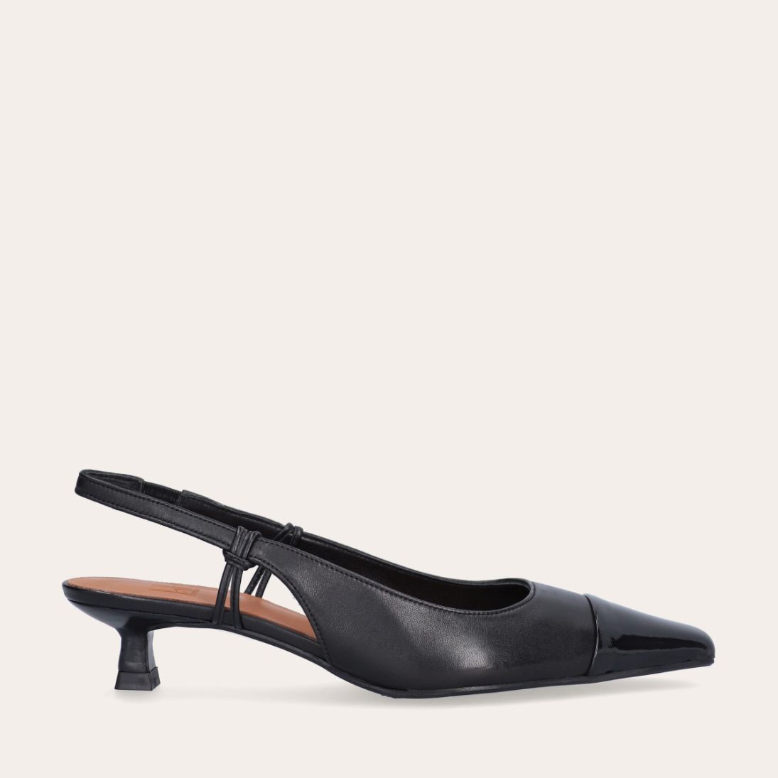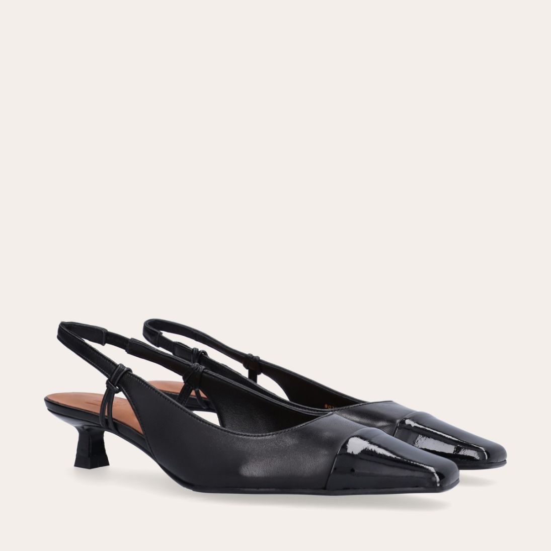 Håndlavet slingback pump, udført i sort glat med spids kantet tå. Pumpen er dekoreret med den klassiske slingback strop rundt om hælen. Pumpen har en sort lak detalje på tåen og en medium kitten heel.