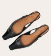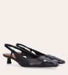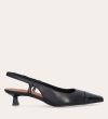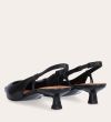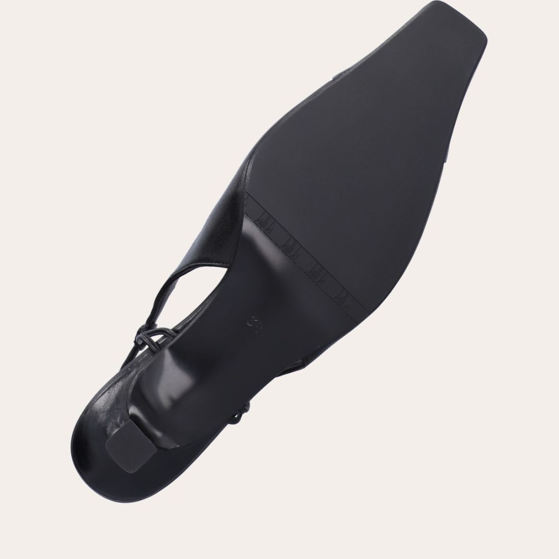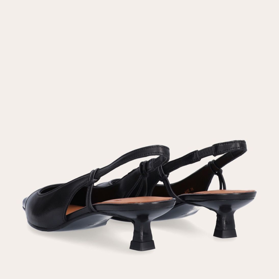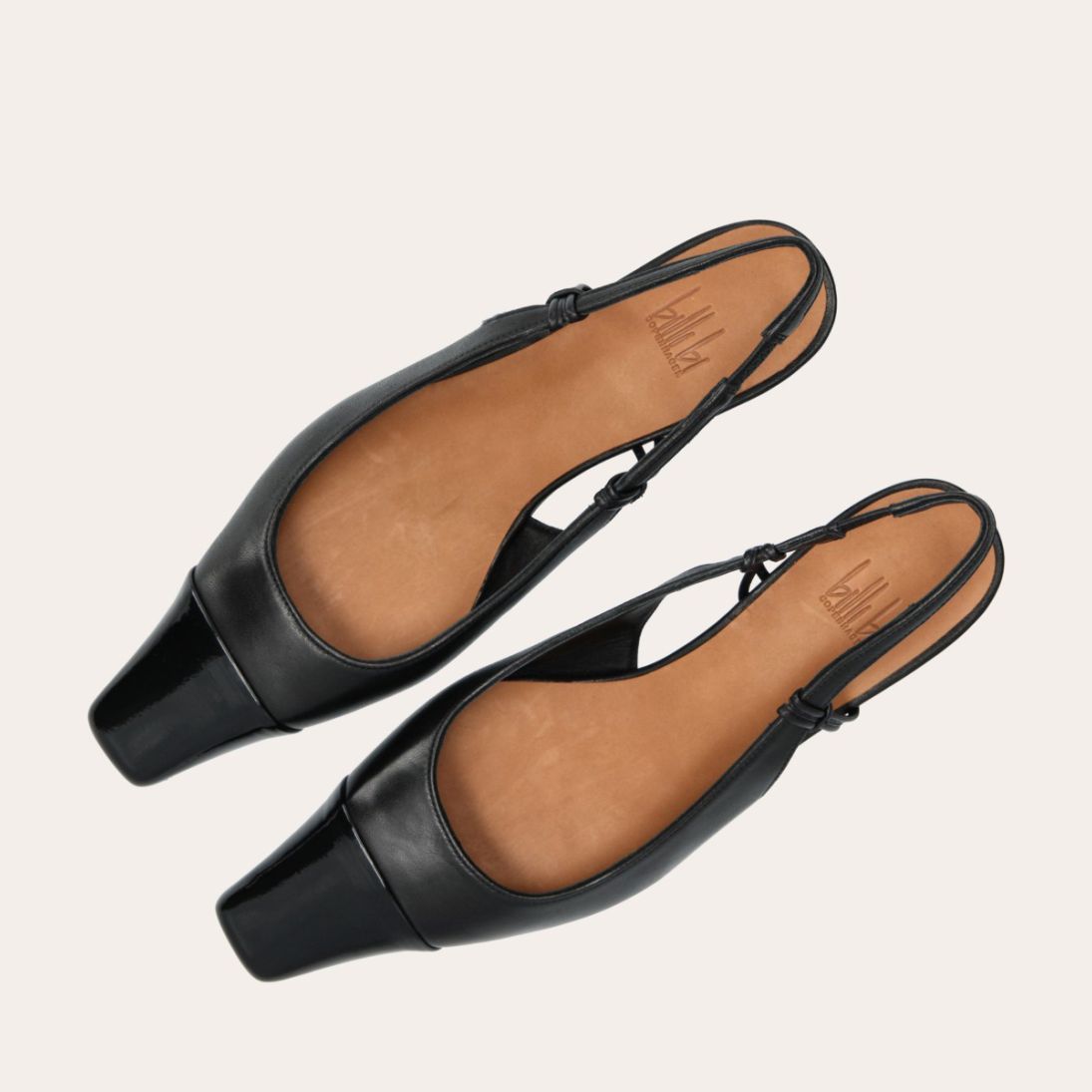 Håndlavet slingback pump, udført i sort glat med spids kantet tå. Pumpen er dekoreret med den klassiske slingback strop rundt om hælen. Pumpen har en sort lak detalje på tåen og en medium kitten heel.