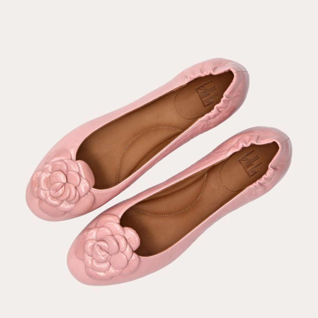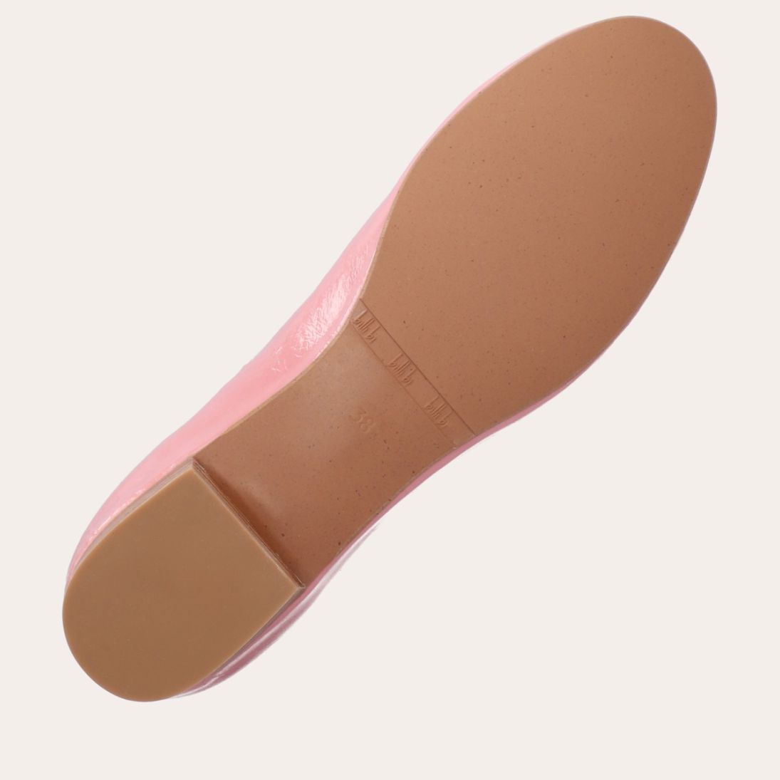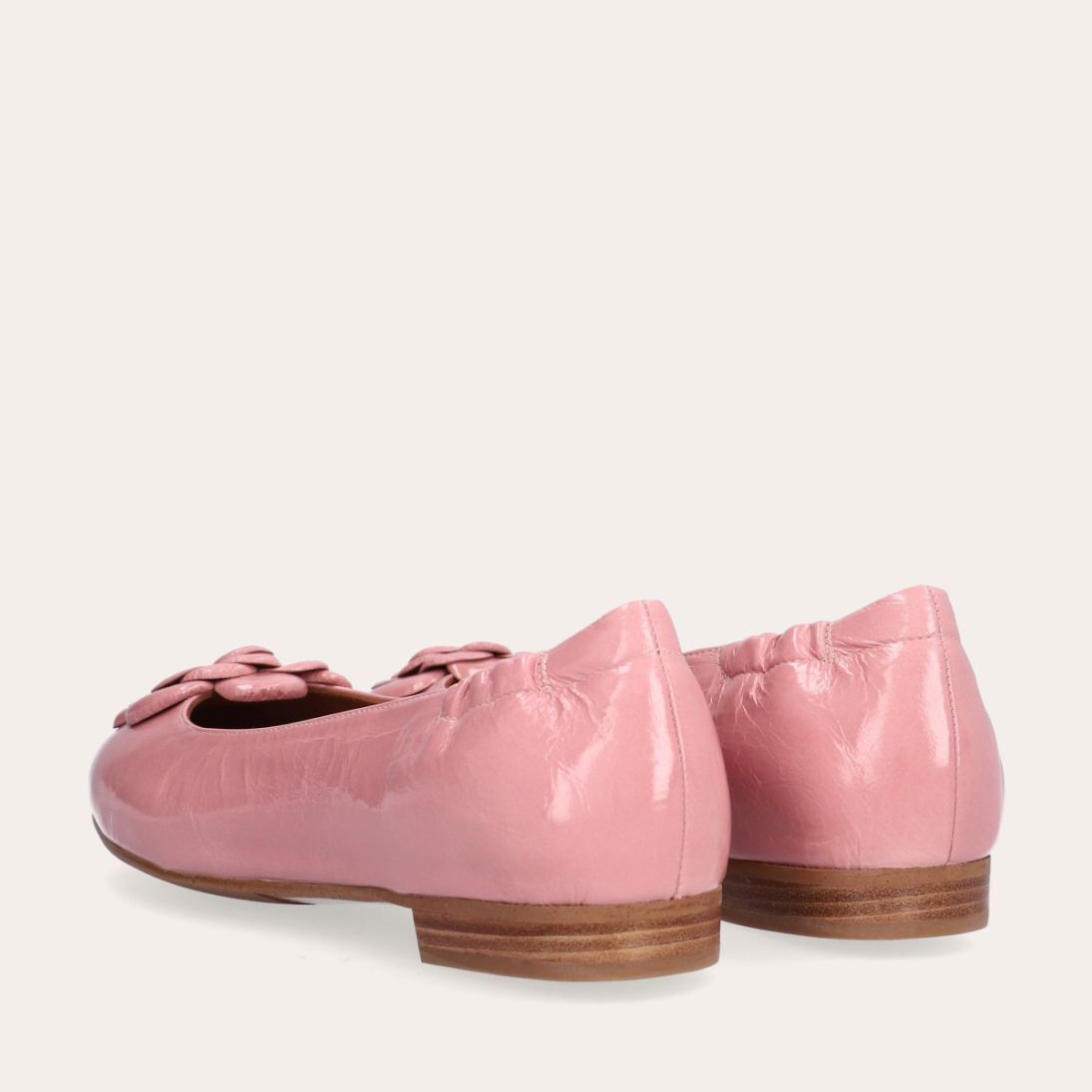 Håndlavet ballerina udført i lyserødt lakeret skind med rund tå. Foran er ballerinaen pyntet med en elegant blomst, også udført i lyserødt lakeret skind. Ballerinaen har en elastisk hælkappe bagtil, der sikrer en optimal komfort.