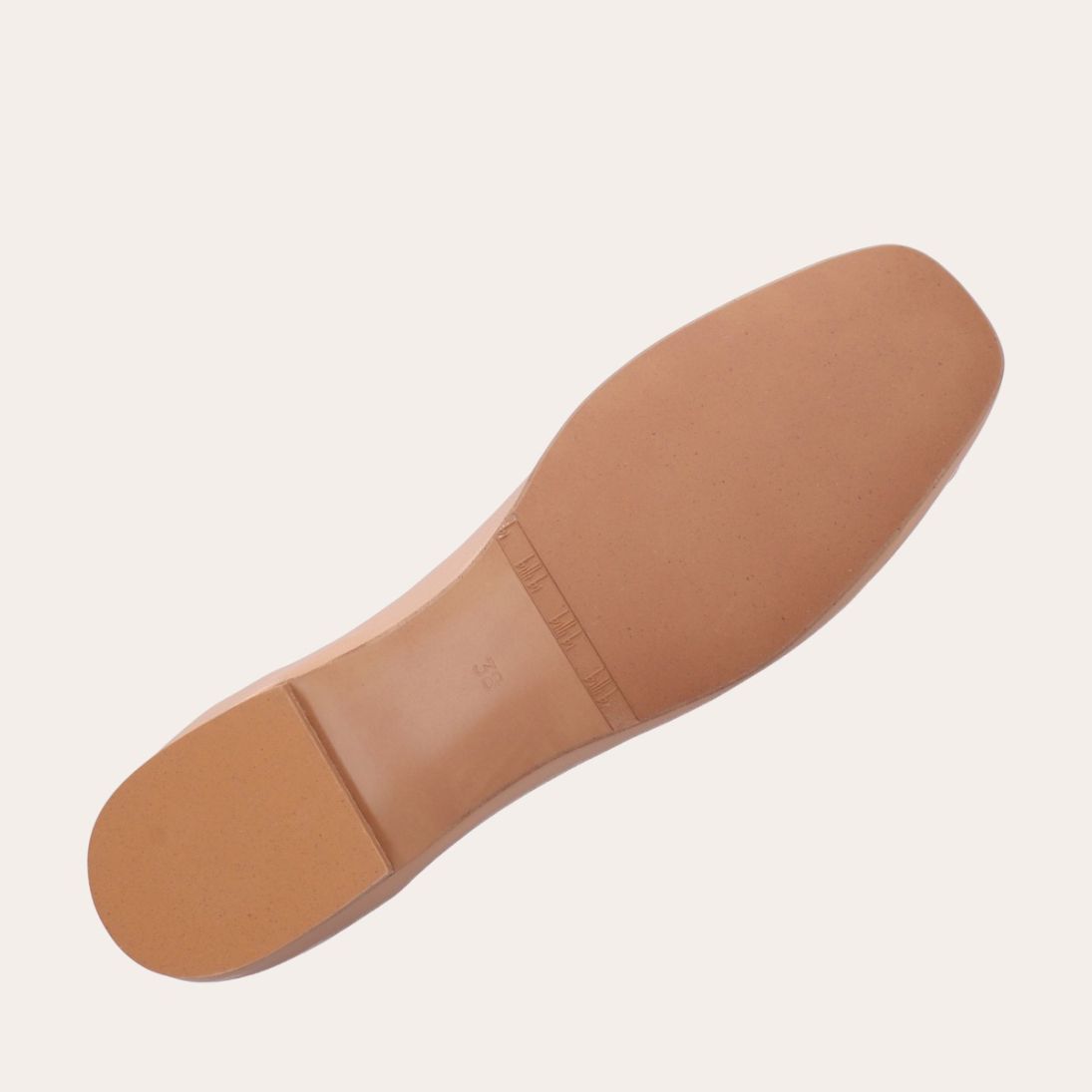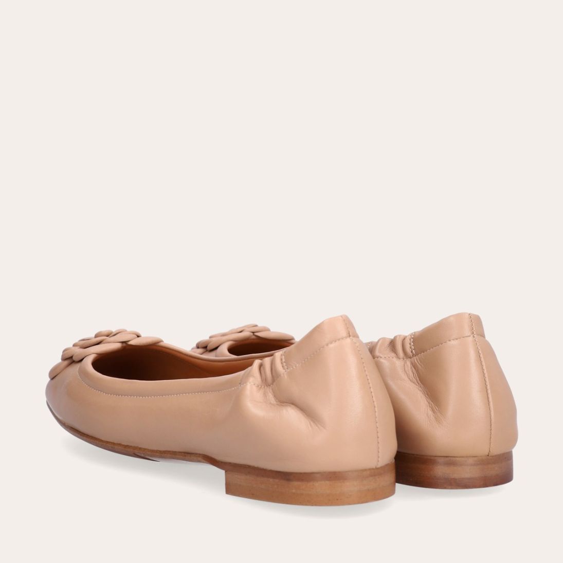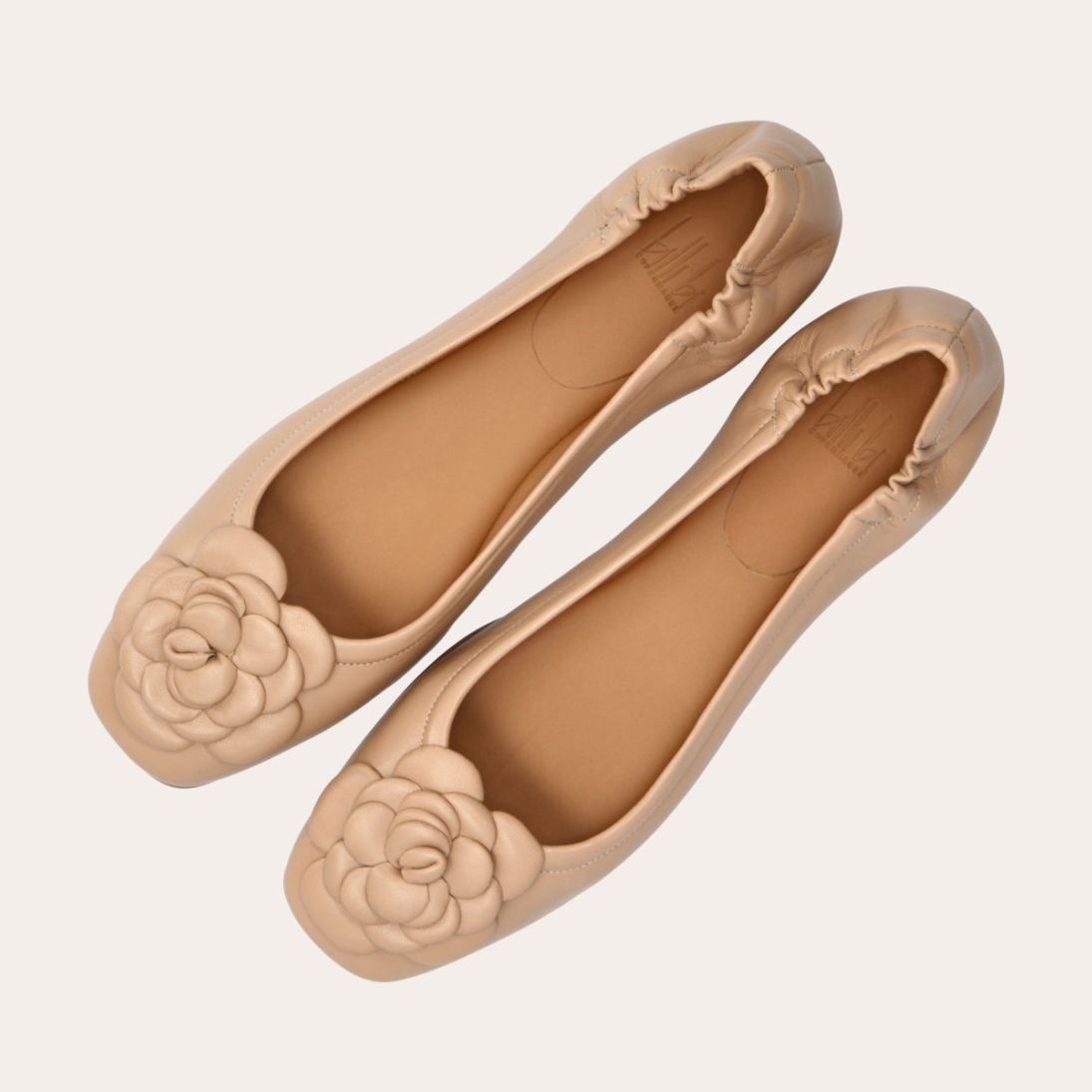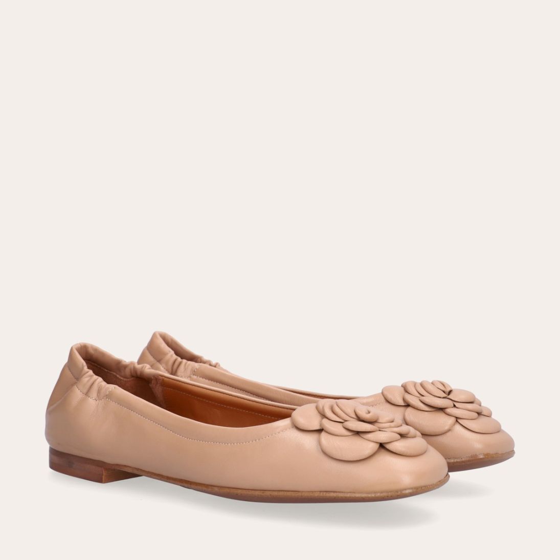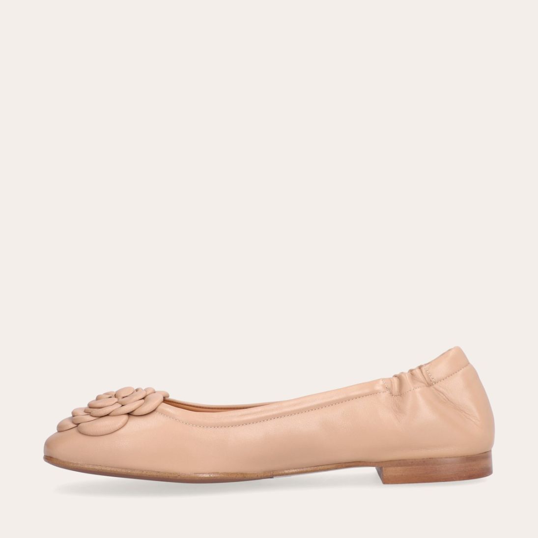 Håndlavet ballerina udført i beige glat skind med firkantet tå. Foran er ballerinaen pyntet med en elegant blomst, også udført i beige glat. Ballerinaen har en elastisk hælkappe bagtil, der sikrer en optimal komfort.