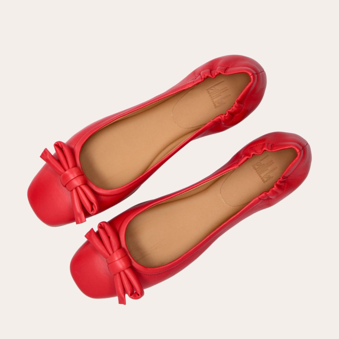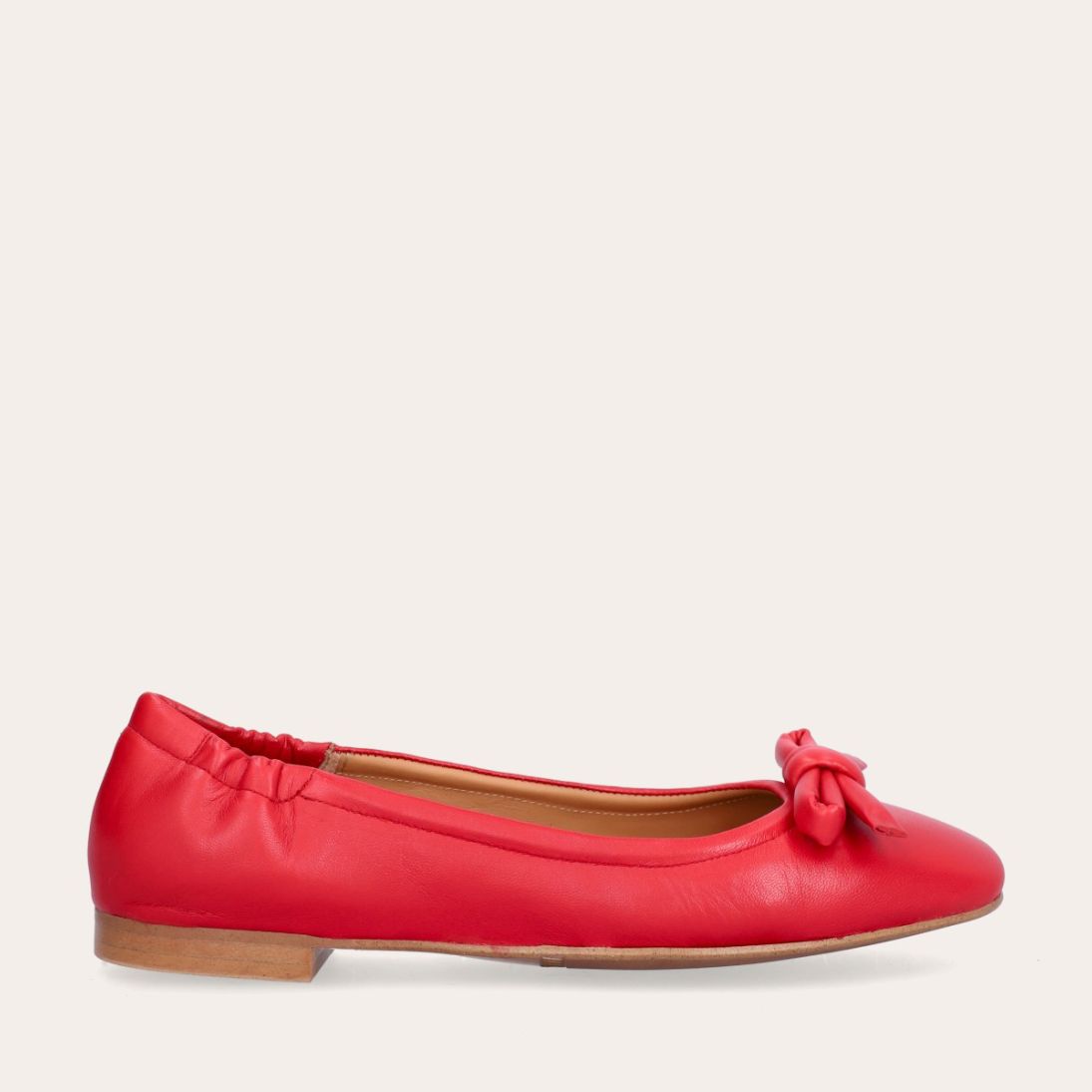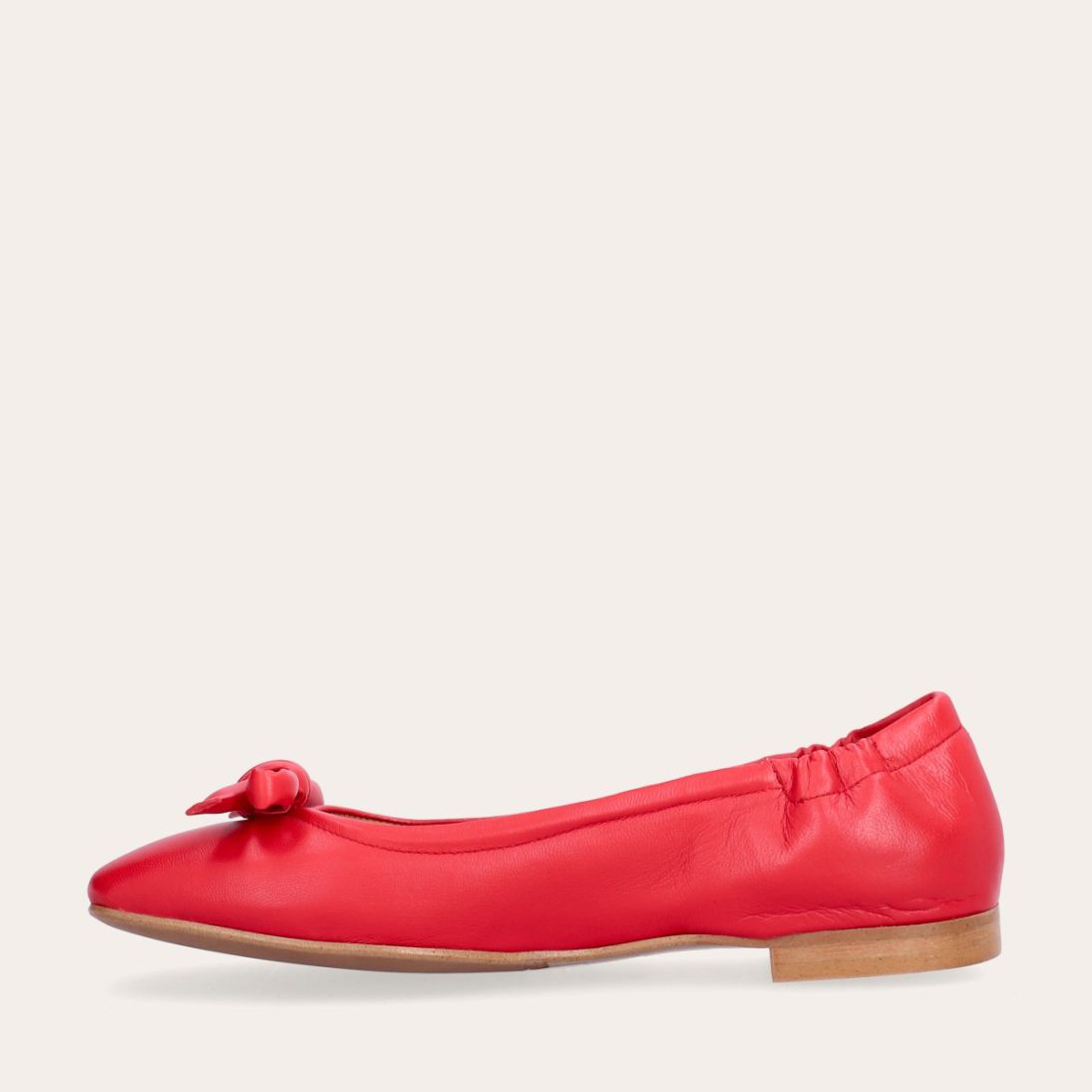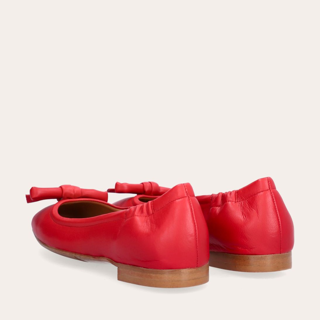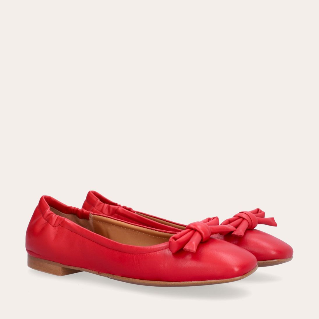 Håndlavet ballerina, udført i rødt glat skind med firkantet tå. Ballerinaen er dekoreret med en elegant tyk sløjfe i skind foran. Ballerinaen har en elastisk hælkappe bagtil, der sikrer en optimal komfort.
