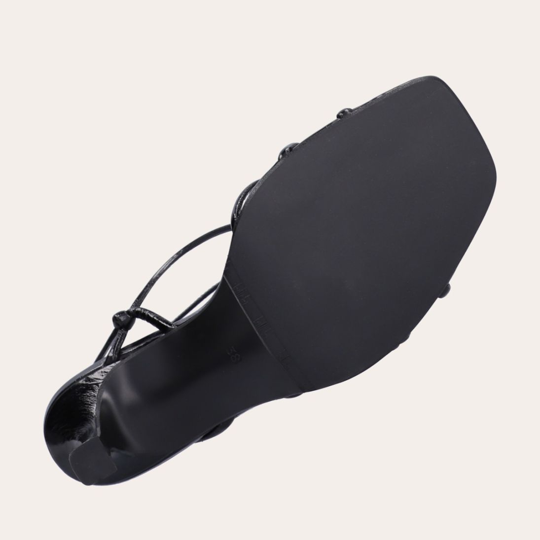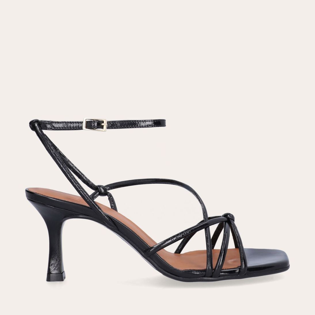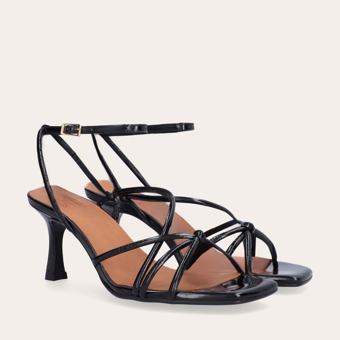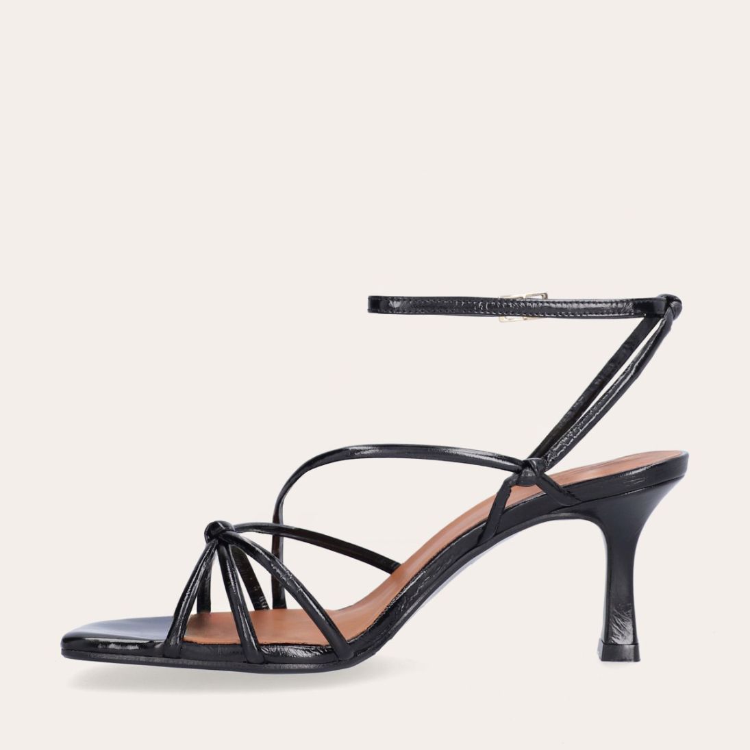 Håndlavet sandal på hæl, udført i sort lakeret skind med firkantet tå og en høj skulpturel hæl. Sandalen har tynde remme der krydser forfoden med knude detalje og en justerbar ankelrem som lukkes med et guldfarvet spænde.