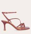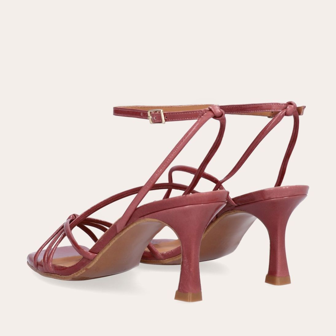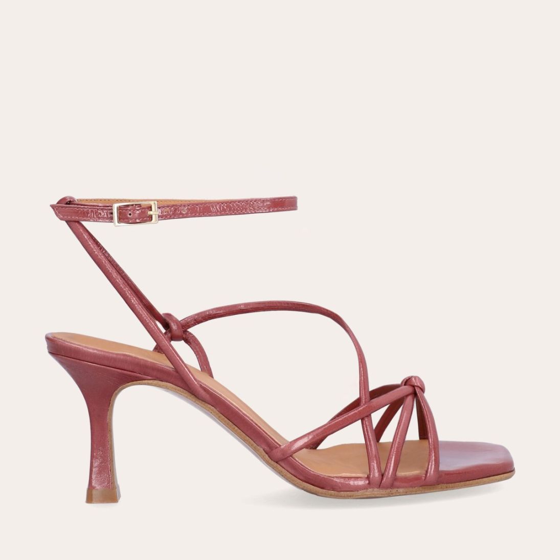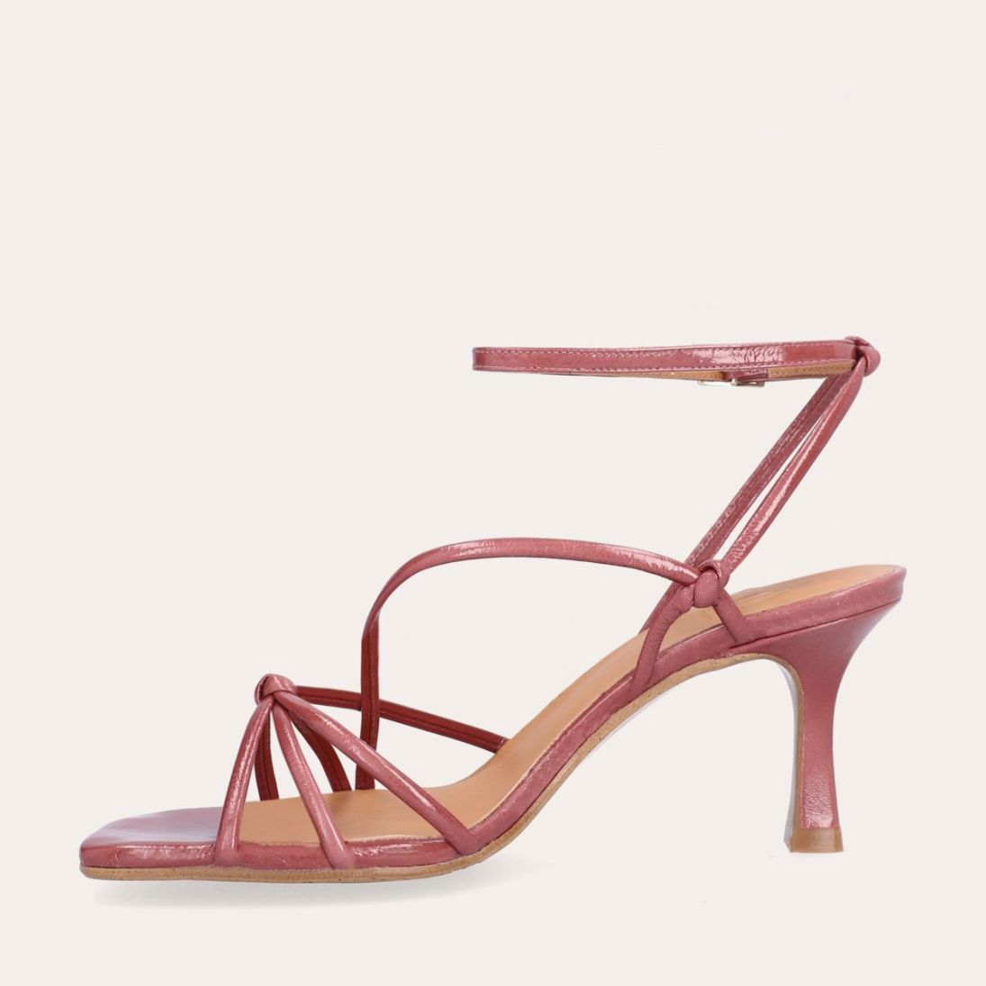 Håndlavet sandal på hæl, udført i en gammelrosa-farvet lakeret skind med firkantet tå og en høj skulpturel hæl. Sandalen har tynde remme der krydser forfoden med knude detalje og en justerbar ankelrem som lukkes med et guldfarvet spænde.