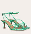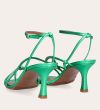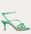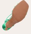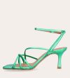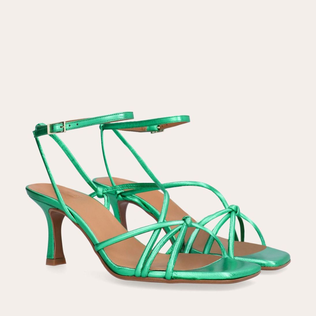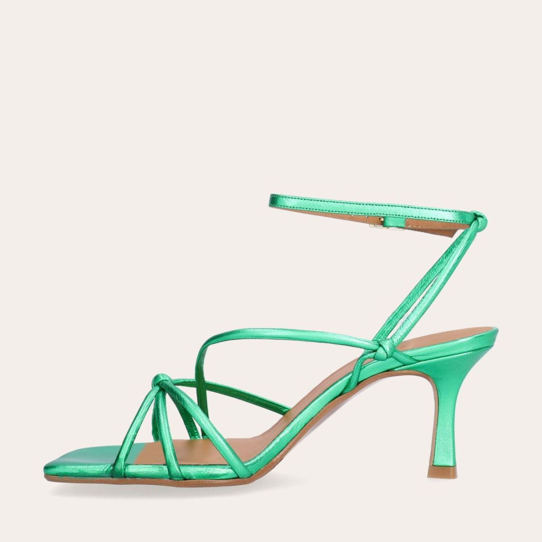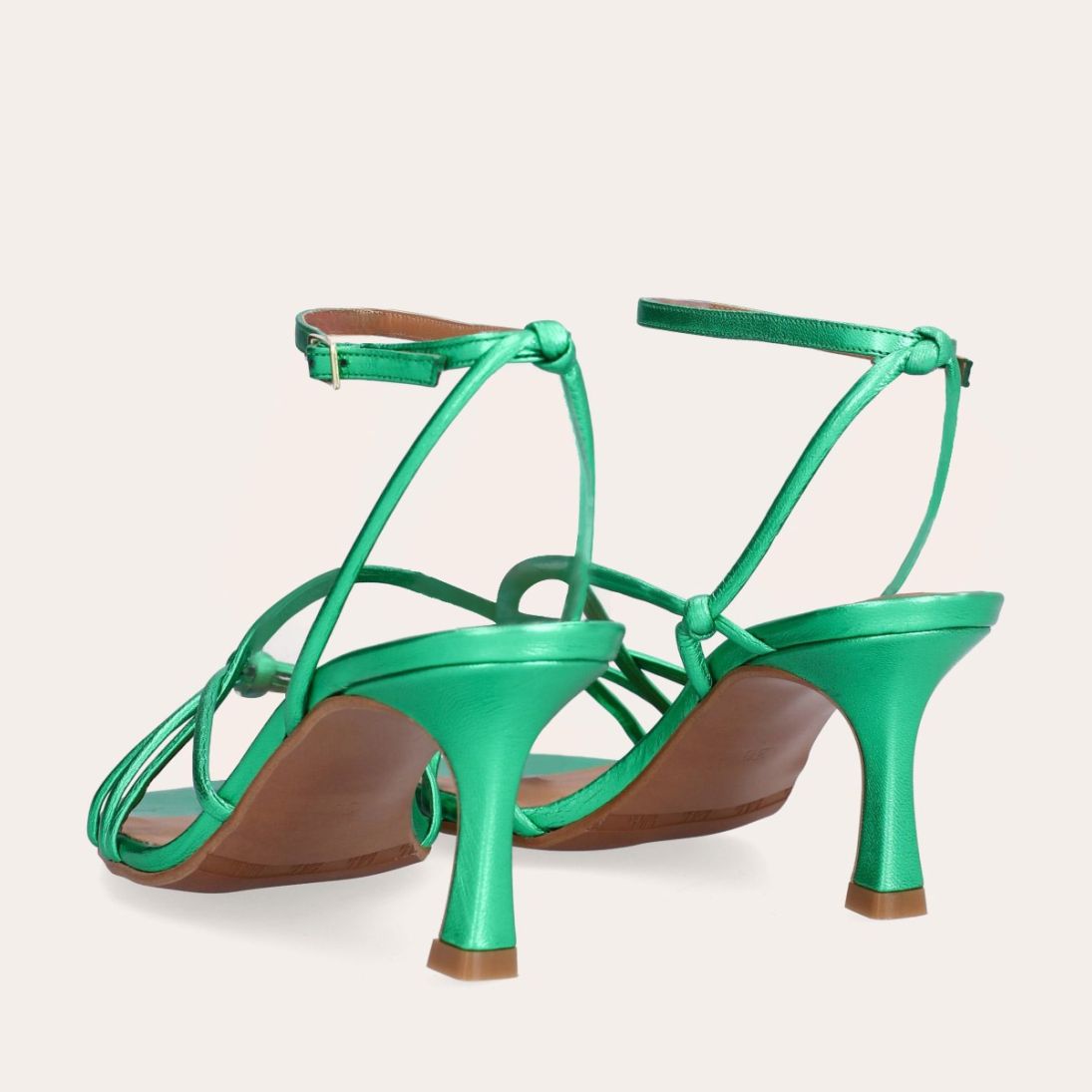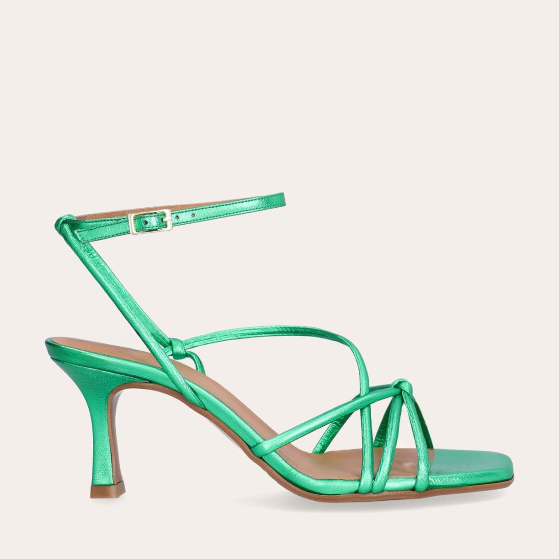 Håndlavet sandal på hæl, udført i grønt mettallic glat skind med firkantet tå og en høj skulpturel hæl. Sandalen har tynde remme der krydser forfoden med knude detalje og en justerbar ankelrem som lukkes med et gyldent spænde.