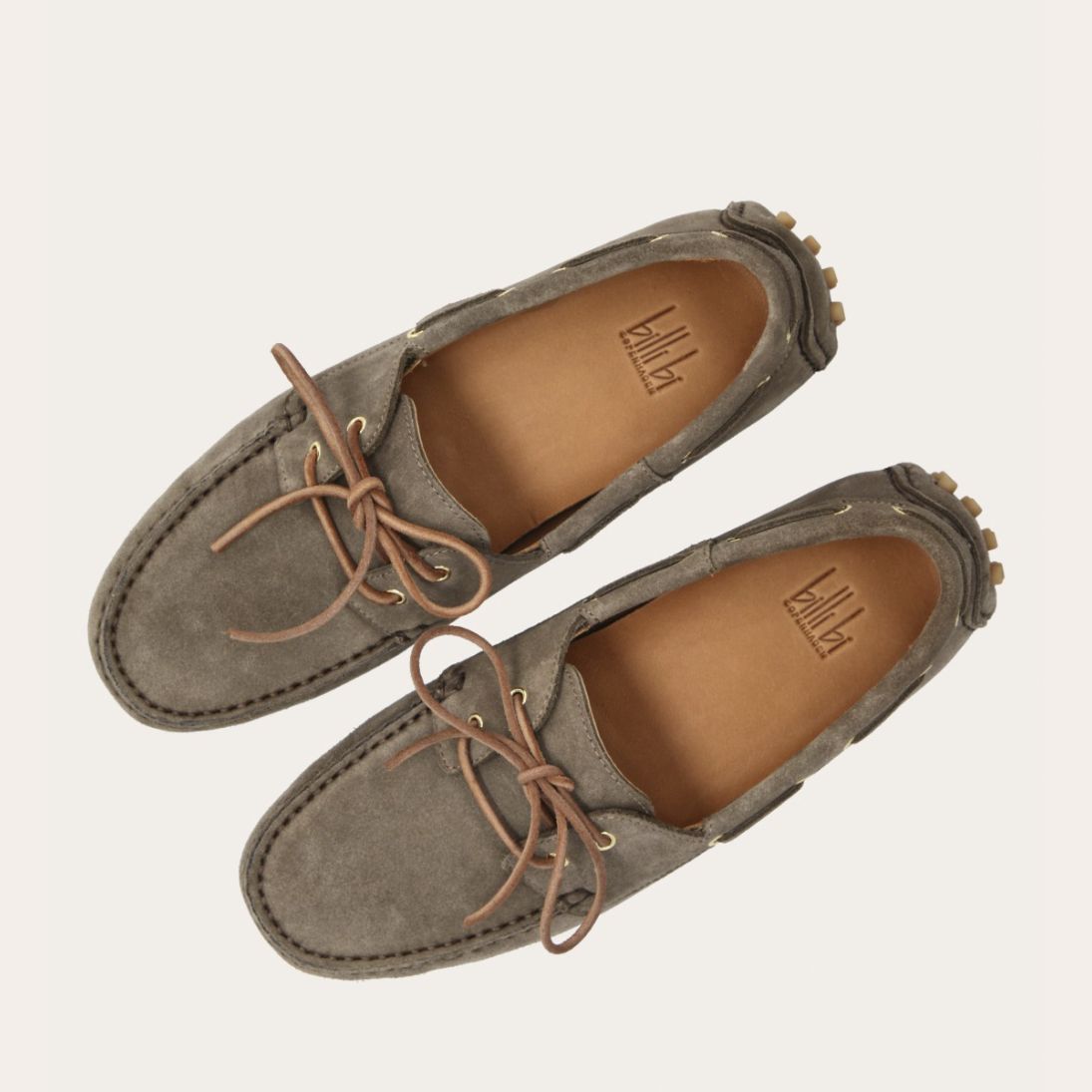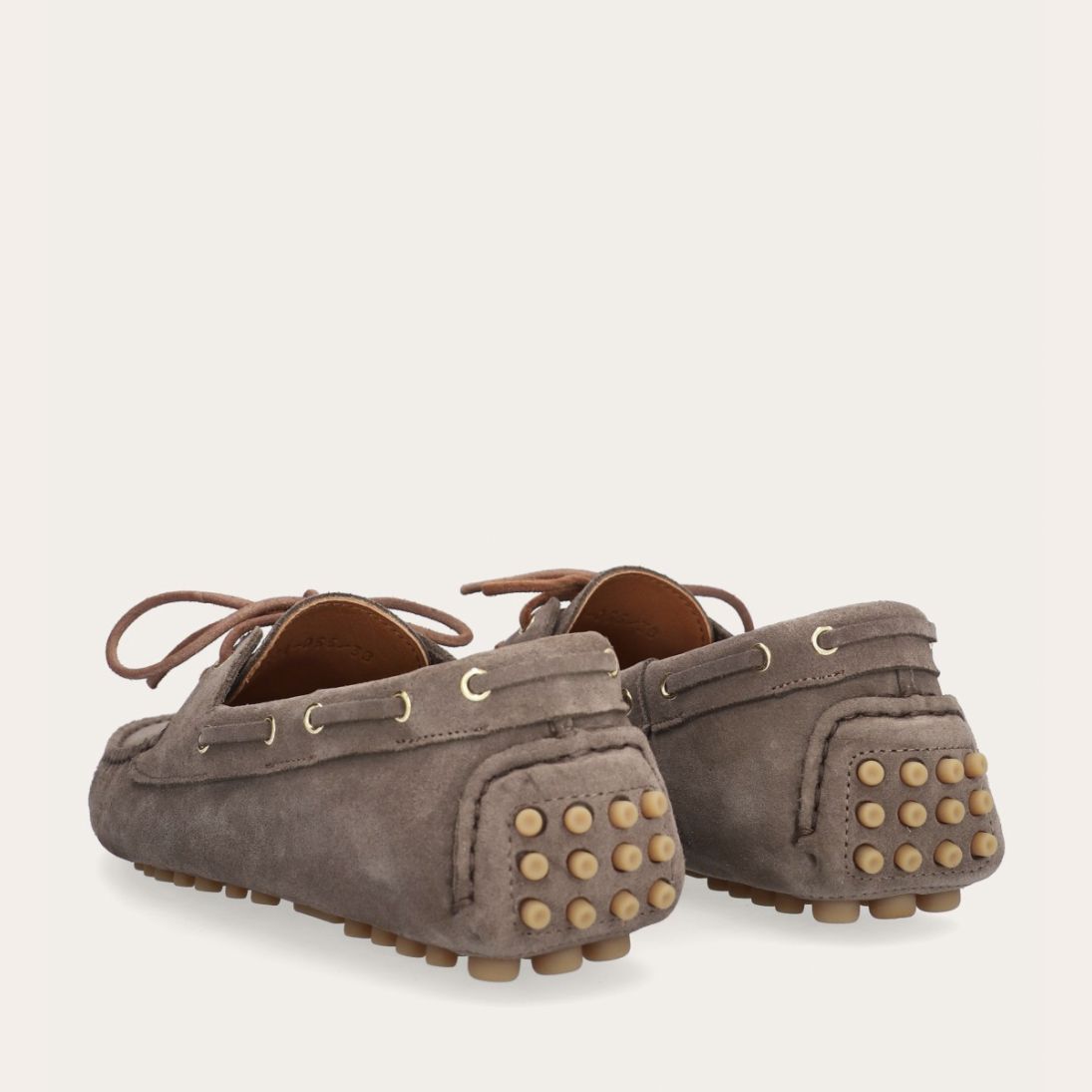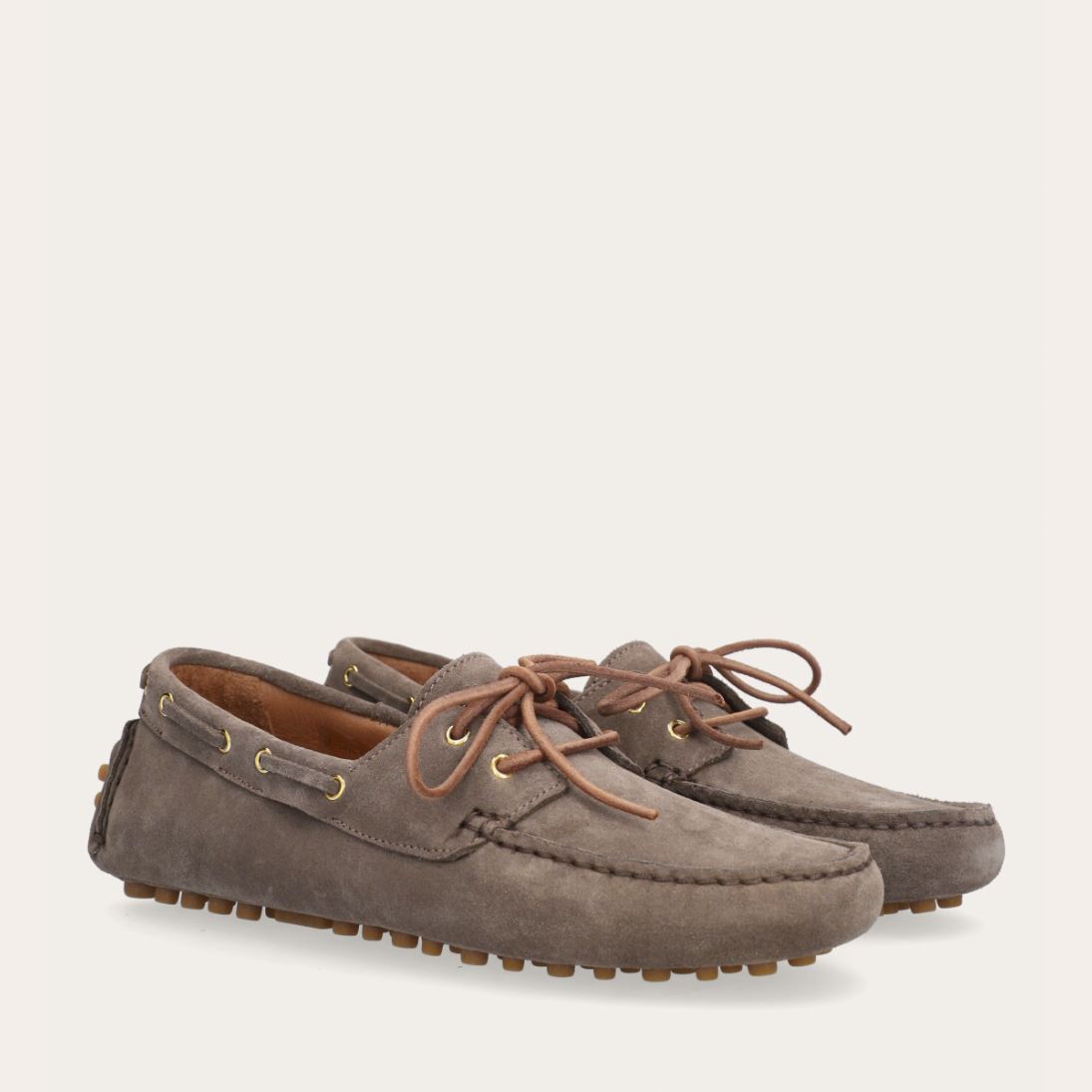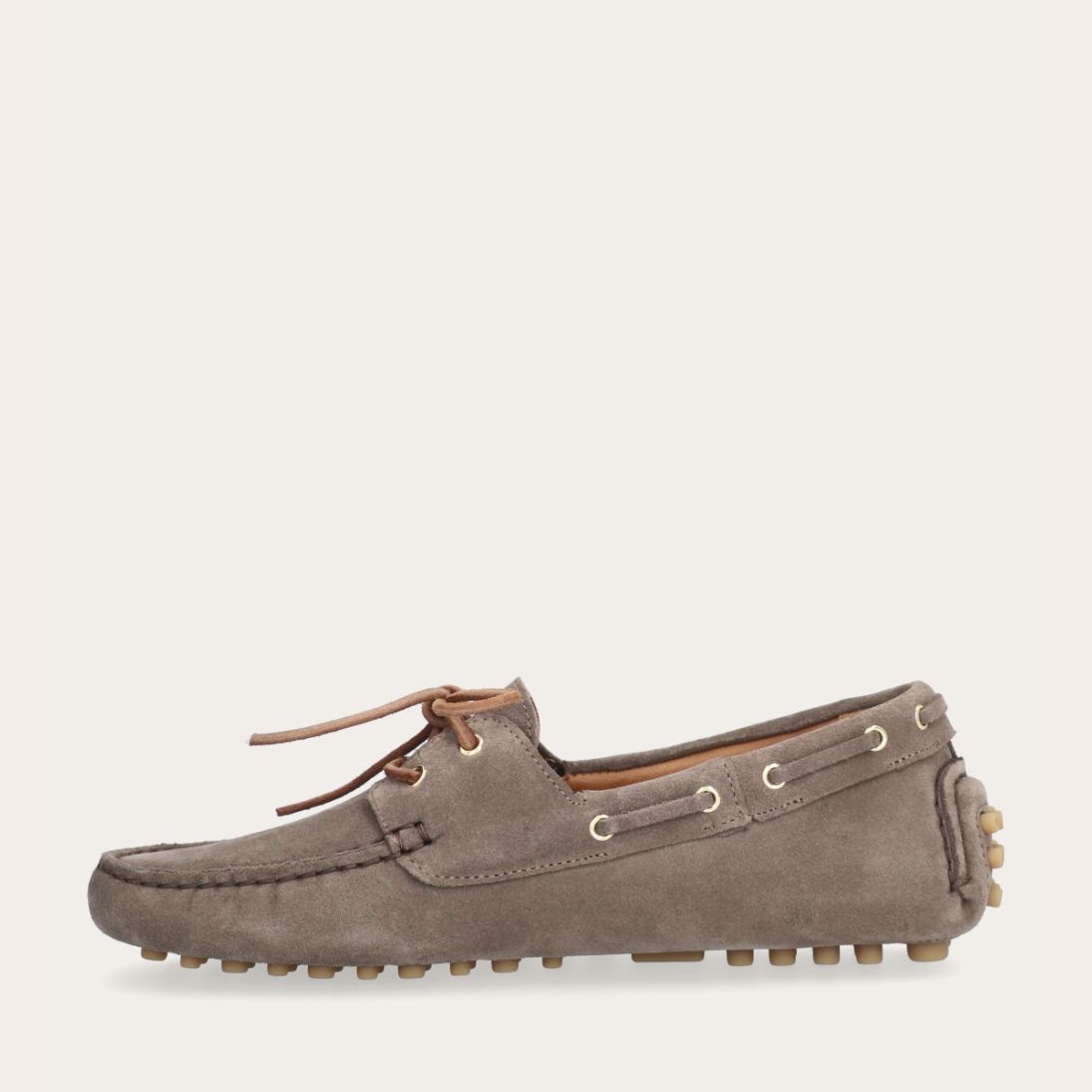 Håndlavet sejlersko udført i taupe ruskind. Sejlerskoen er med snørebånd og har en blød gummisål. Bemærk venligst, at sålen på denne sko ikke er beregnet til vådt vejr, da sålen delvist er udført i ruskind.
