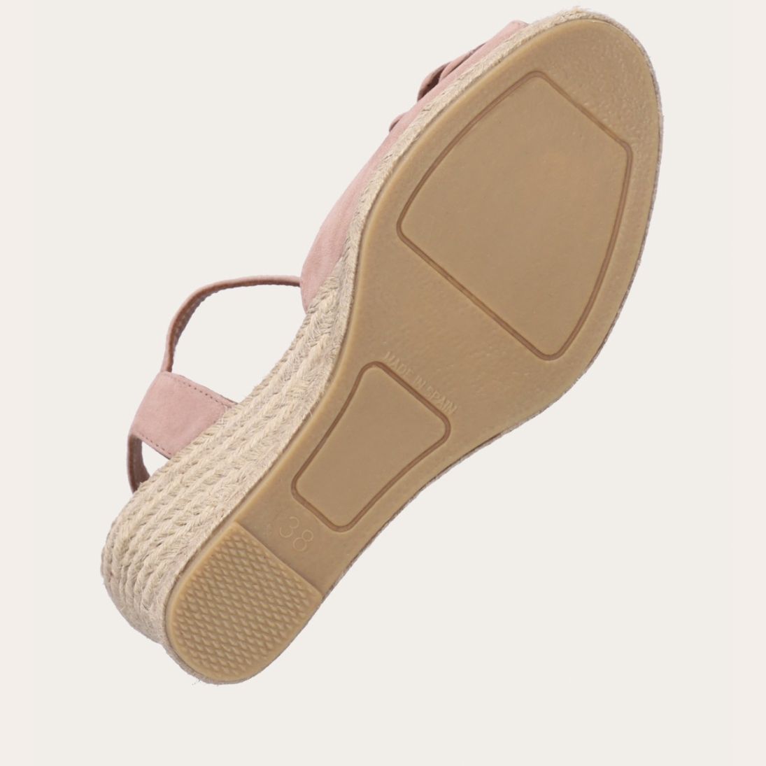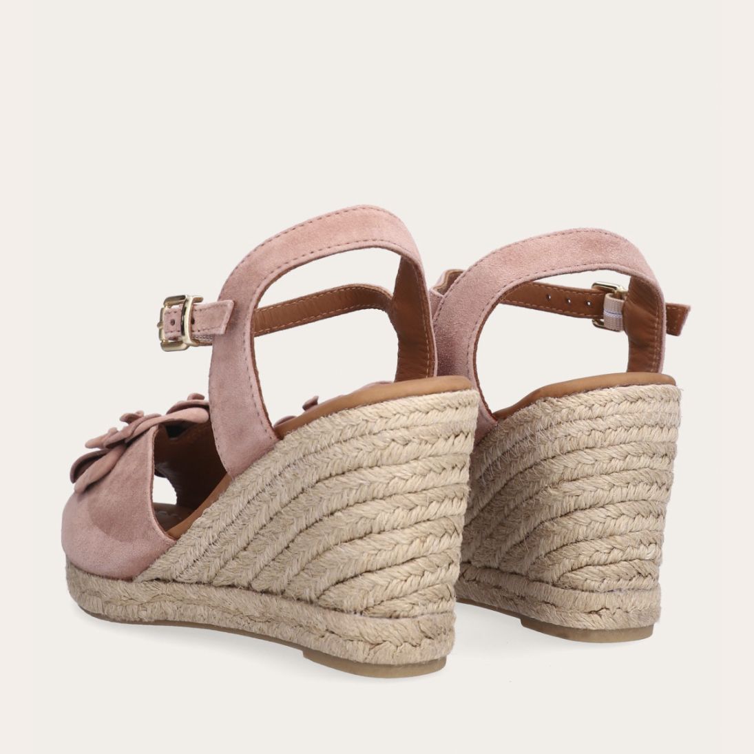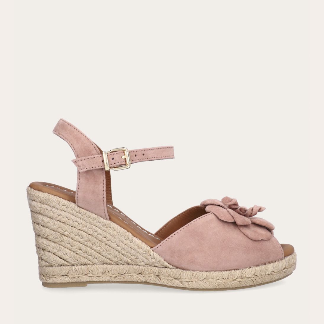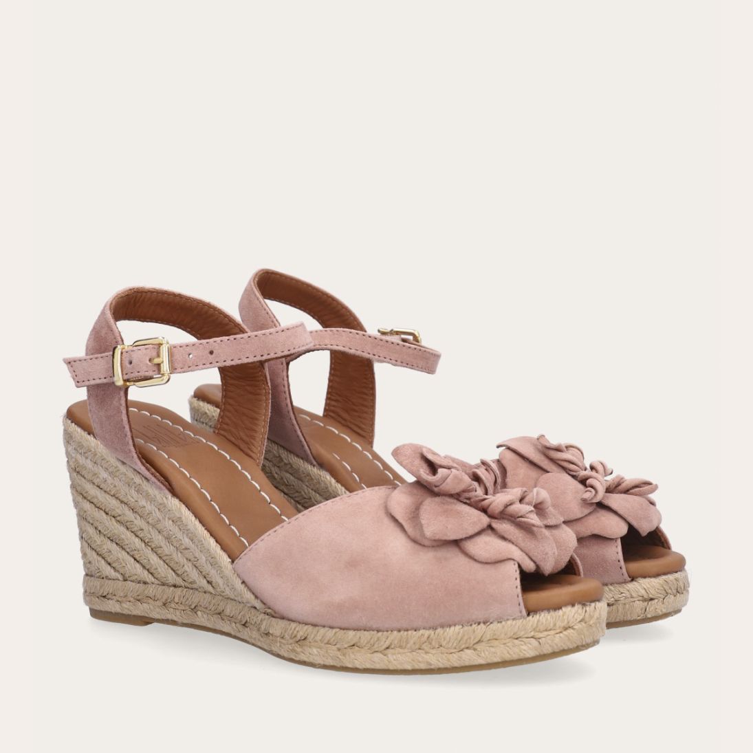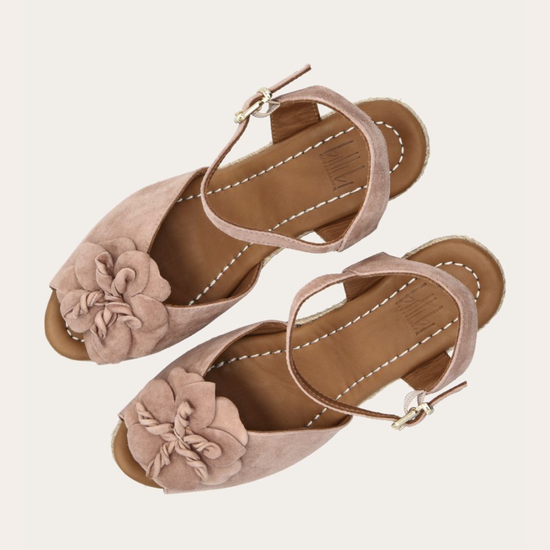 Håndlavet kilesandal med høj hæl, udført i lyserødt ruskind med rund tå. Foran er sandalen dekoreret med en blomst, som også er udført i lyserødt ruskind. Remmen omkring anklen lukkes med et firkantet gyldent spænde.