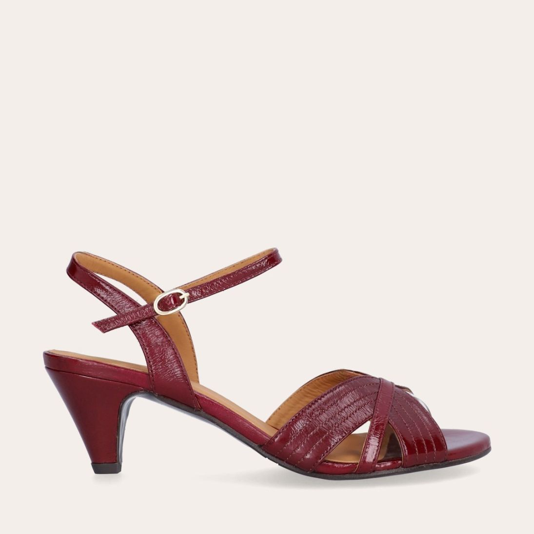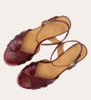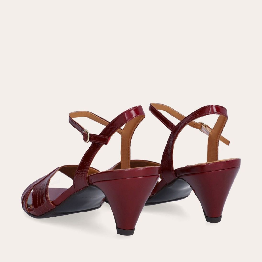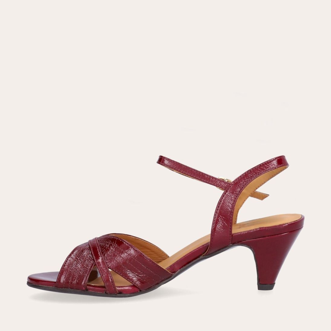 Håndlavet sandal på hæl, udført i mørkerødt lakeret skind med afrundet, åben tå. Sandalen har et elegant formet forstykke og en diskret udskæring i siden for et feminint udtryk. Den justerbare ankelrem lukkes med et gyldent spænde. Designet med blokhæl for en raffineret finish.