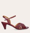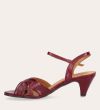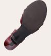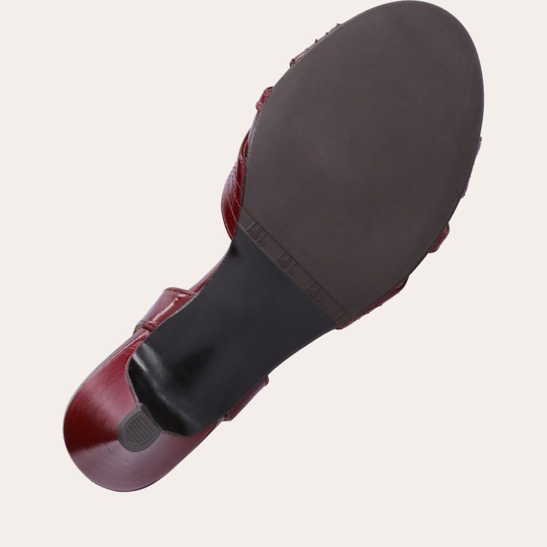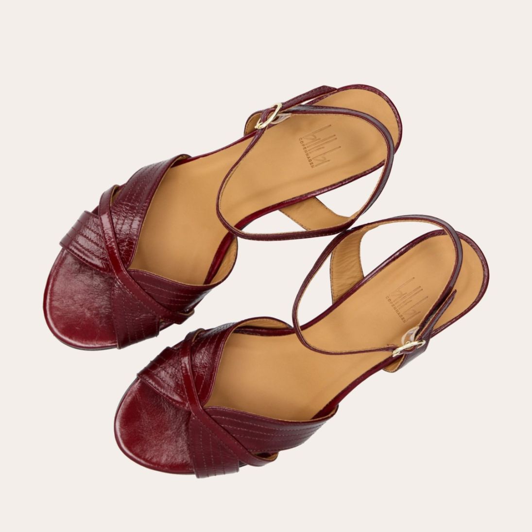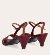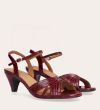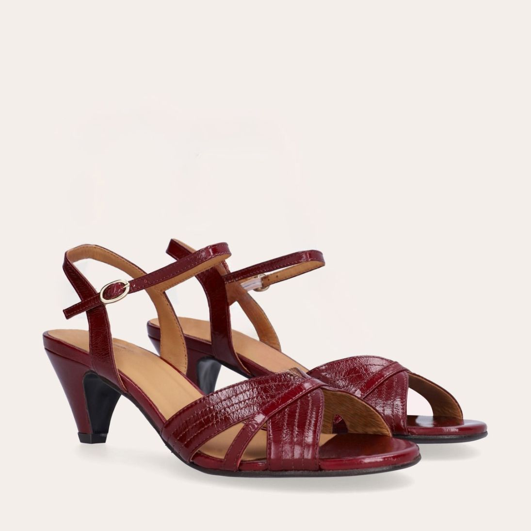 Håndlavet sandal på hæl, udført i mørkerødt lakeret skind med afrundet, åben tå. Sandalen har et elegant formet forstykke og en diskret udskæring i siden for et feminint udtryk. Den justerbare ankelrem lukkes med et gyldent spænde. Designet med blokhæl for en raffineret finish.