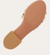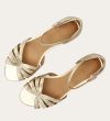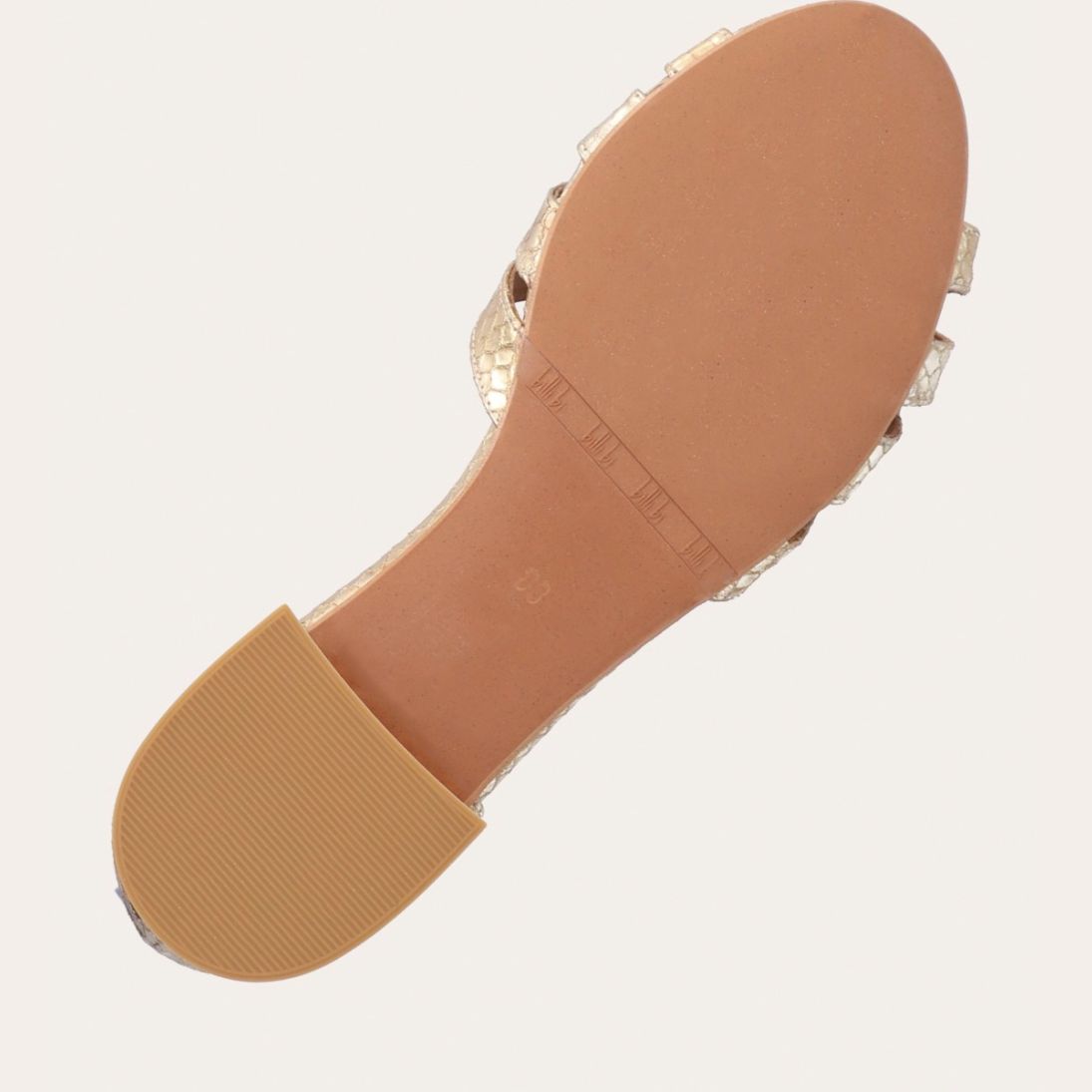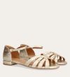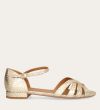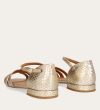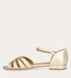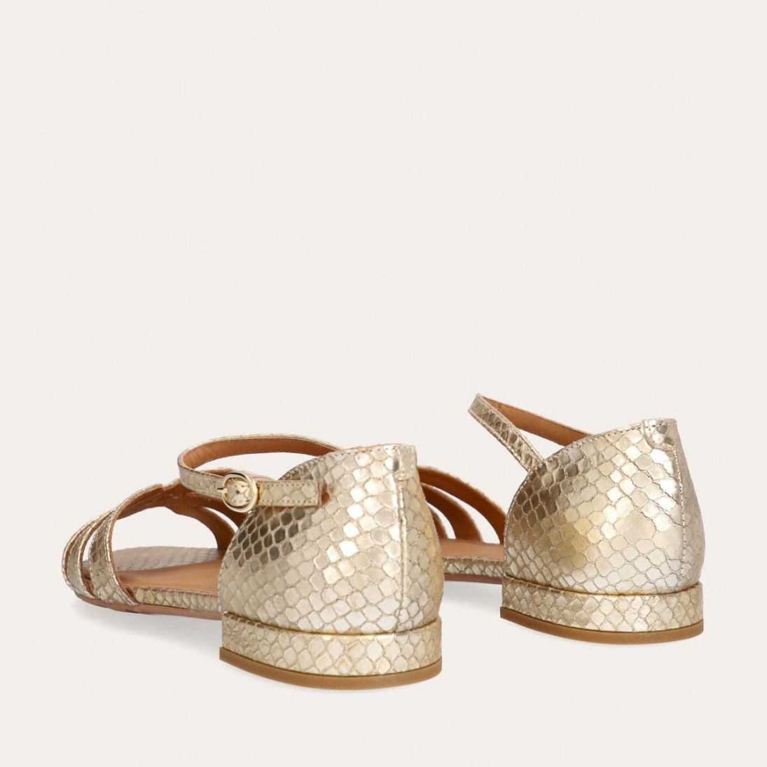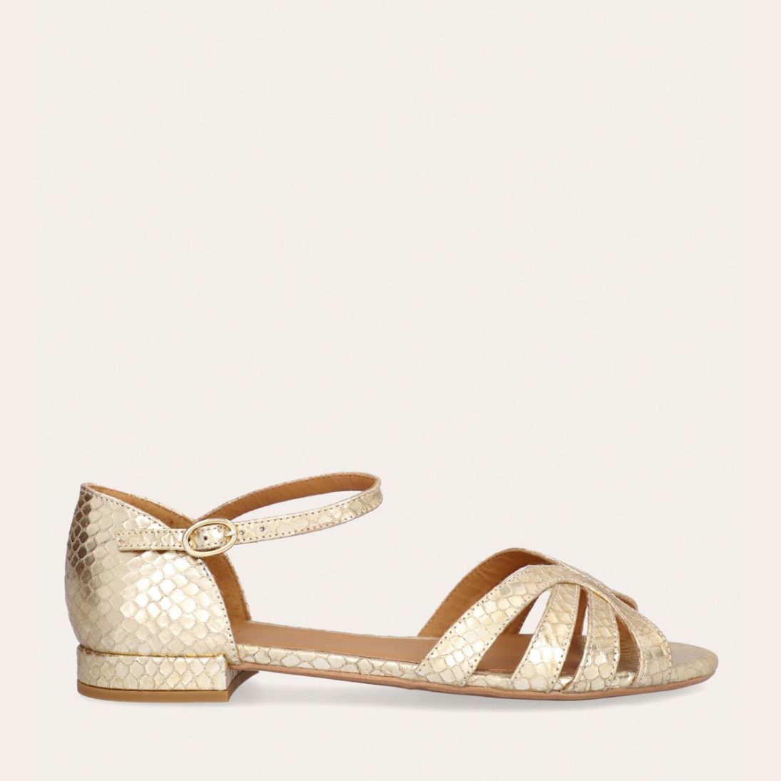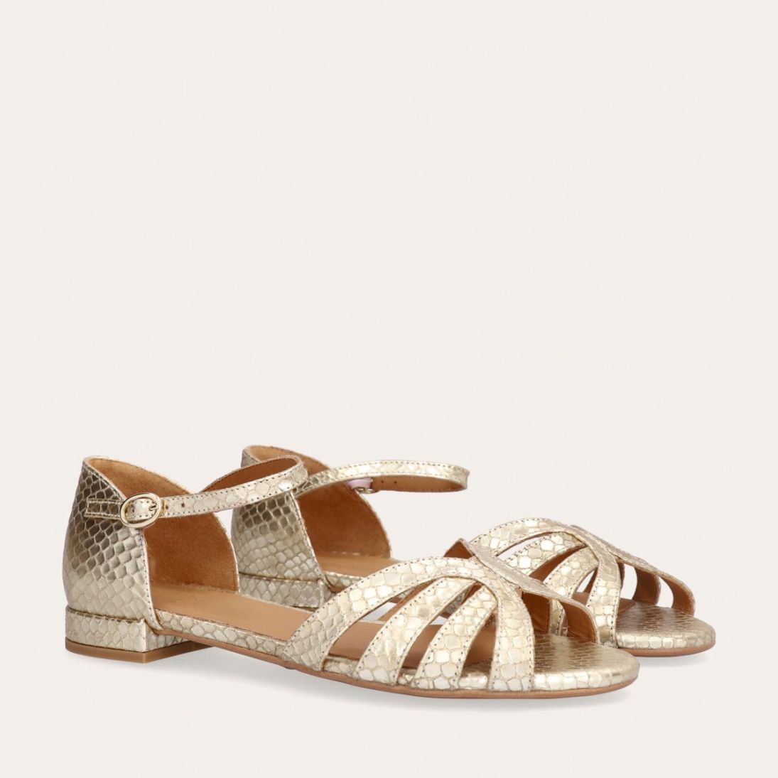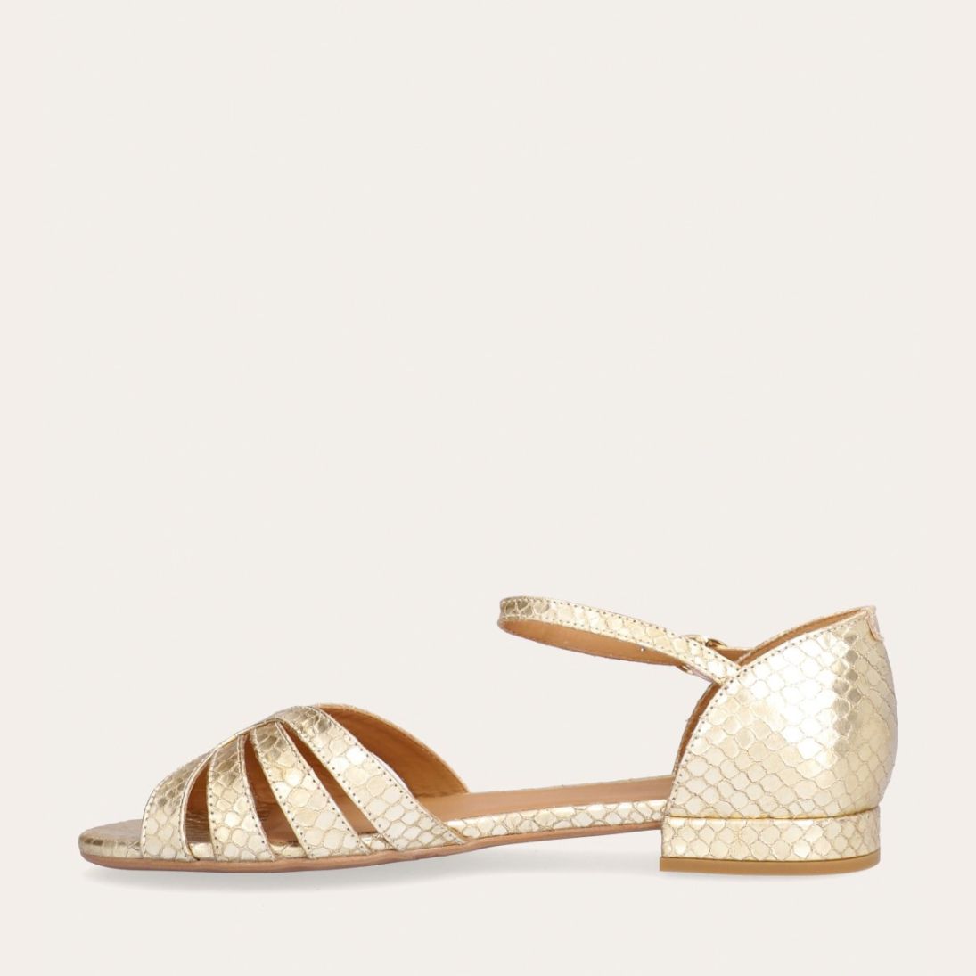 Håndlavet flad sandal, udført i guldfarvet præget skind med en afrundet, åben tå. Sandalen har et elegant formet forstykke og diskrete udskæringer i siderne for et feminint udtryk. Den justerbare ankelrem lukkes med et gyldent spænde. Designet med lukket hælkappe for en raffineret silhuet.