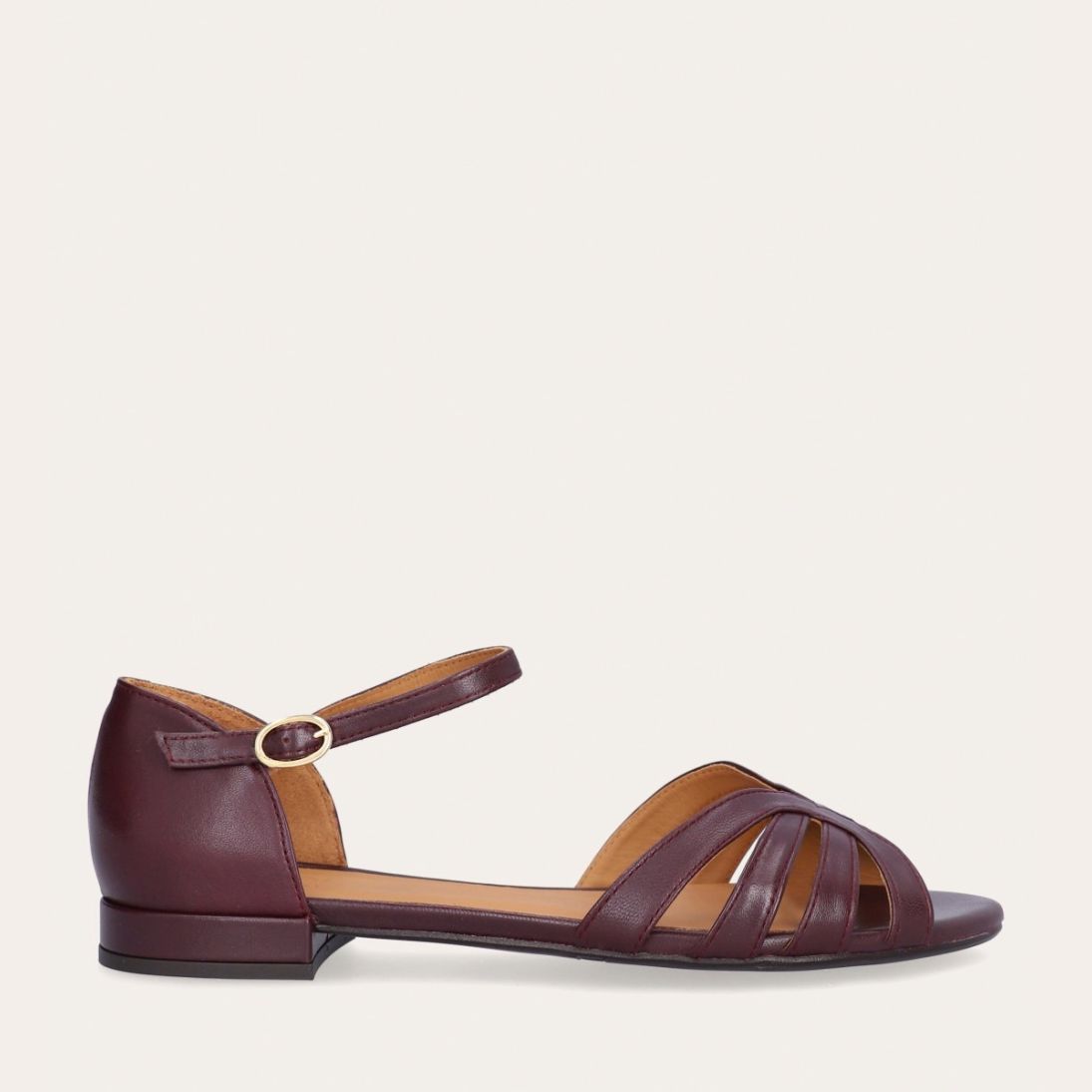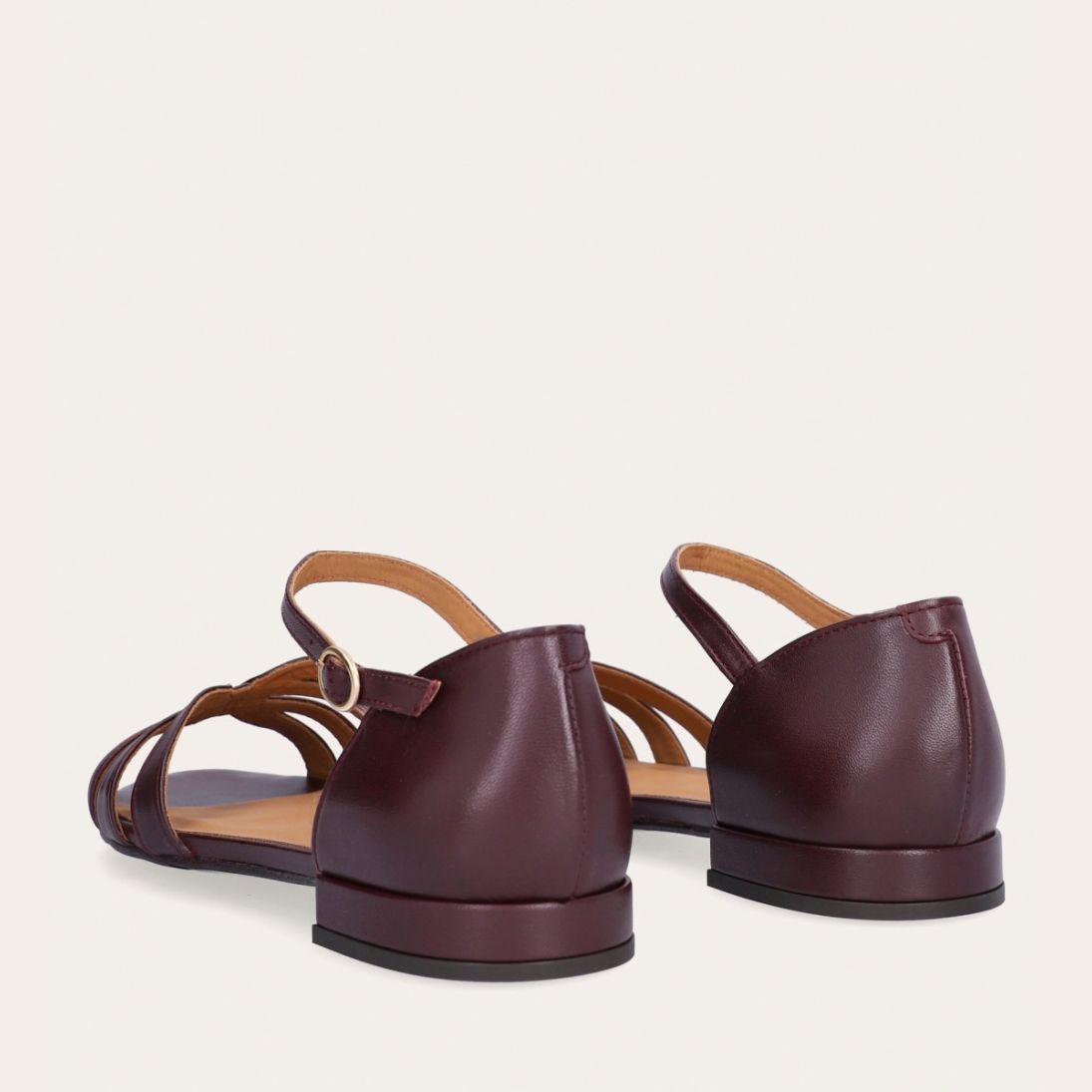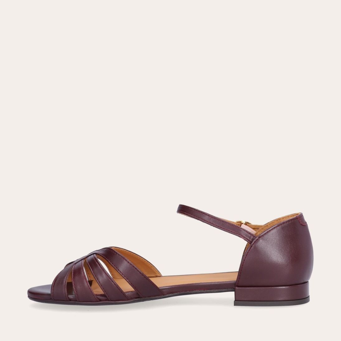 Håndlavet flad sandal, udført i aubergine-farvet glat skind med en afrundet, åben tå. Sandalen har et elegant formet forstykke og diskrete udskæringer i siderne for et feminint udtryk. Den justerbare ankelrem lukkes med et gyldent spænde. Designet med lukket hælkappe for en raffineret silhuet.
