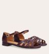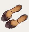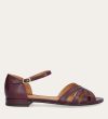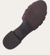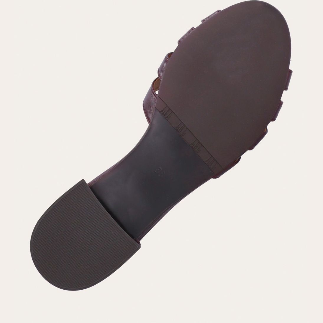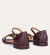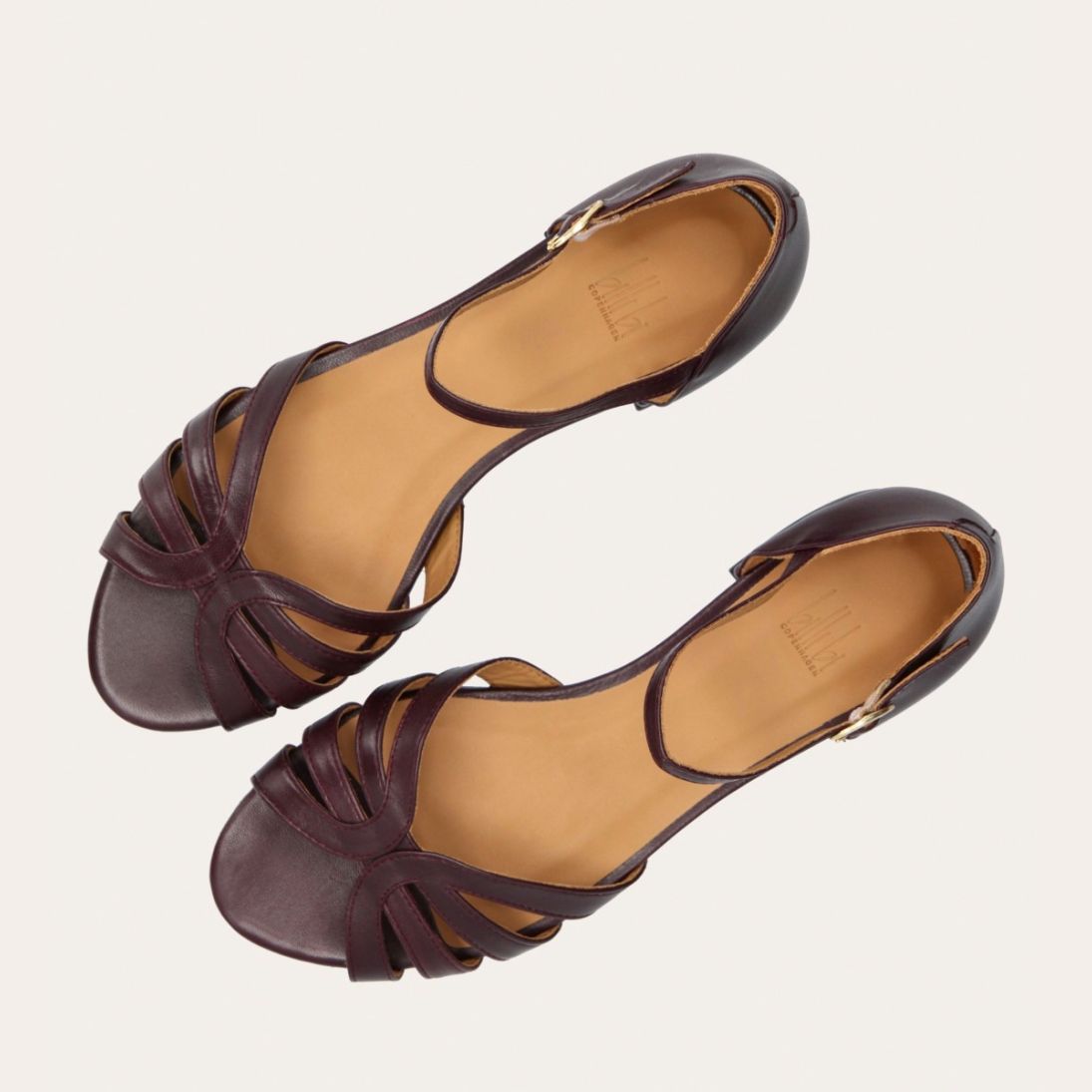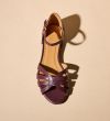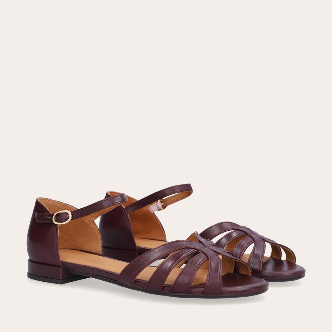Håndlavet flad sandal, udført i aubergine-farvet glat skind med en afrundet, åben tå. Sandalen har et elegant formet forstykke og diskrete udskæringer i siderne for et feminint udtryk. Den justerbare ankelrem lukkes med et gyldent spænde. Designet med lukket hælkappe for en raffineret silhuet.