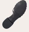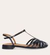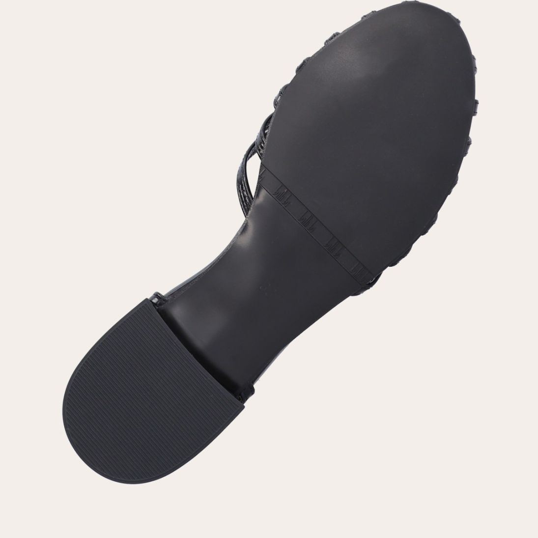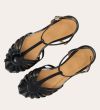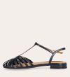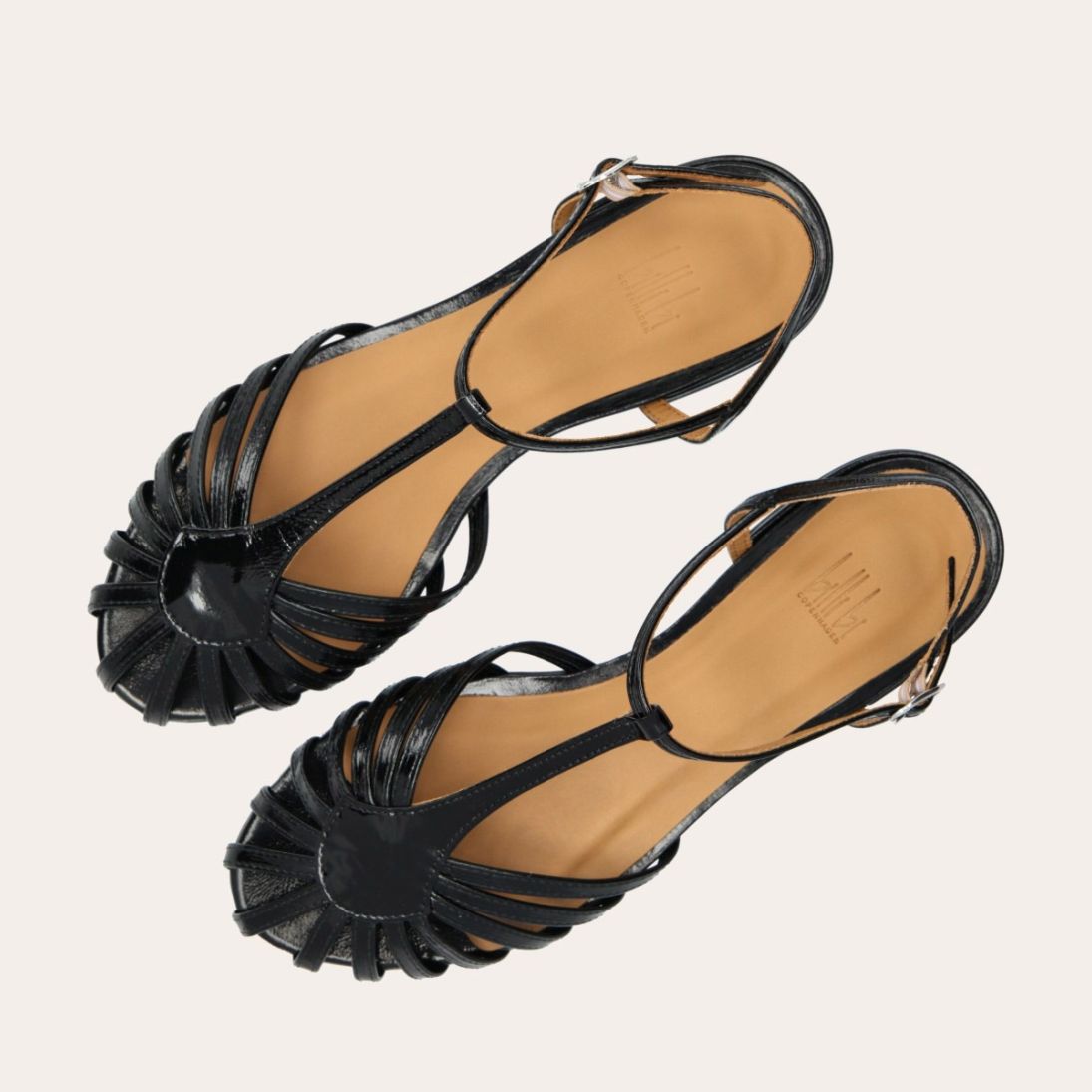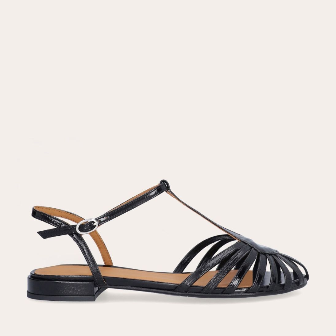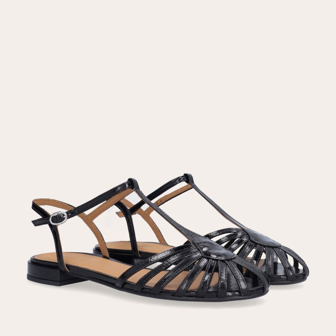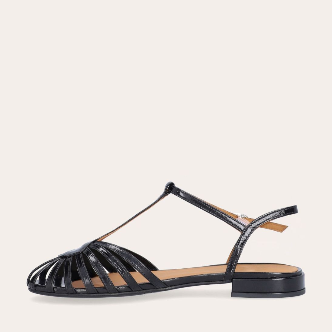 Håndlavet flad sandal, udført i sort lakeret skind med afrundet åben tå. Sandalens front er designet med en T-rem og flere tynde stropper, som skaber en elegant, feminin silhuet. Den justerbare ankelrem lukkes med et sølvfarvet spænde, og sandalen har en lav, flad og åben hæl.