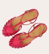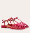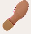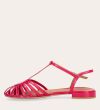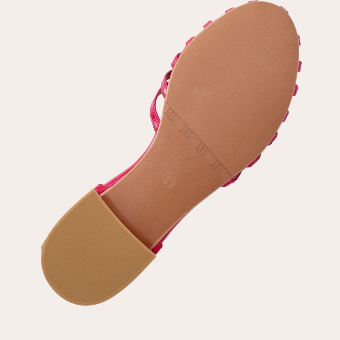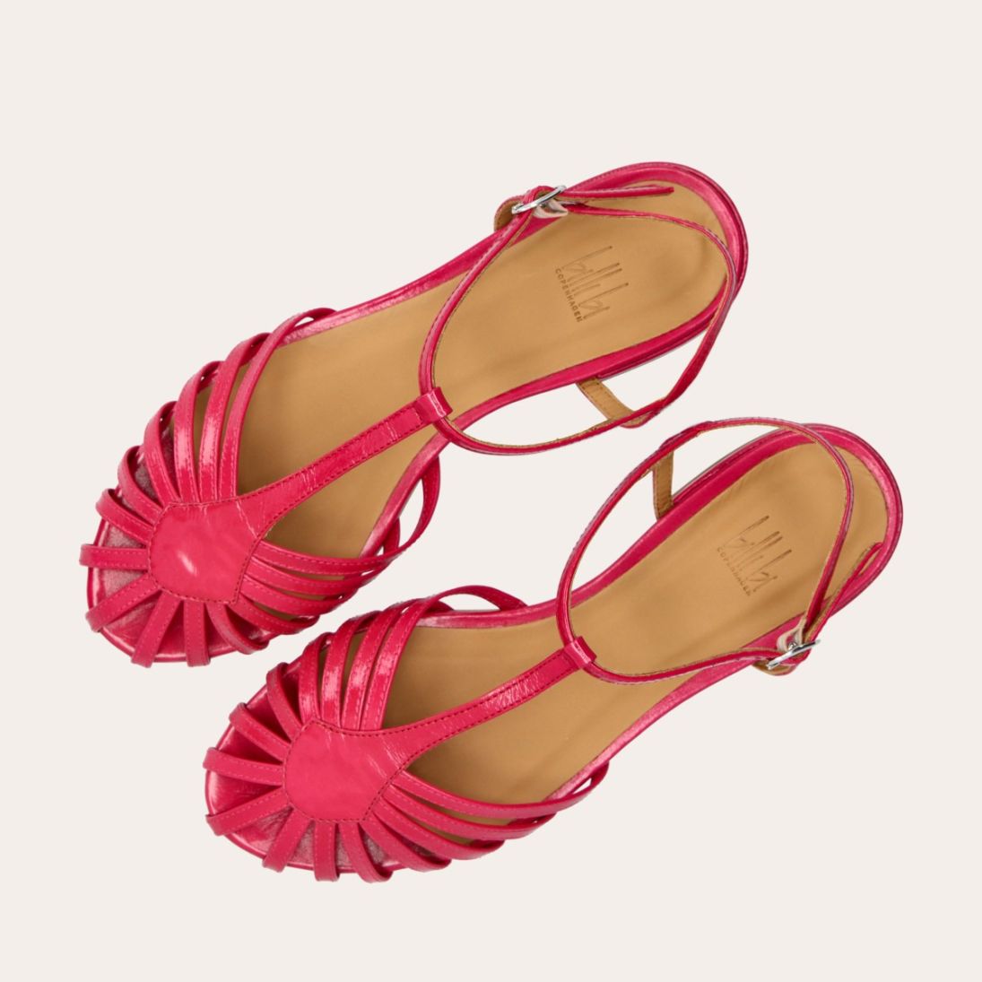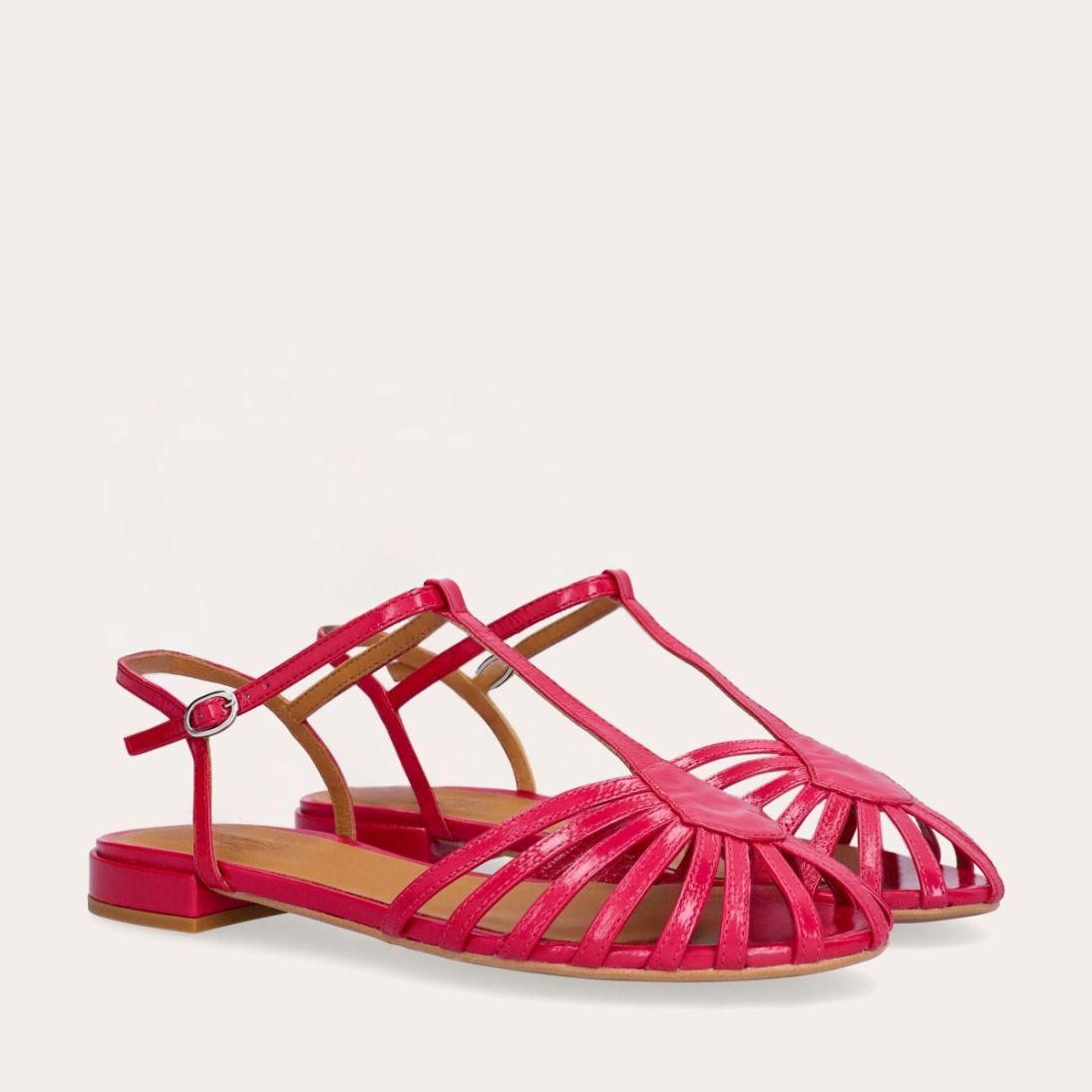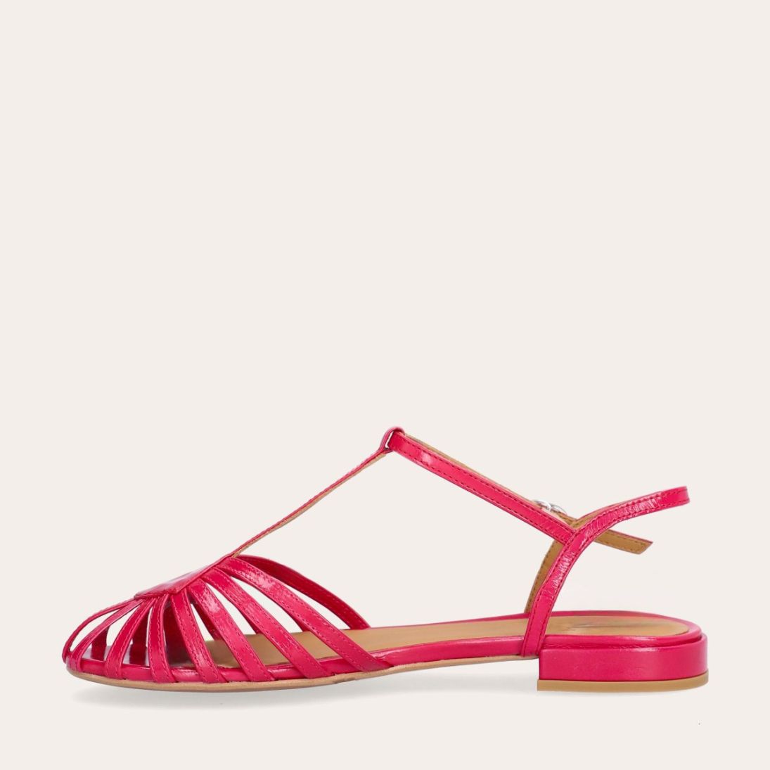 Håndlavet flad sandal, udført i pink lakeret skind med afrundet åben tå. Sandalens front er designet med en T-rem og flere tynde stropper, som skaber en elegant, feminin silhuet. Den justerbare ankelrem lukkes med et sølvfarvet spænde, og sandalen har en lav, flad og åben hæl.