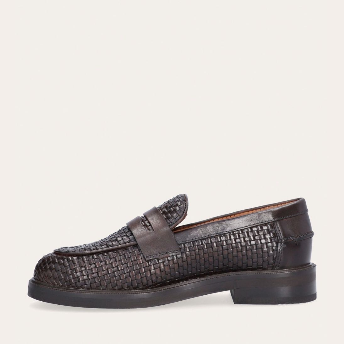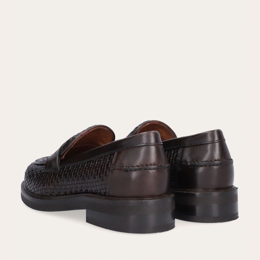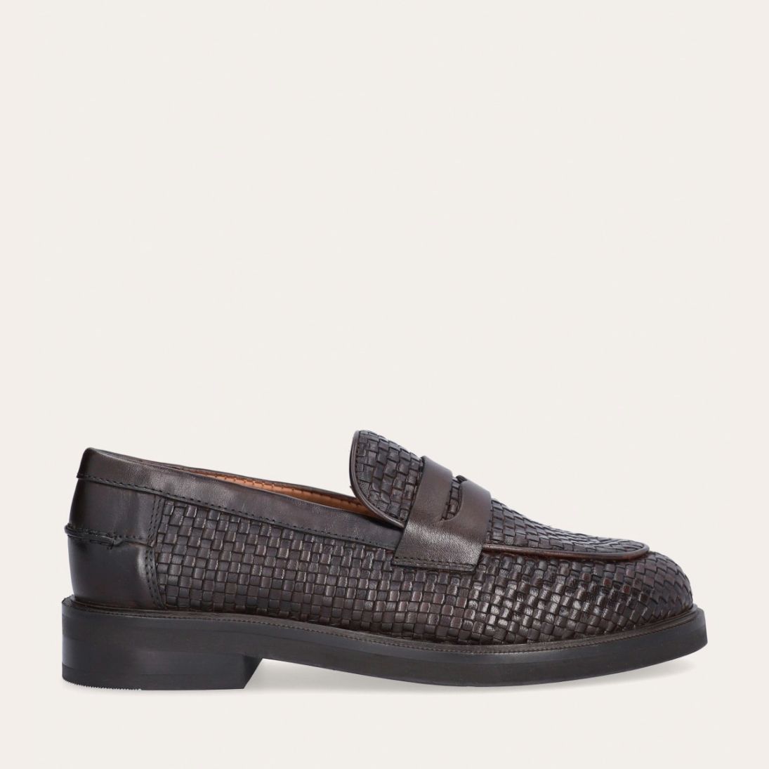 Håndlavet loafer udført i mørkebrunt flettet skind, rund tå og et dekorativt cut-out henover fronten.